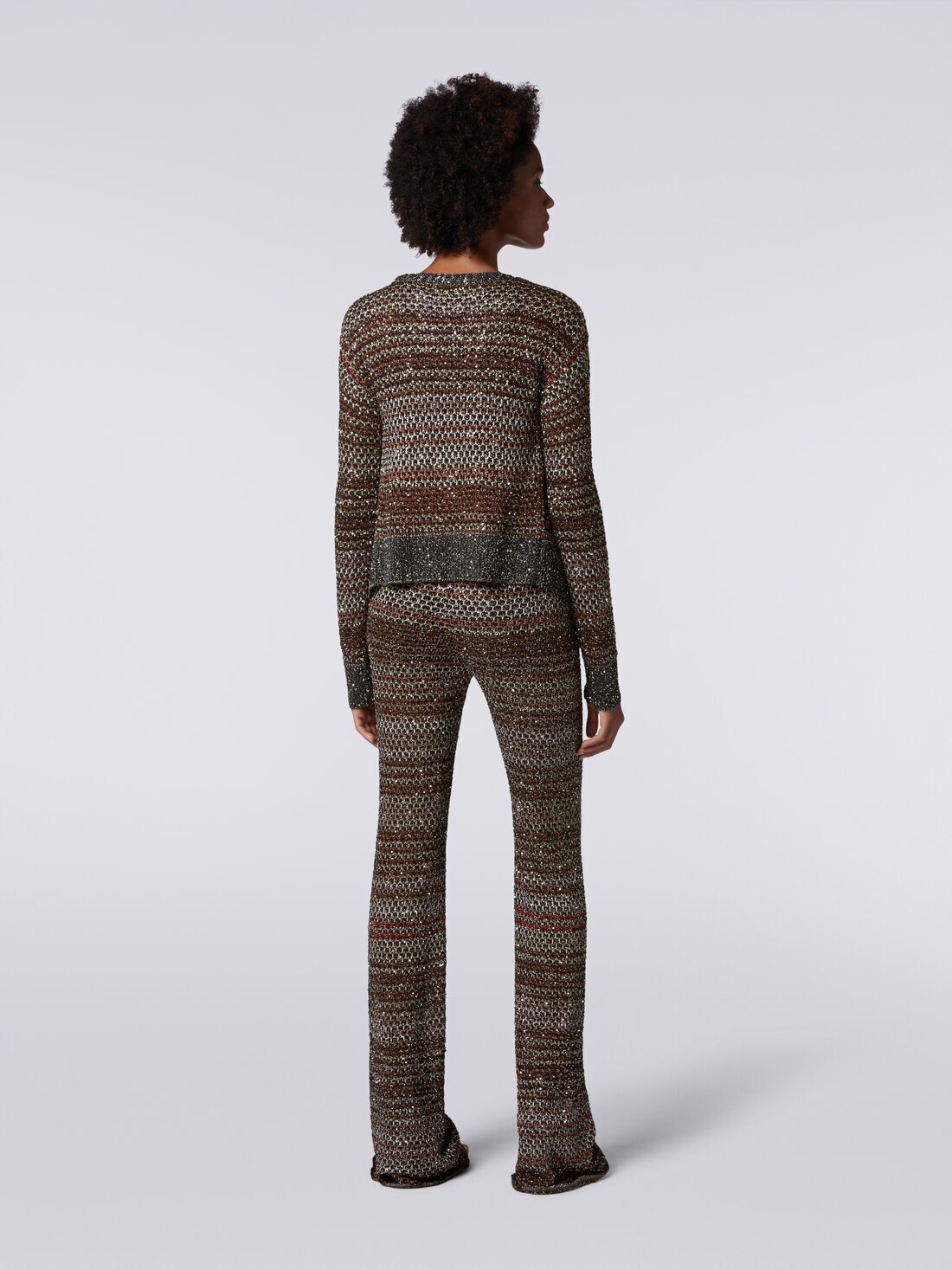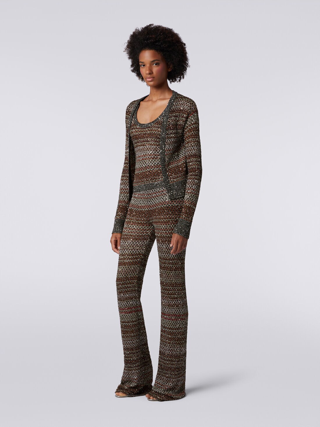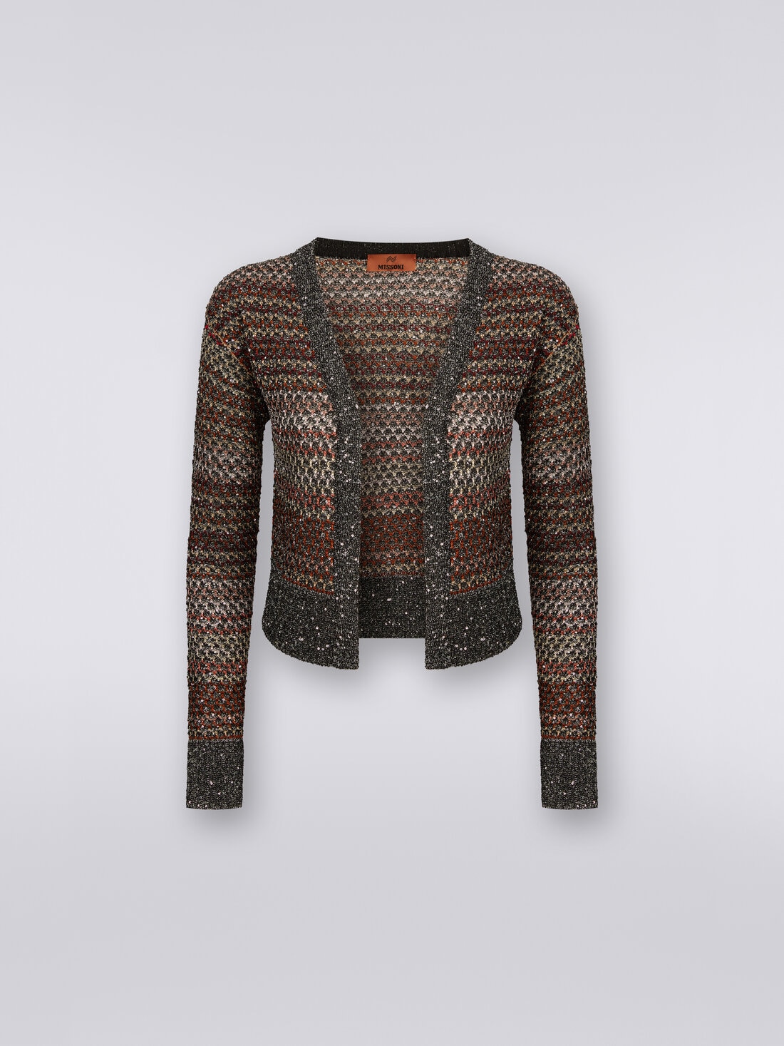 The women’s short cardigan is made of a viscose blend knit. Entirely embellished with iridescent sequins, the piece with plain trim features long sleeves.
