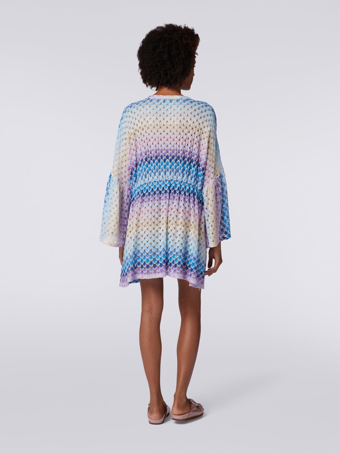 The lace-effect technique that fades, scattering the golden glow of lurex, enlivens the surface of the women’s short cover up kaftan in viscose knit. A deep V neckline, wide sleeves and swirling hem make the garment airy and feminine.