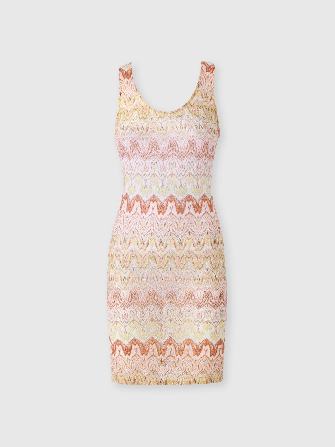 A refined lightness characterizes this women’s sleeveless short cover-up dress, crafted in raschel knit with space-dye lace in viscose lamé blend. The fluid line follows movement, creating a luminous and harmonious beachwear piece.