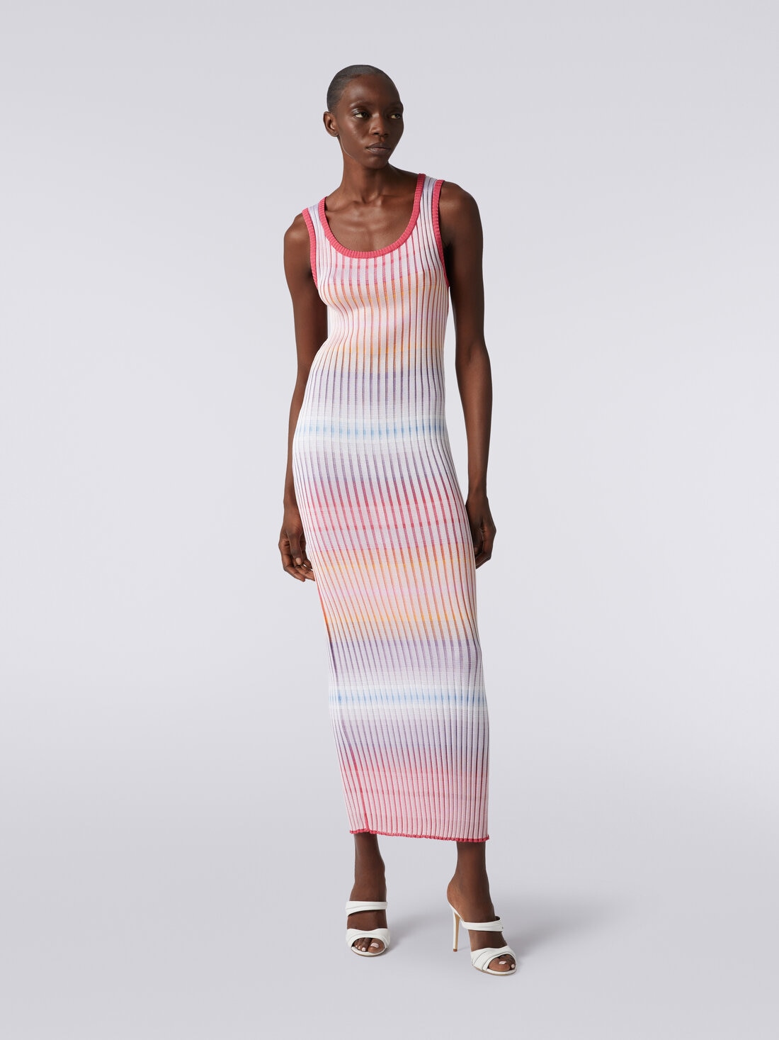 A refined knitwork with a thousand nuances for the pure viscose ribbed knit with a 7.2-gauge of the women's long dress. The model with a sensual round neckline and sleeveless features contrasting trim.