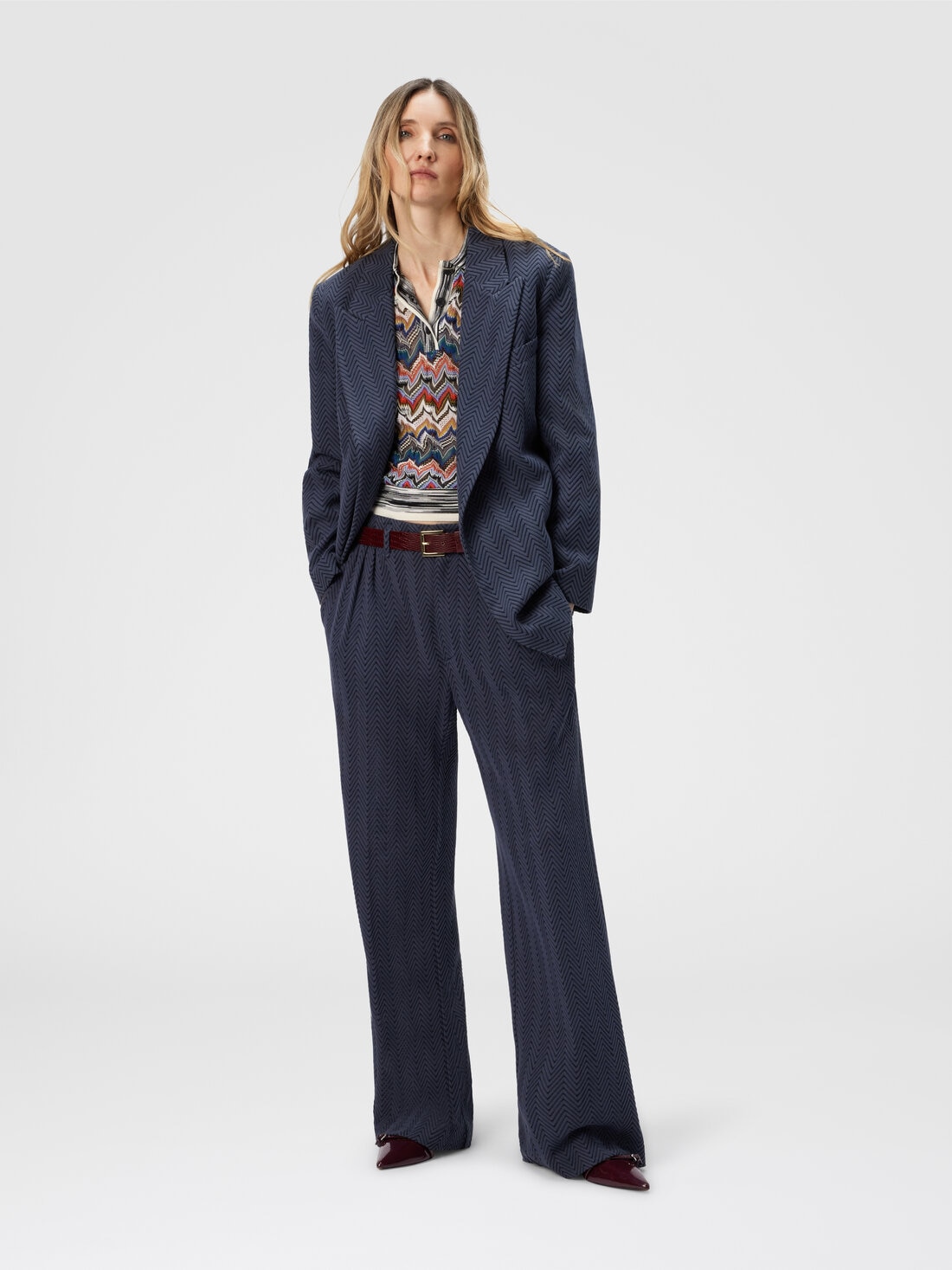 A tailored women’s trouser that reinterprets the iconic Missoni zigzag pattern with elegance, presented in a tone-on-tone version through refined raschel workmanship. Made from a cotton blend, it combines structure and graphic identity in a distinctive piece with a contemporary taste.