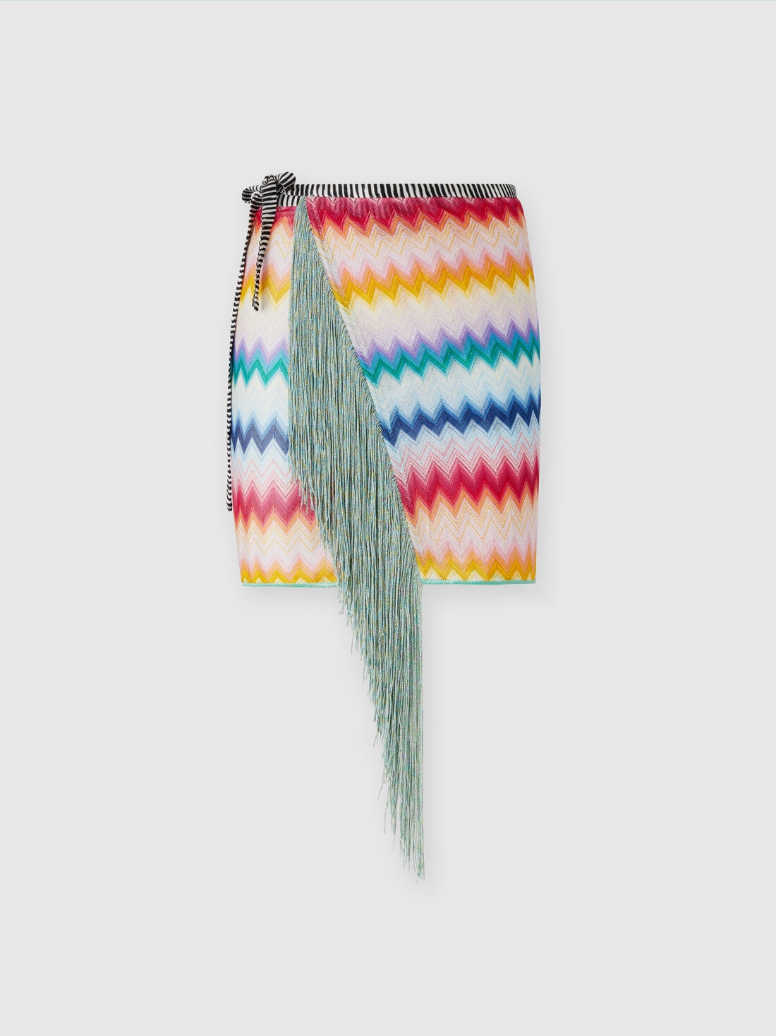 Missoni's chevron viscose sarong with lurex and fringes adds a glamorous touch to beach days. With its brilliance and sophisticated design, it turns every moment at the beach into a timeless fashion experience. It can be worn as a light skirt and is the perfect combination of functionality and elegance for days at the beach with Missoni.