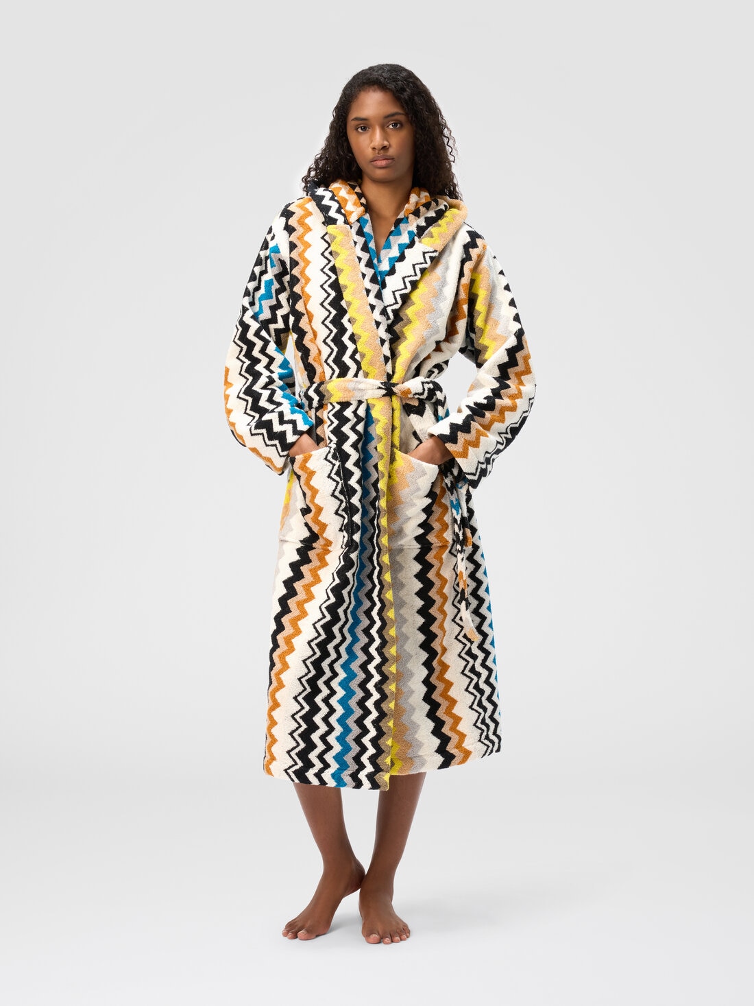 Made from soft cotton terry, the Missoni bathrobe is a refined fusion of comfort and style, embodying unmistakable elegance. Crafted from plush cotton terry, it gently wraps the body, offering a pleasant sense of well-being. The iconic zigzag pattern enhances its design, adding a distinctive and timeless touch. Featuring a hood, functional patch pockets, and a waist belt for a customizable fit, it is the perfect ally for moments of relaxation infused with everyday luxury.