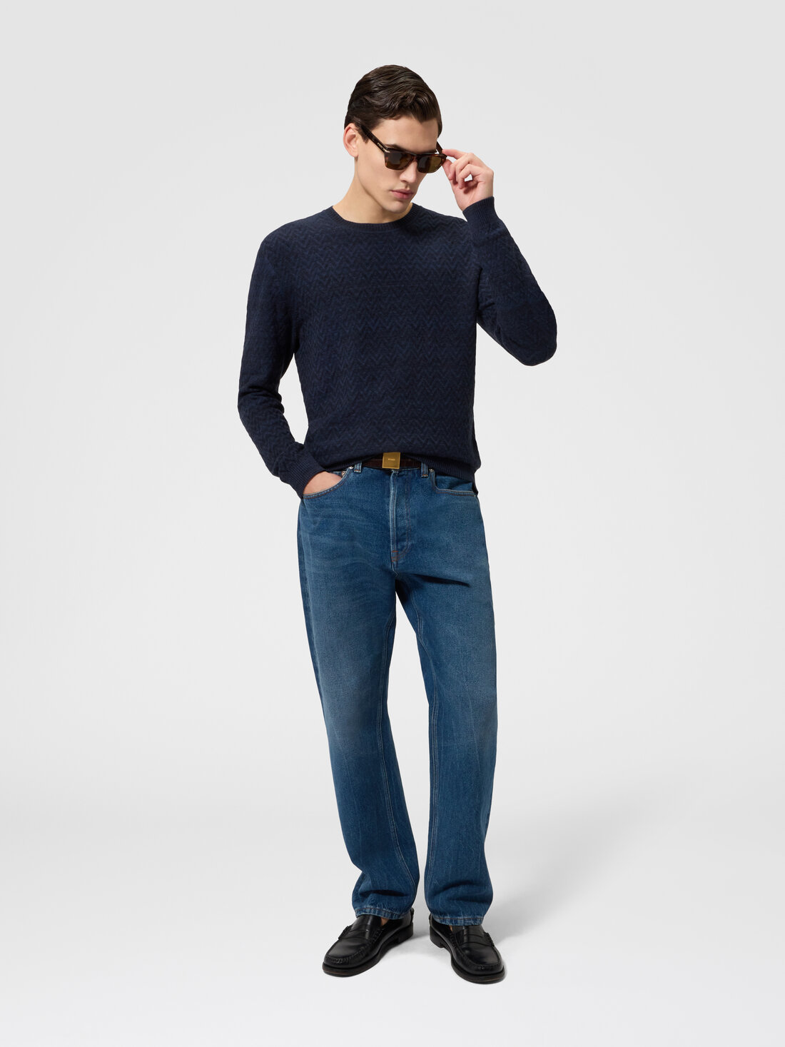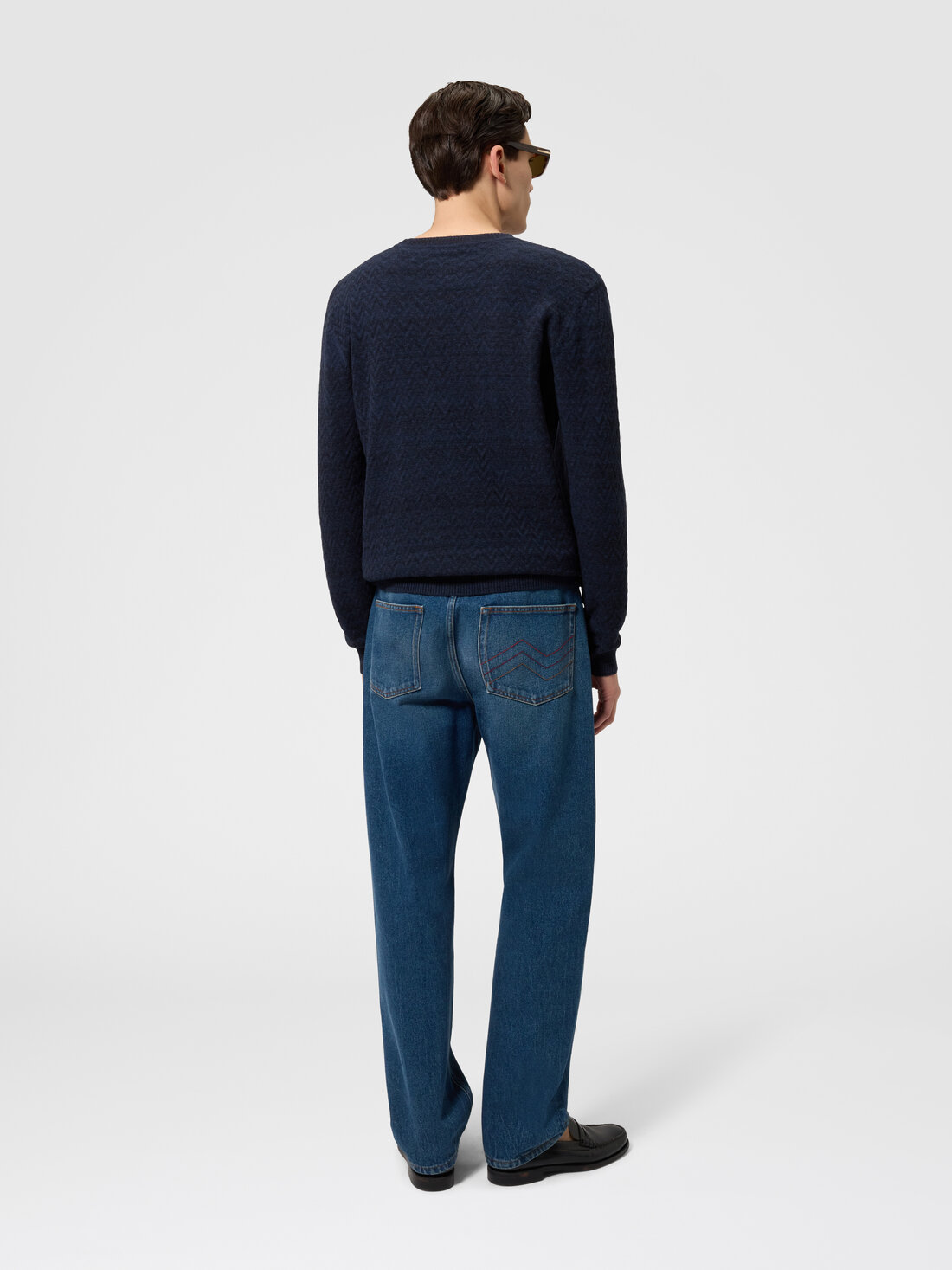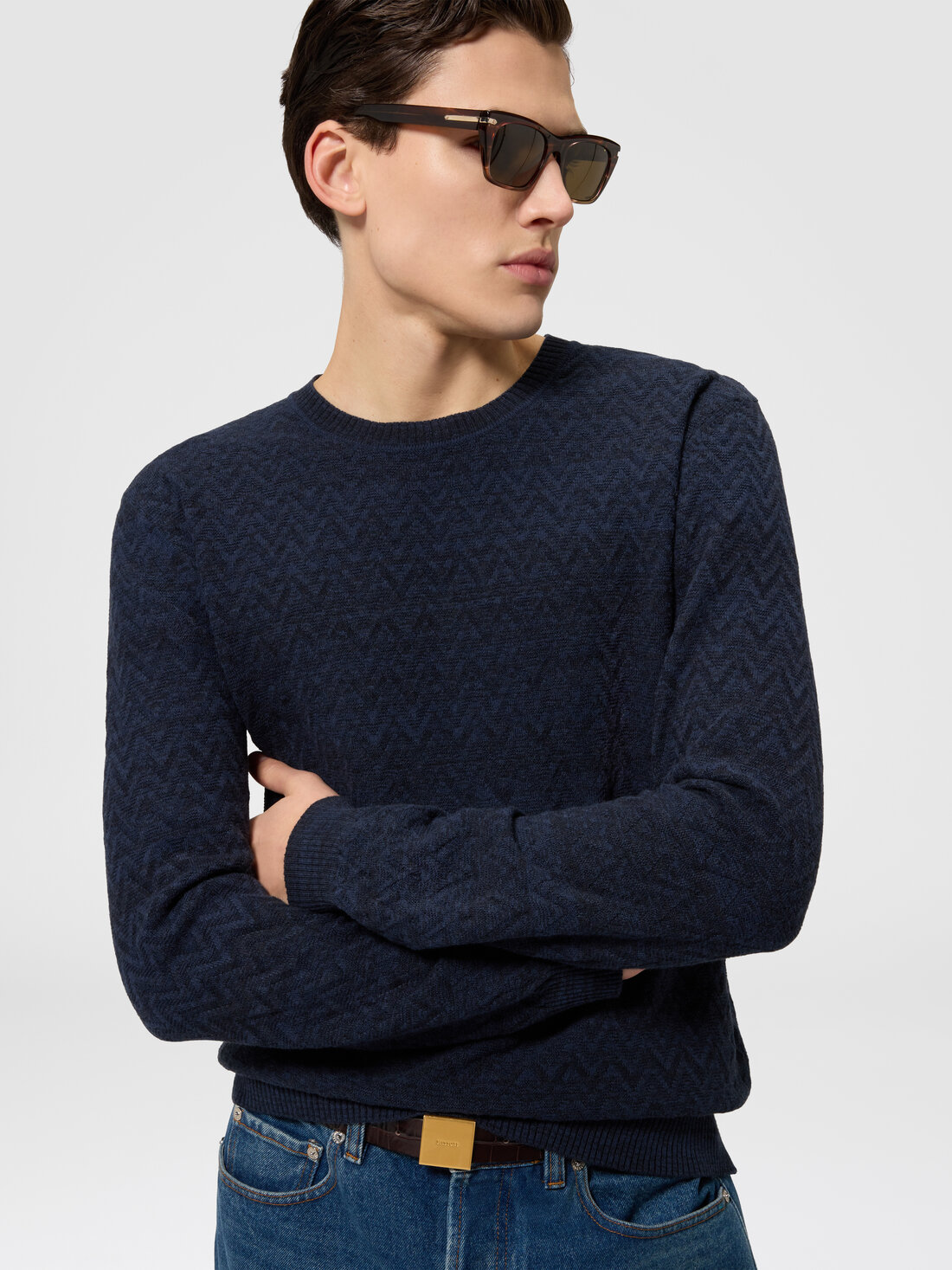 Crew-neck wool and cotton pullover with tone-on-tone zigzag pattern