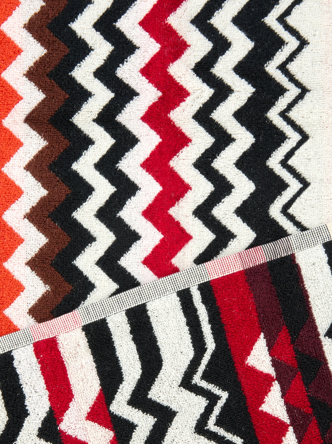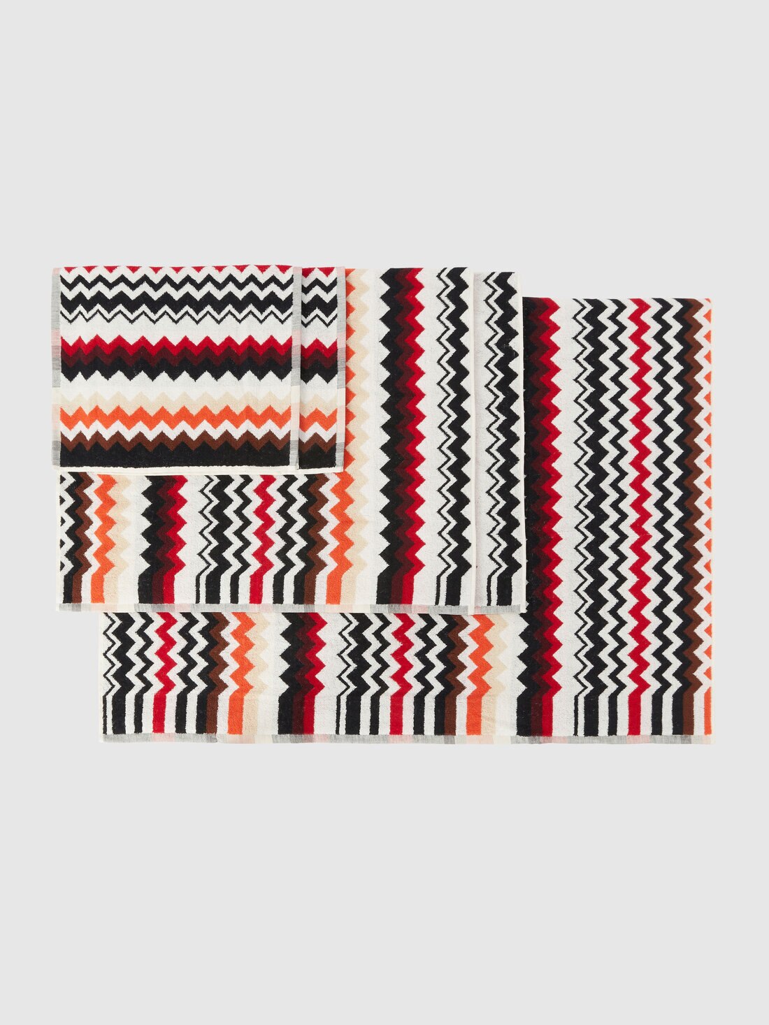 A perfect balance of aesthetics and practicality defines this bath set, comprising five towels of different sizes, crafted from soft cotton terry. The iconic Missoni zigzag pattern intertwines with the fabric texture, creating a play of colors and movement that enriches the space. A sophisticated addition for those who love surrounding themselves with refined details, capable of transforming everyday gestures into a stylish experience.