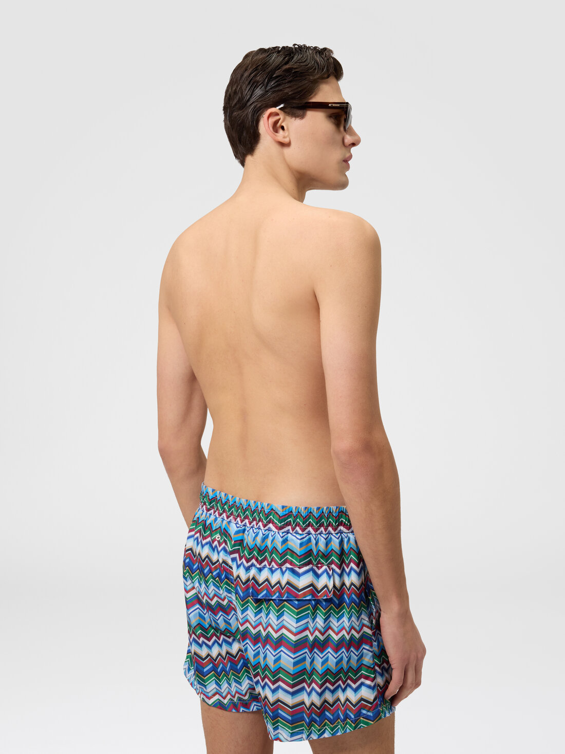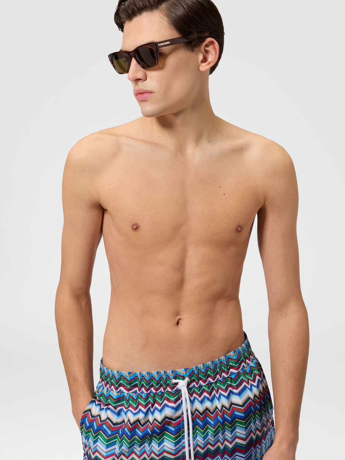 The Maison’s zigzag motif gains movement and becomes irregular in these mid-length men’s swim shorts, creating a dynamic effect.
