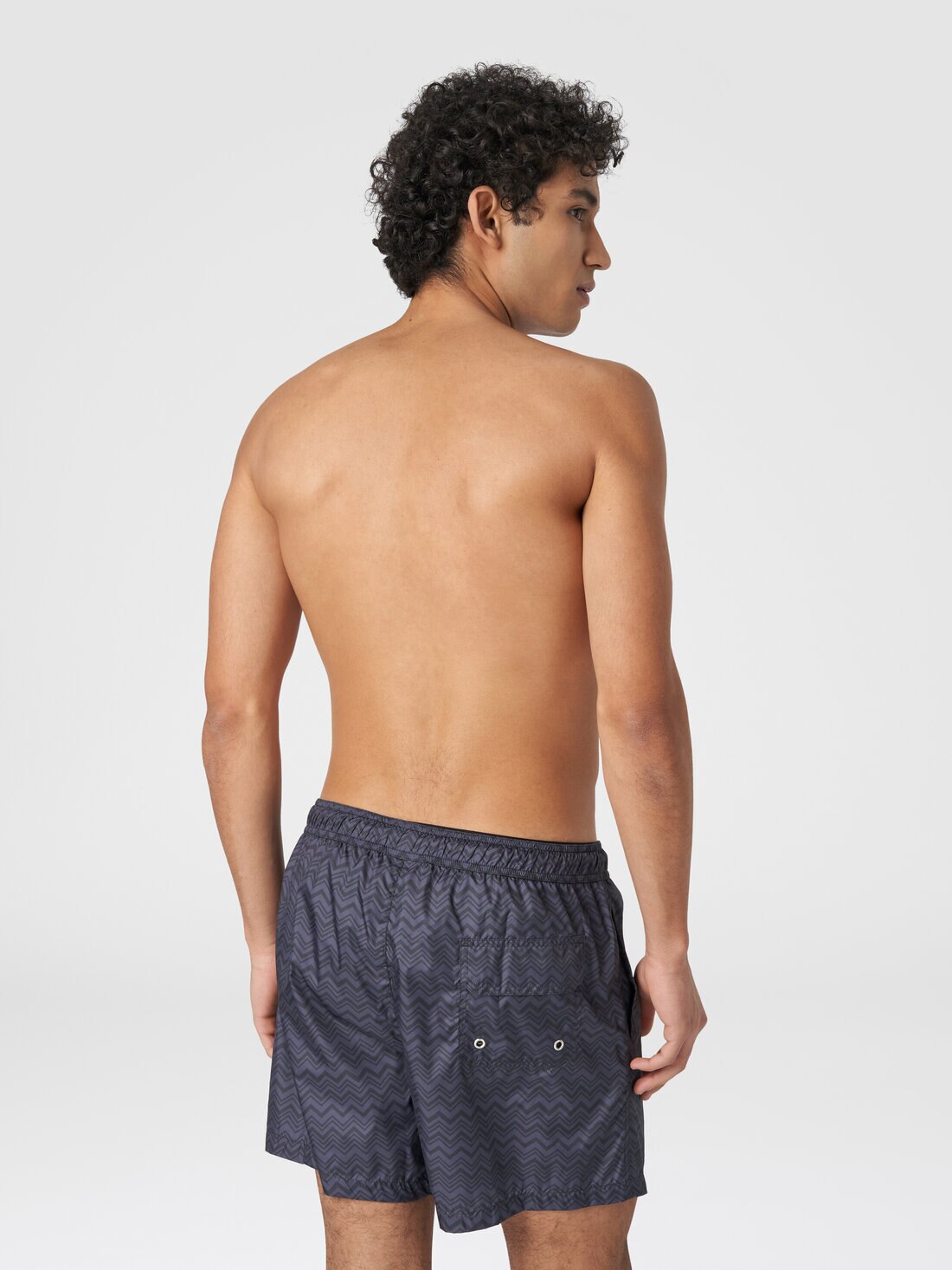 Given a sense of rhythm by the tone-on-tone zigzag print, which seamlessly alternates on the slightly glossy surface of the technical nylon, the men’s swim shorts are the perfect expression of Missoni’s DNA in holiday form.