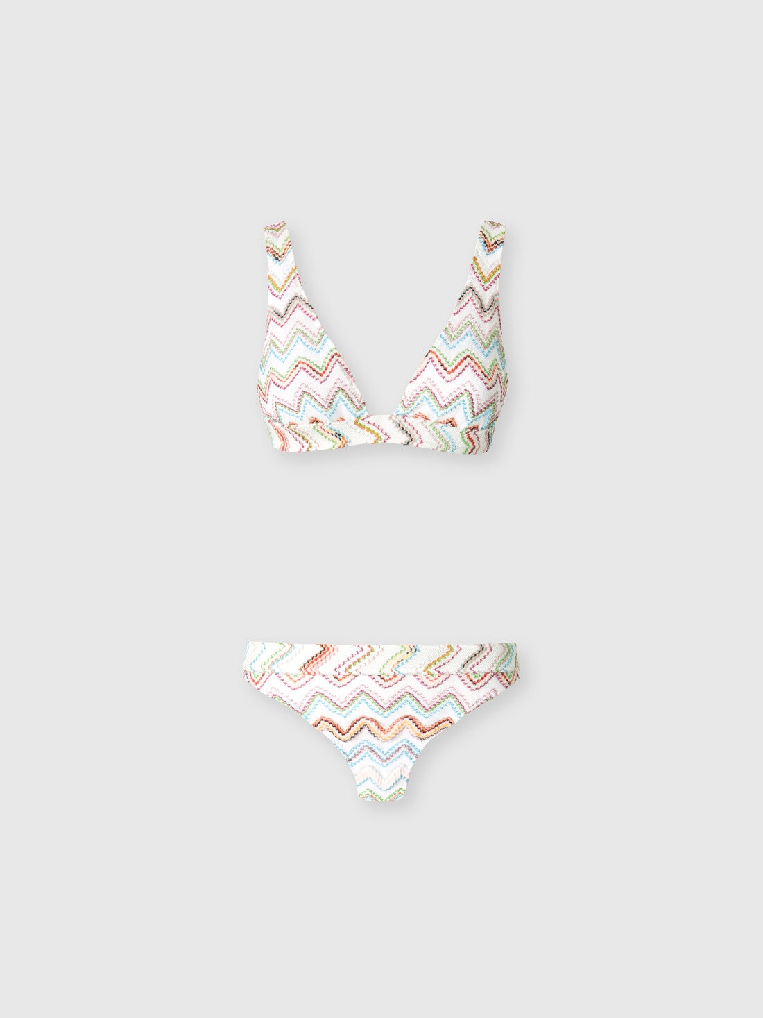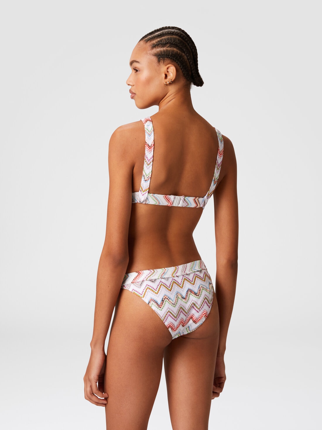 Bikini with the iconic zigzag motif of the Missoni maison in a 3D variant, illuminated by the metallic reflections conferred by lamé and embellished with raschel workmanship. The drawstring briefs offer a custom fit while the design maintains the balance between aesthetics and comfort, for an iconic and functional style.