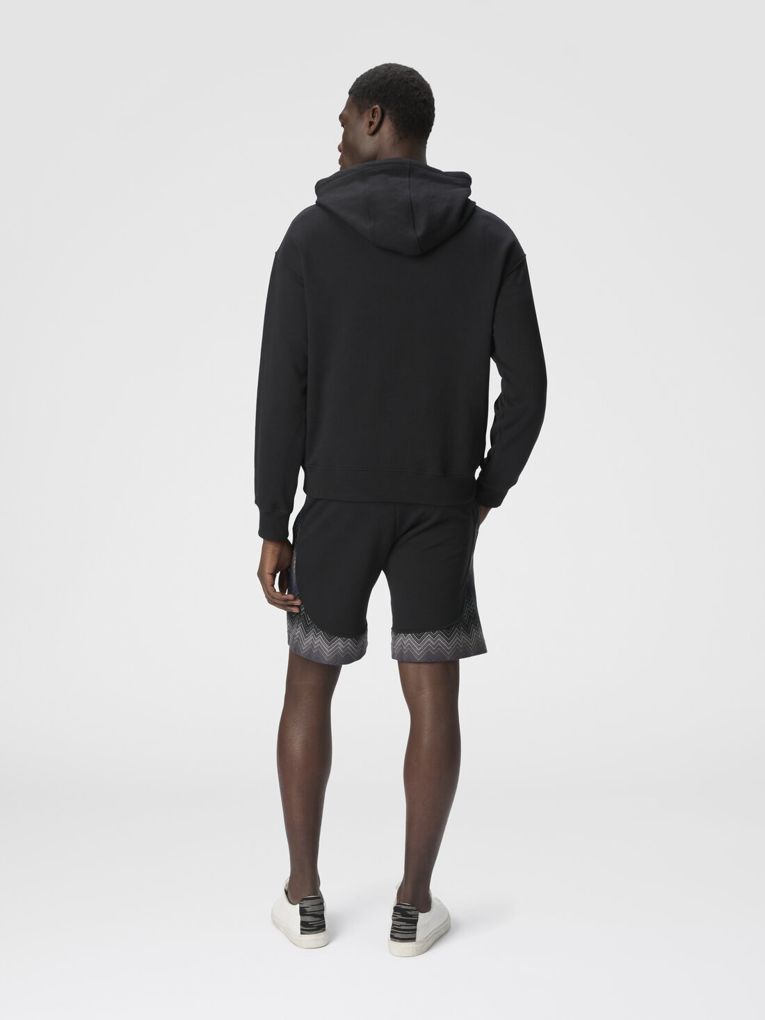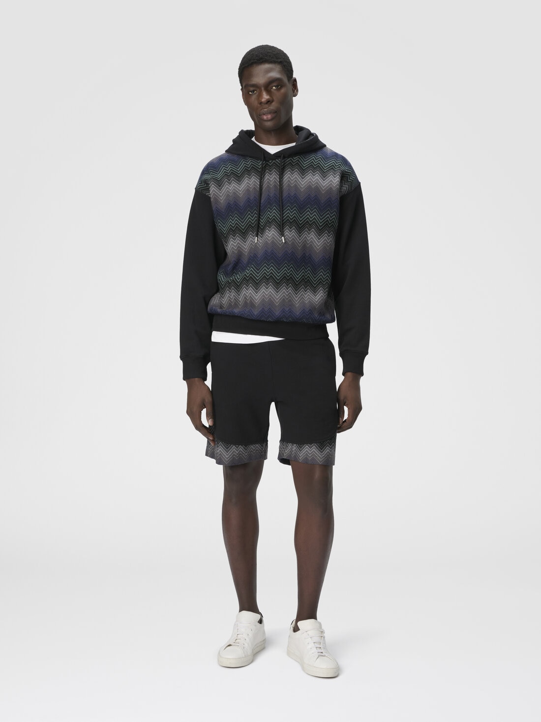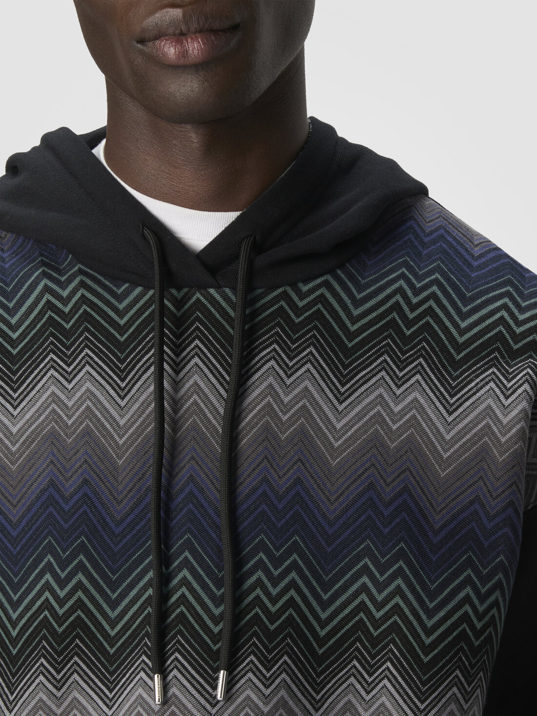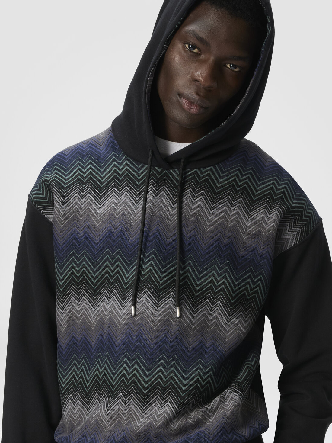 The unmistakable character of the Missoni maison takes shape in this men's hooded sweatshirt in 100% cotton, enriched with raschel-processed inserts featuring an irregular zigzag. A perfect balance of comfort and graphic style, where artisanal tradition meets a contemporary and distinctive aesthetic.