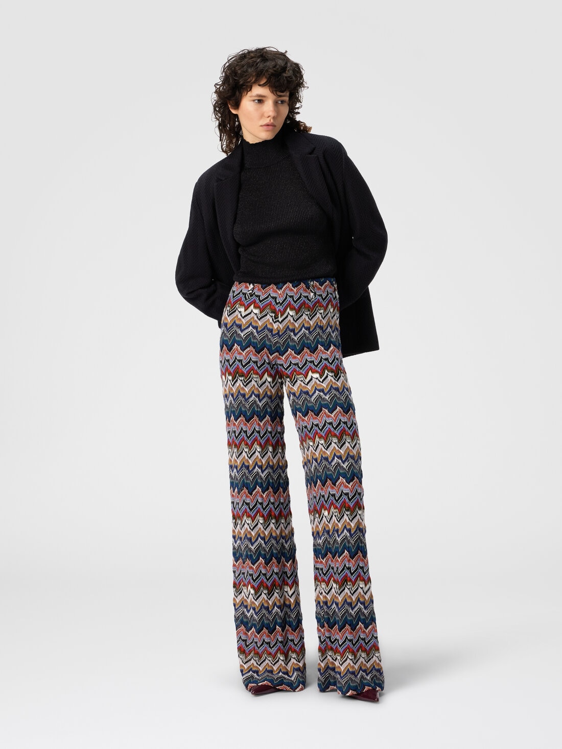 A refined interpretation of the classic palazzo trouser, this women’s piece in lace with raschel workmanship is made of viscose blend with lamé threads that enhance its texture. The waistband defines the silhouette, adding a sophisticated and feminine touch to the design.