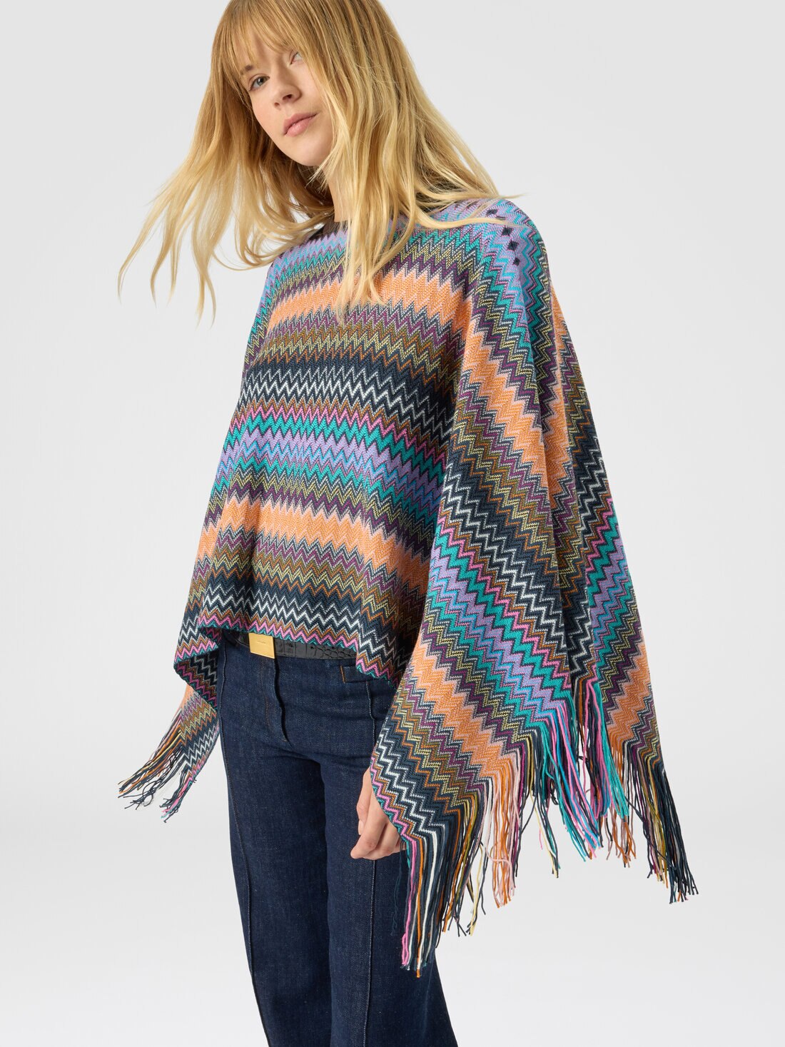 An accessory that adds a fresh twist to the most formal looks: here is the women’s poncho by Missoni. Made from a wool-blend knit, it features the iconic zigzag pattern and is finished with a fringed hem.