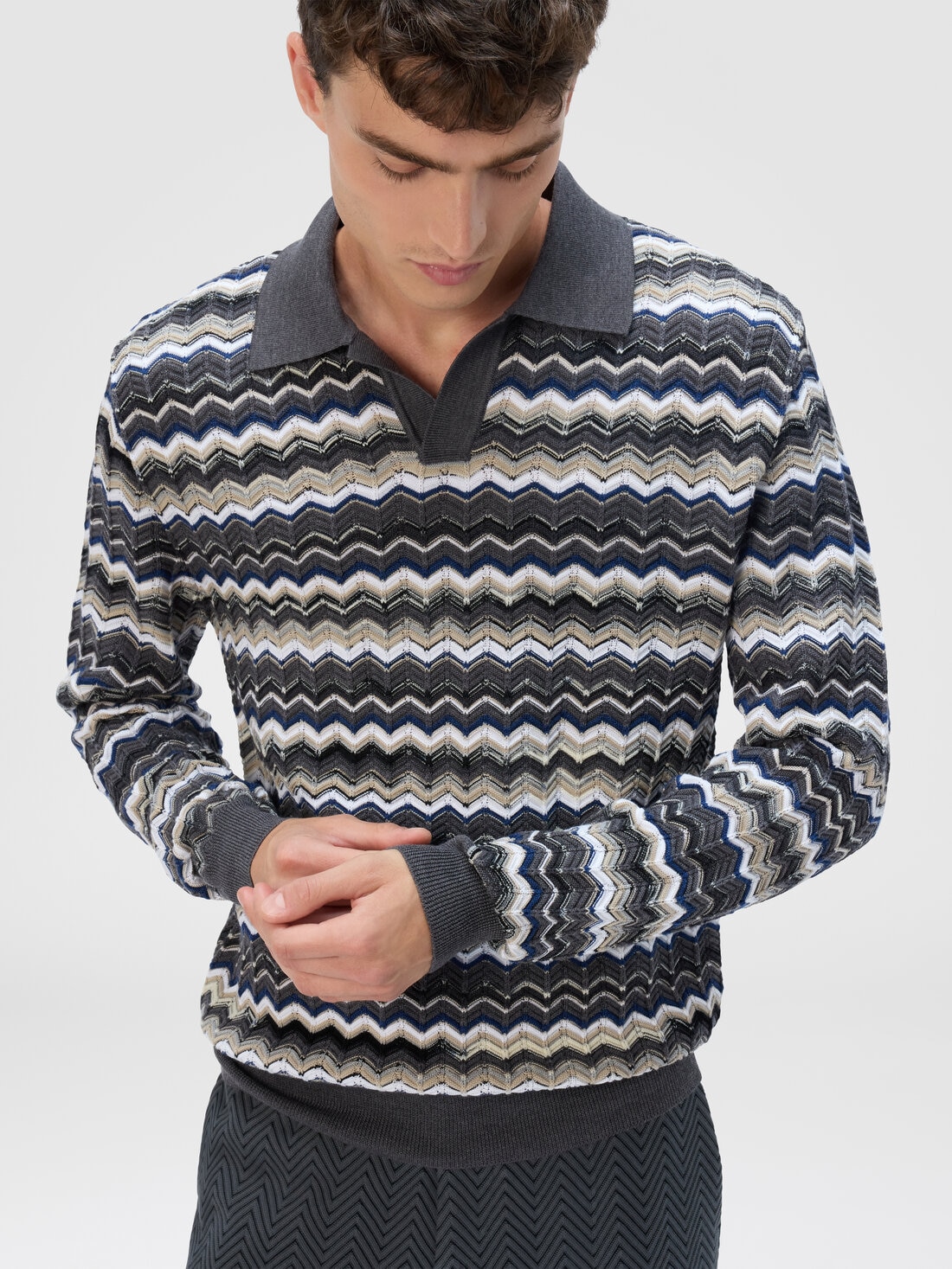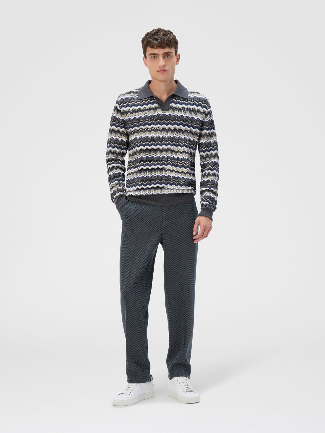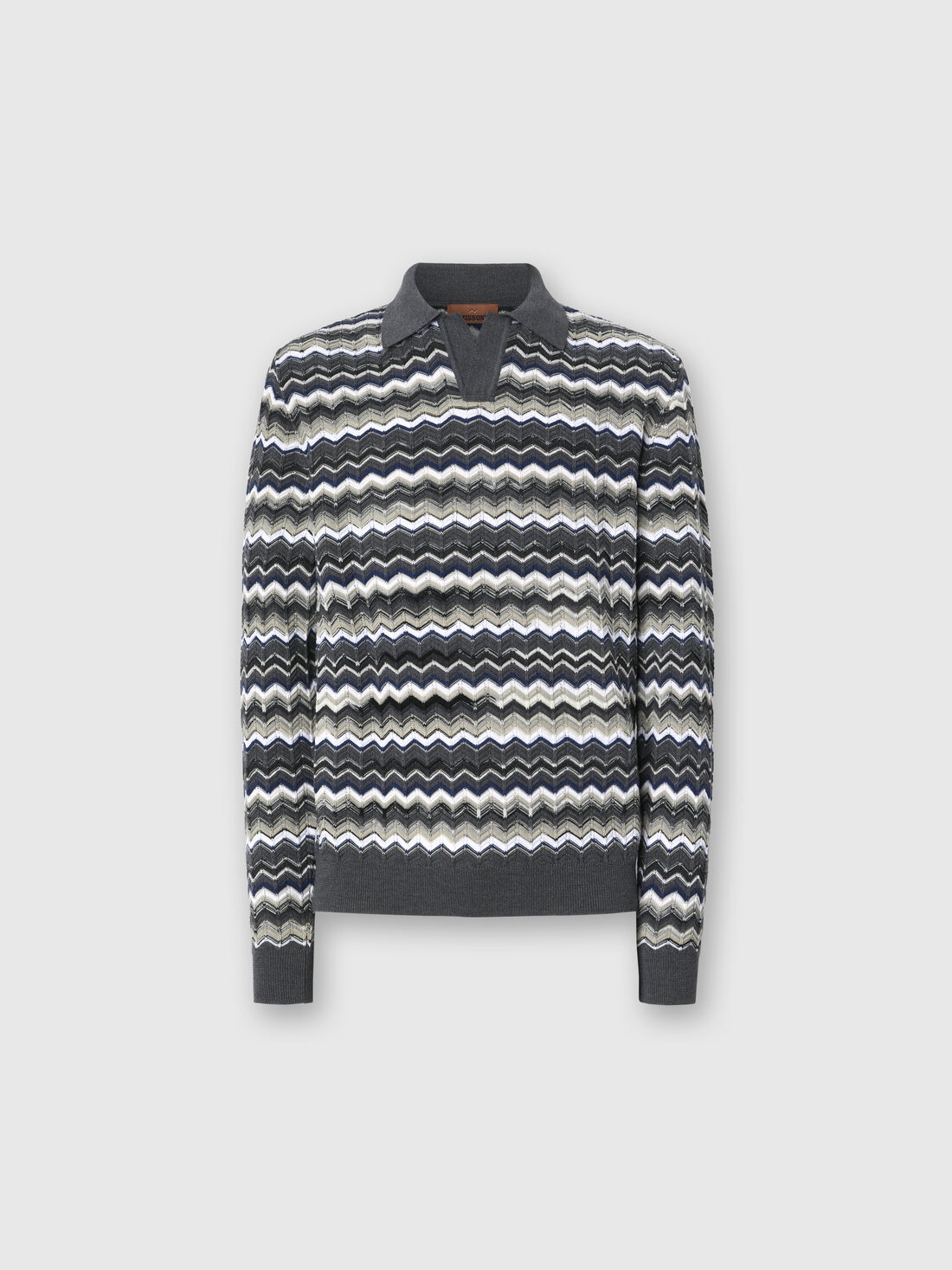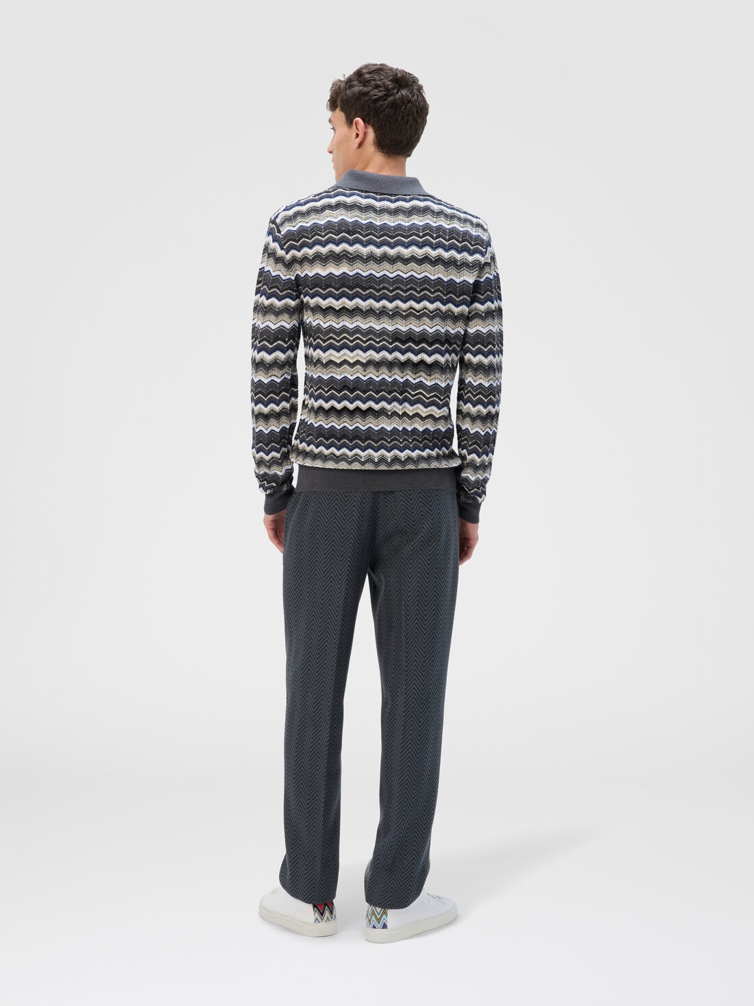 Long-sleeve men’s polo with V-neck, characterized by Missoni’s signature zigzag motif and contrasting borders. Made from a refined wool and cotton blend, this polo combines comfort and style, offering an elegant and modern design, perfect for a sophisticated yet versatile look.