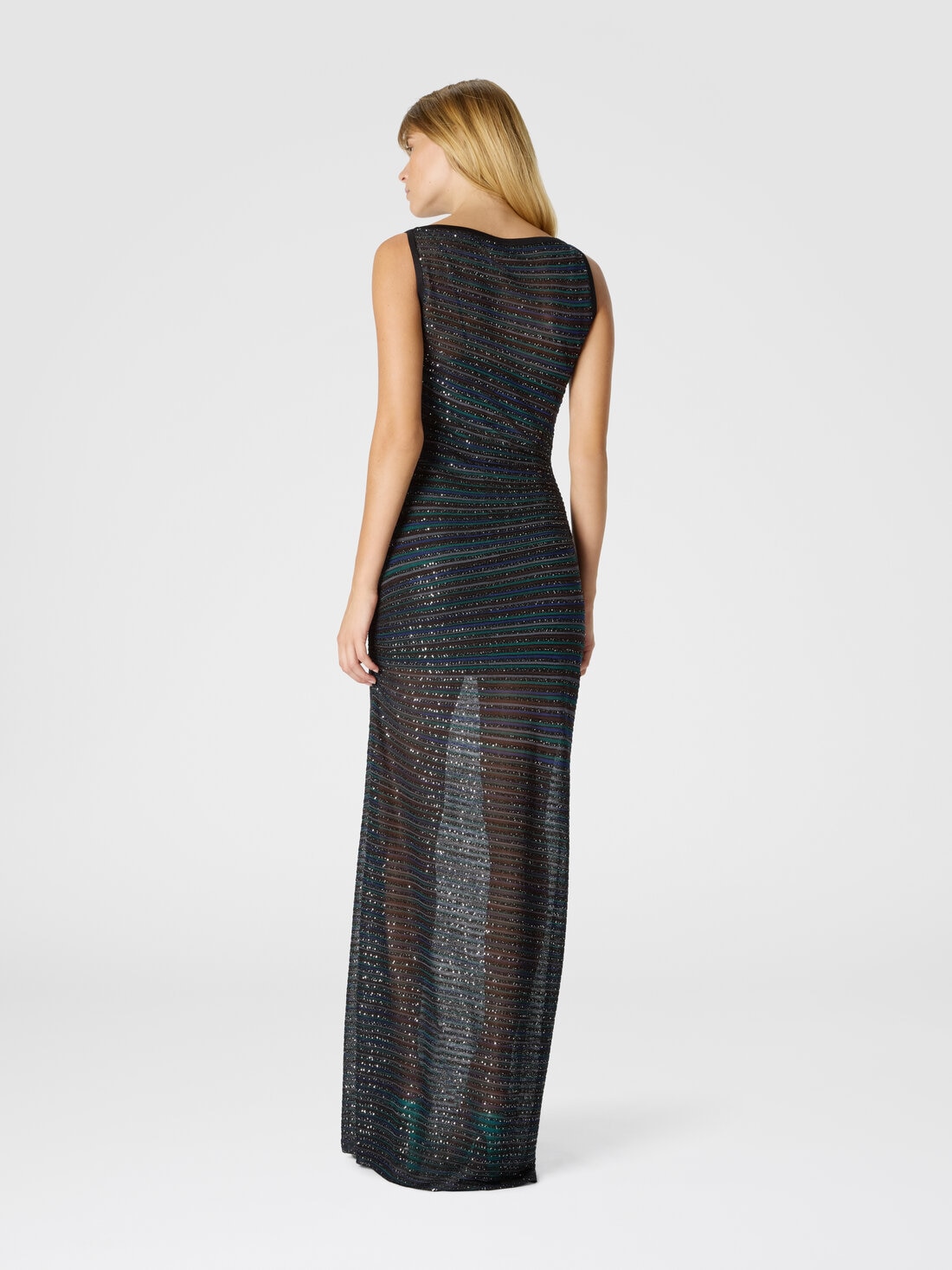 Sophisticated elegance and modern refinement meet in this long women’s dress with a boat neckline. The viscose-blend striped knit, enriched with lamé threads and sequins, discreetly captures the light, creating a luminous effect that gracefully wraps the silhouette. A garment that blends modernity with timeless class, perfect for any elegant occasion.