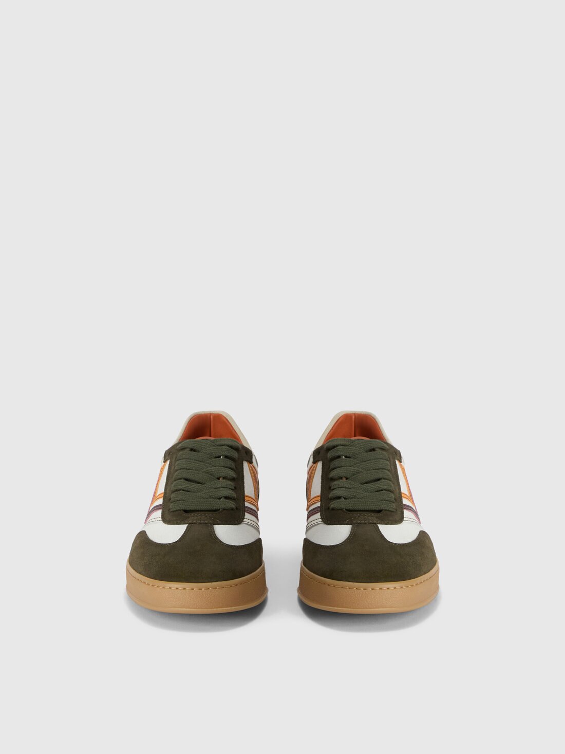 A refined colour palette defines these leather sneakers, featuring inserts in contrasting hues and materials. Personalised with logo lettering, they are set on a rubber sole and finished with distinctive chevron detailing.
