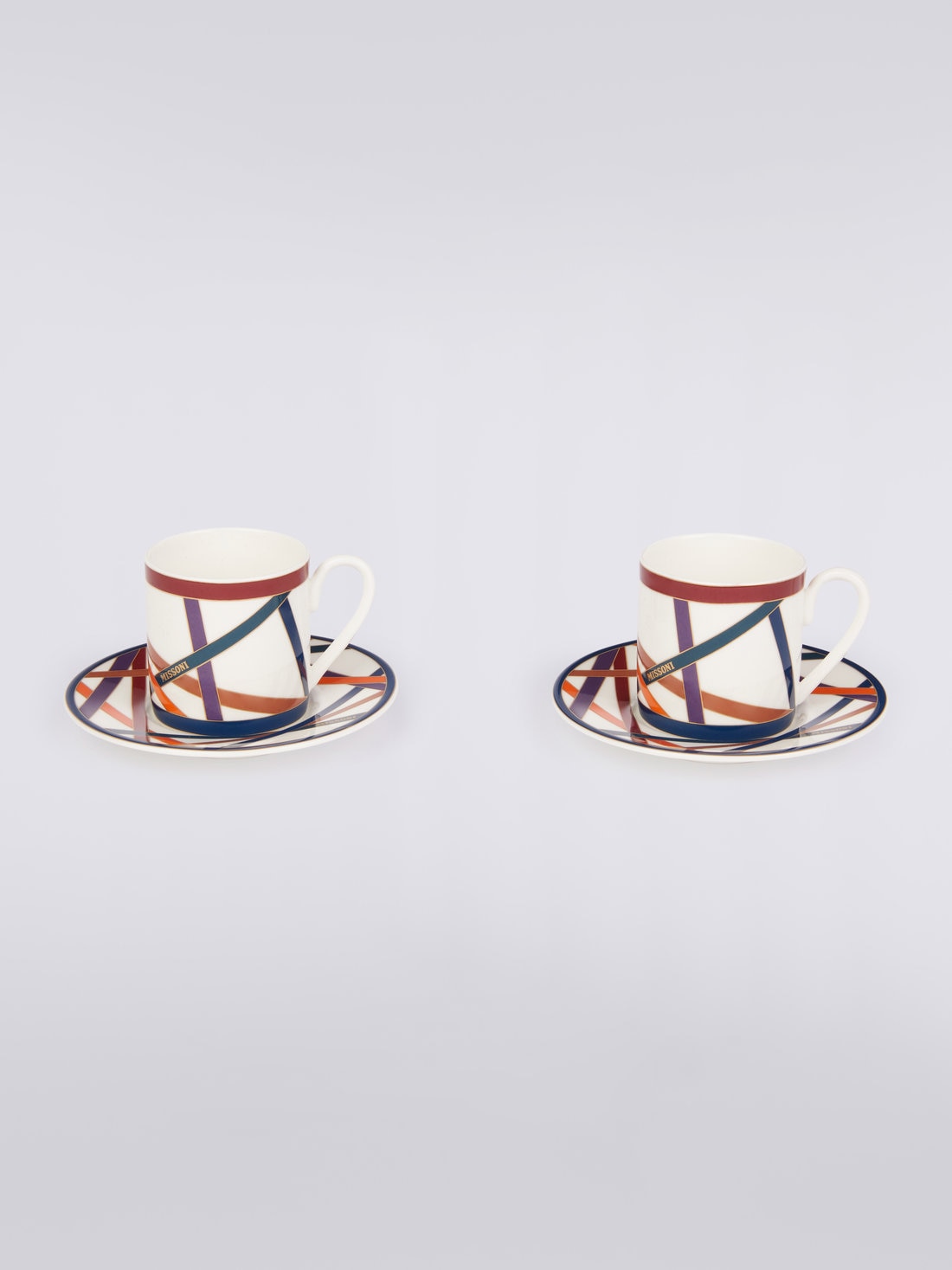 The MissoniHome set of two coffee cups and saucers embodies the perfect blend of refinement and personality, with the iconic Nastri pattern embellished with gold filigree and the logo print.