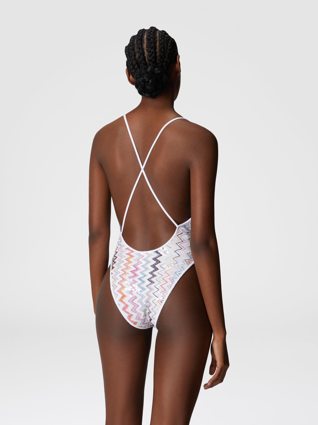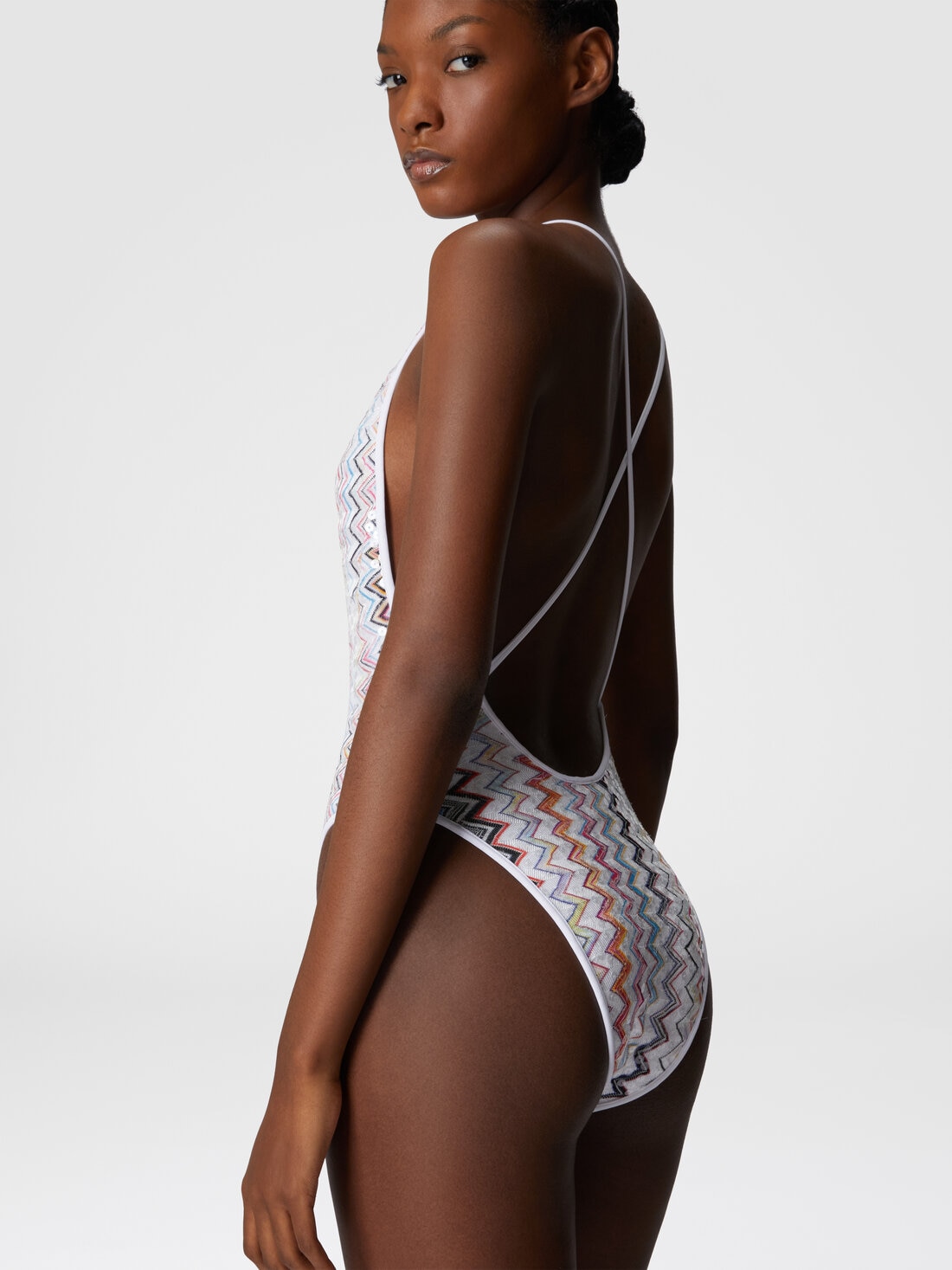A sophisticated women’s one-piece swimsuit, featuring a V-neckline and Raschel lacework embellished with sequins. The iconic zigzag pattern and open back complete a design that blends class and sensuality.