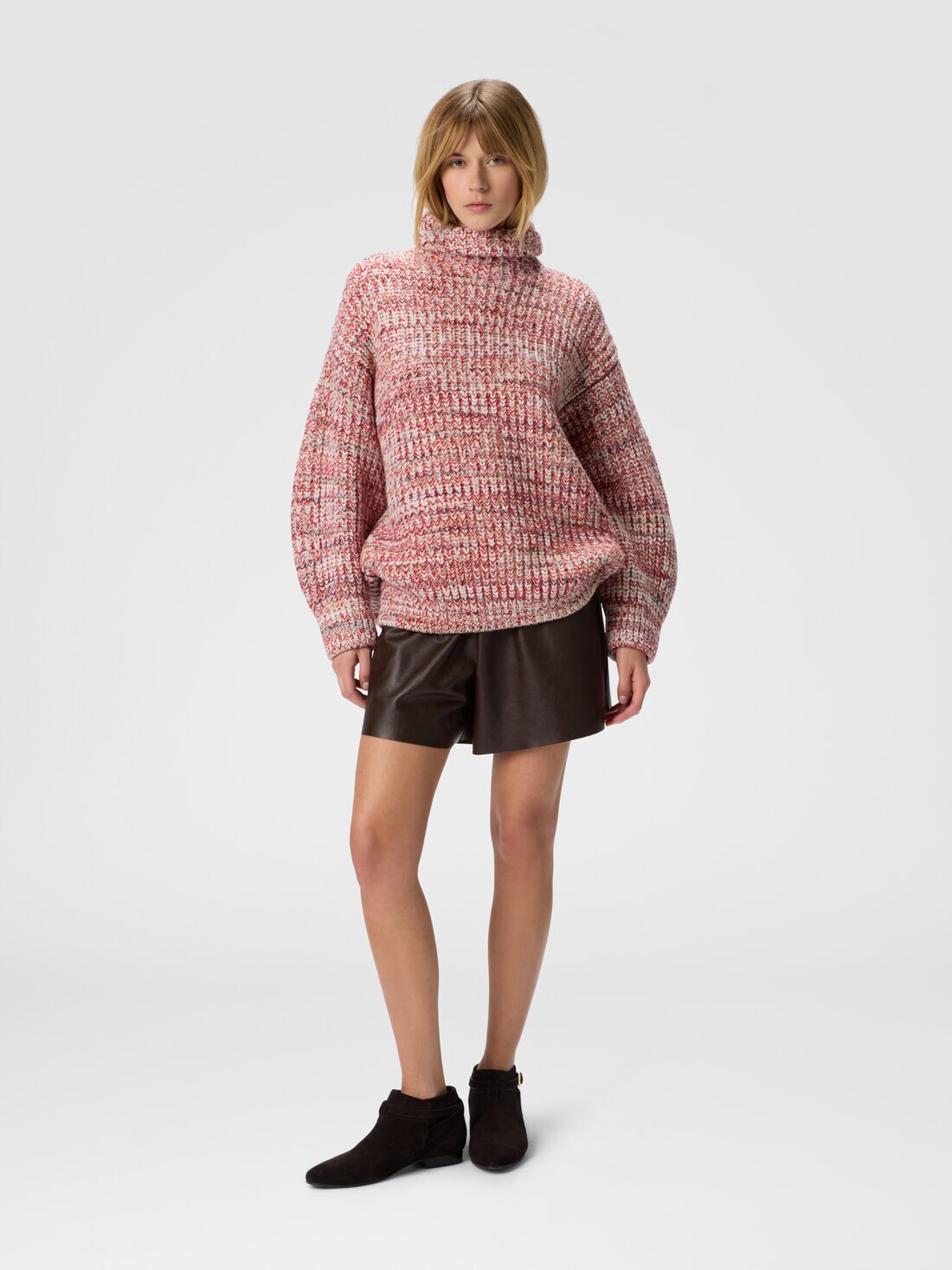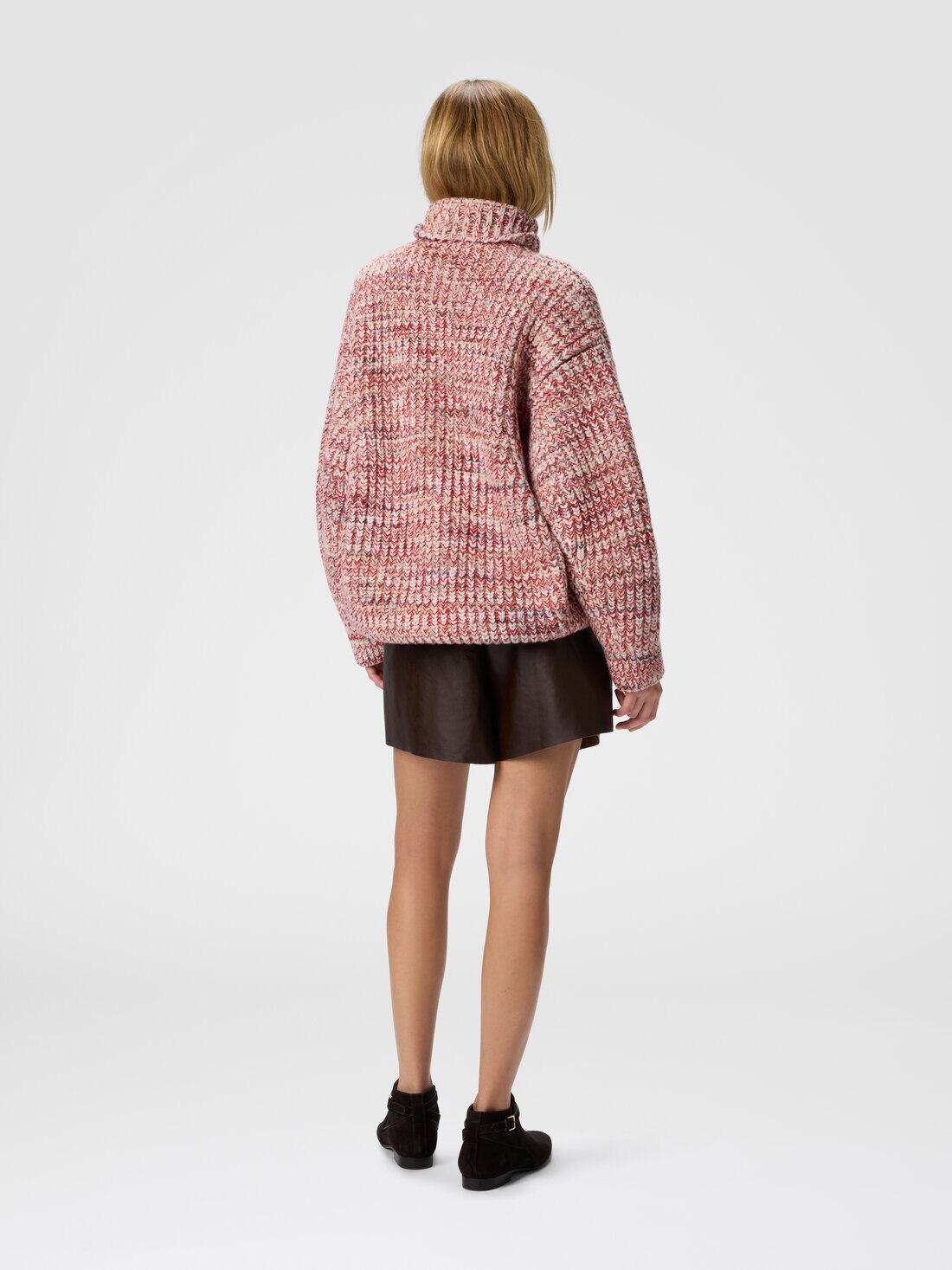A garment with strong character that redefines traditional knitwear with a modern, authentic aesthetic. This oversized women’s turtleneck sweater is made from flame rib knit in pure wool, chosen for its irregular texture full of movement. The loose fit enhances the sense of softness and comfort, resulting in an essential yet personality-rich design.