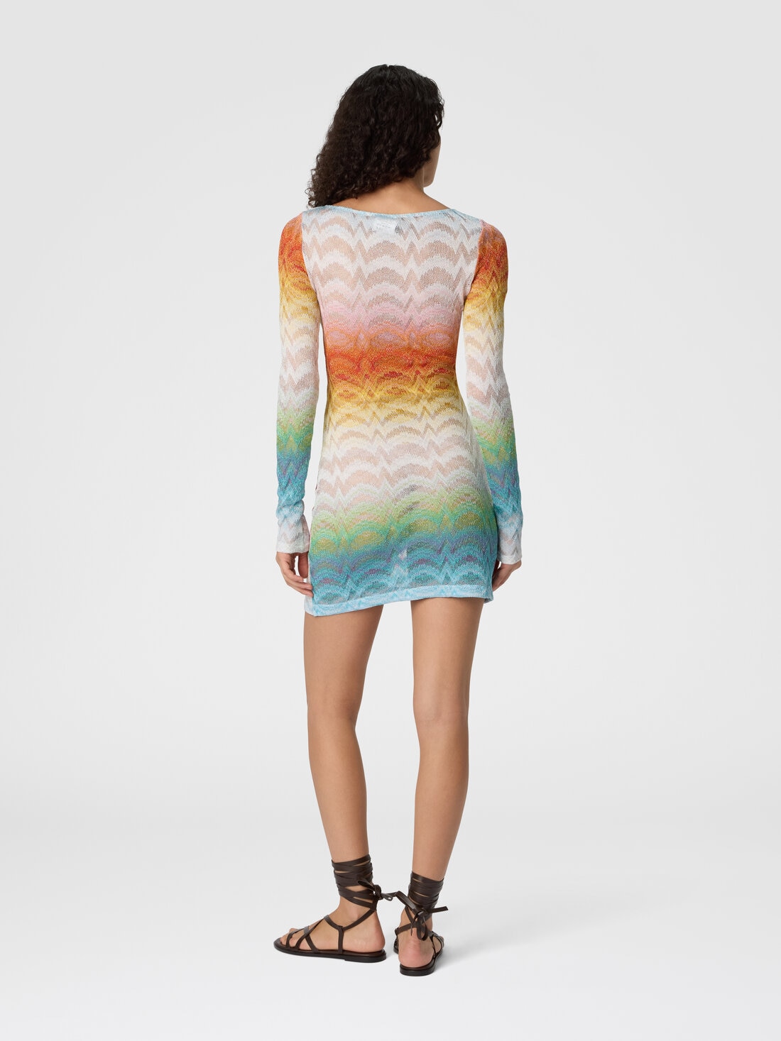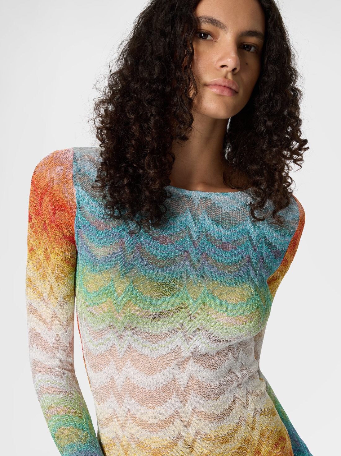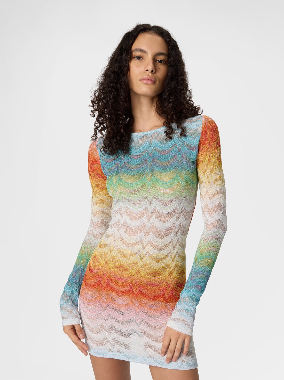 A play of transparencies and luminous details defines this women’s shaded viscose lamé mini dress. The long sleeves and raschel workmanship add lightness and movement, elegantly interpreting Missoni’s refined spirit.