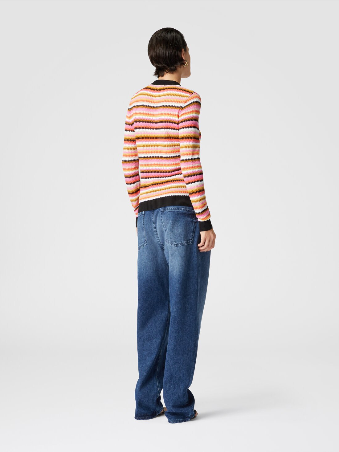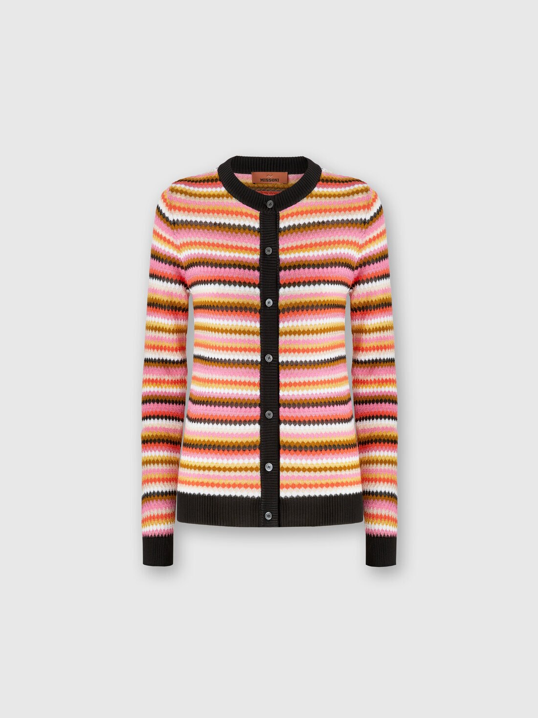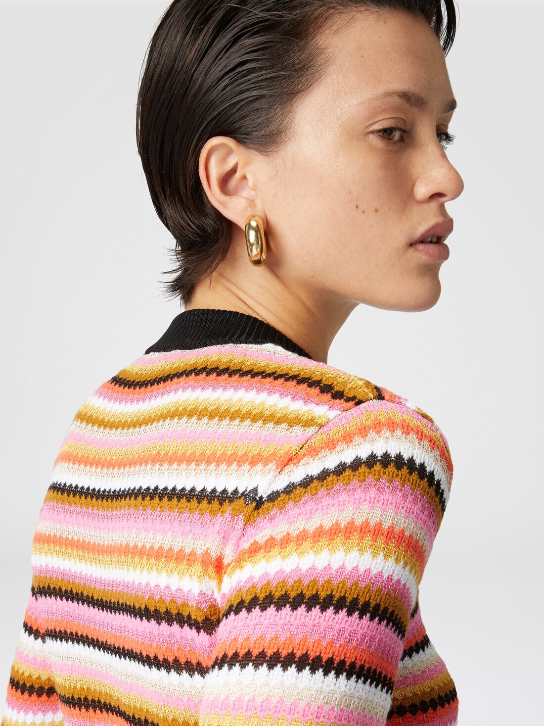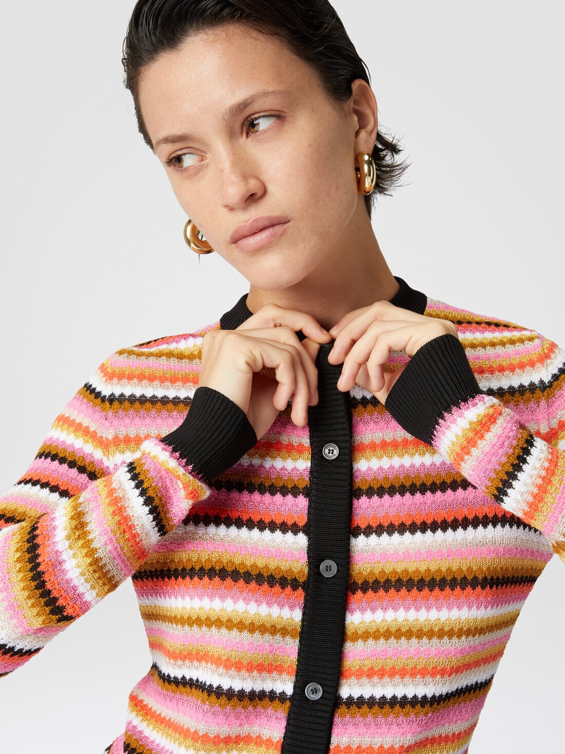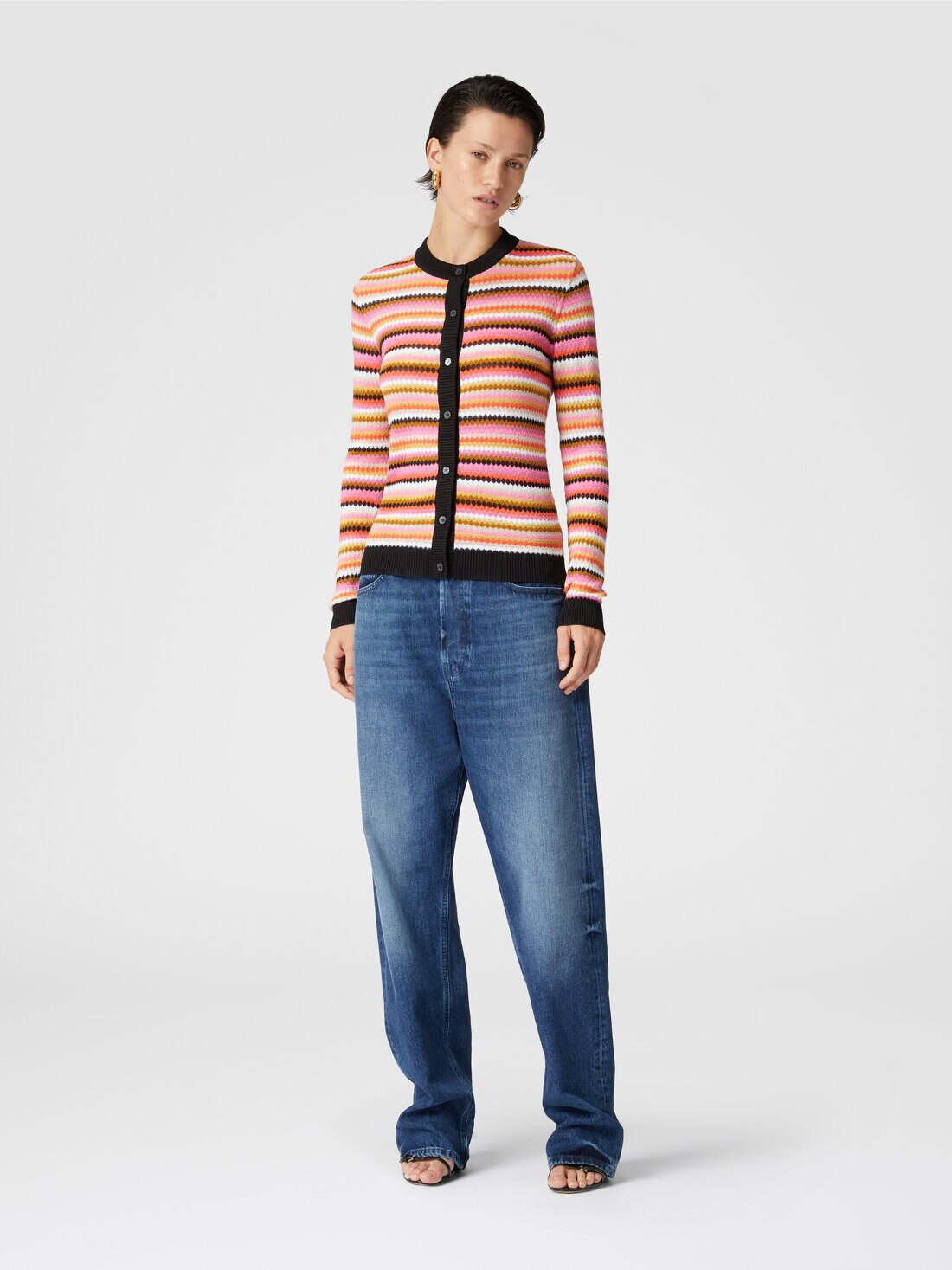 The versatility of the cotton and viscose mix provides the ideal terrain for the discontinuous striped background of the crewneck carigan. The fitted style with buttons is finished with contrasting piping.