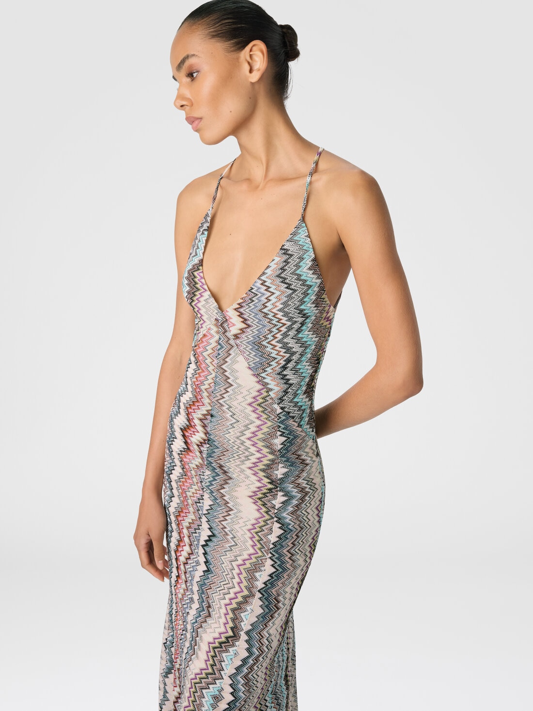 Elegant and enveloping, this long dress with a V-neck and thin straps is made of 100% viscose, characterized by refined raschel workmanship. The snake motif, evoking Missoni’s iconic zigzag, adds a graphic and distinctive touch, creating a dynamic and modern visual effect.