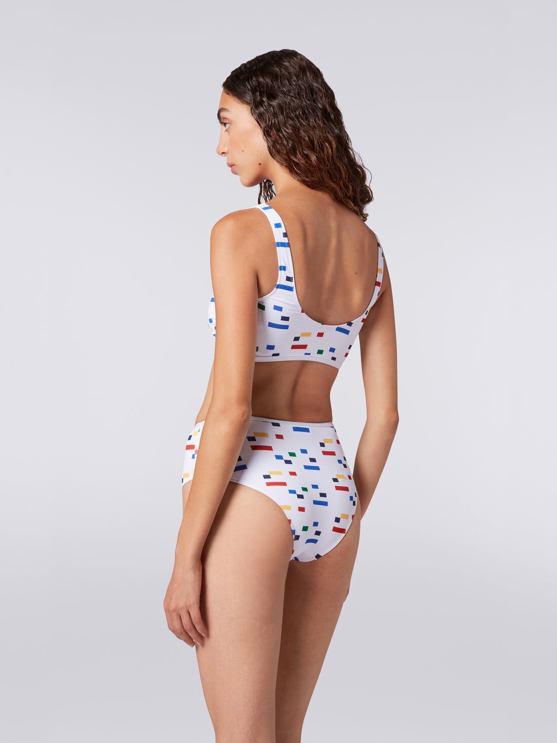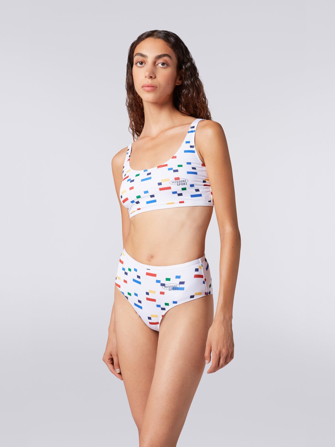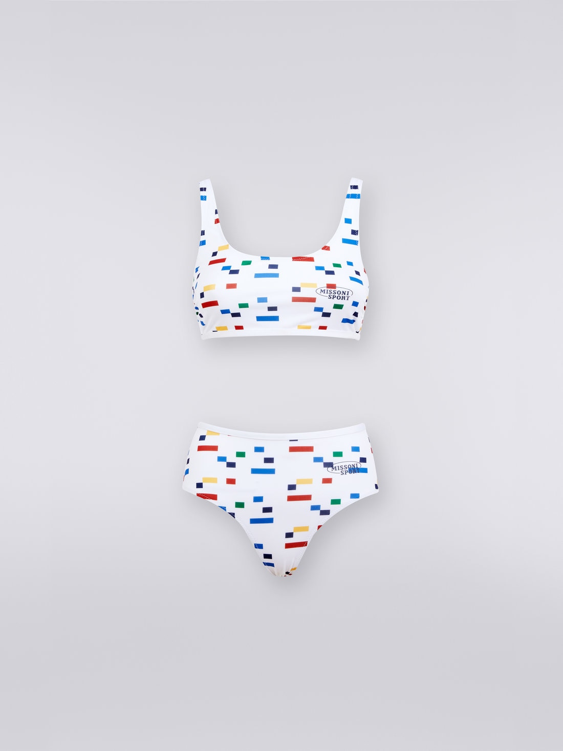 The contemporary reinterpretation of Missoni Sport’s Legacy logo transforms the sporty women’s bikini into a cult piece. The two-piece with round neckline bra and high-waisted briefs embellished with an all-over pixel print combines performance and attention to style.