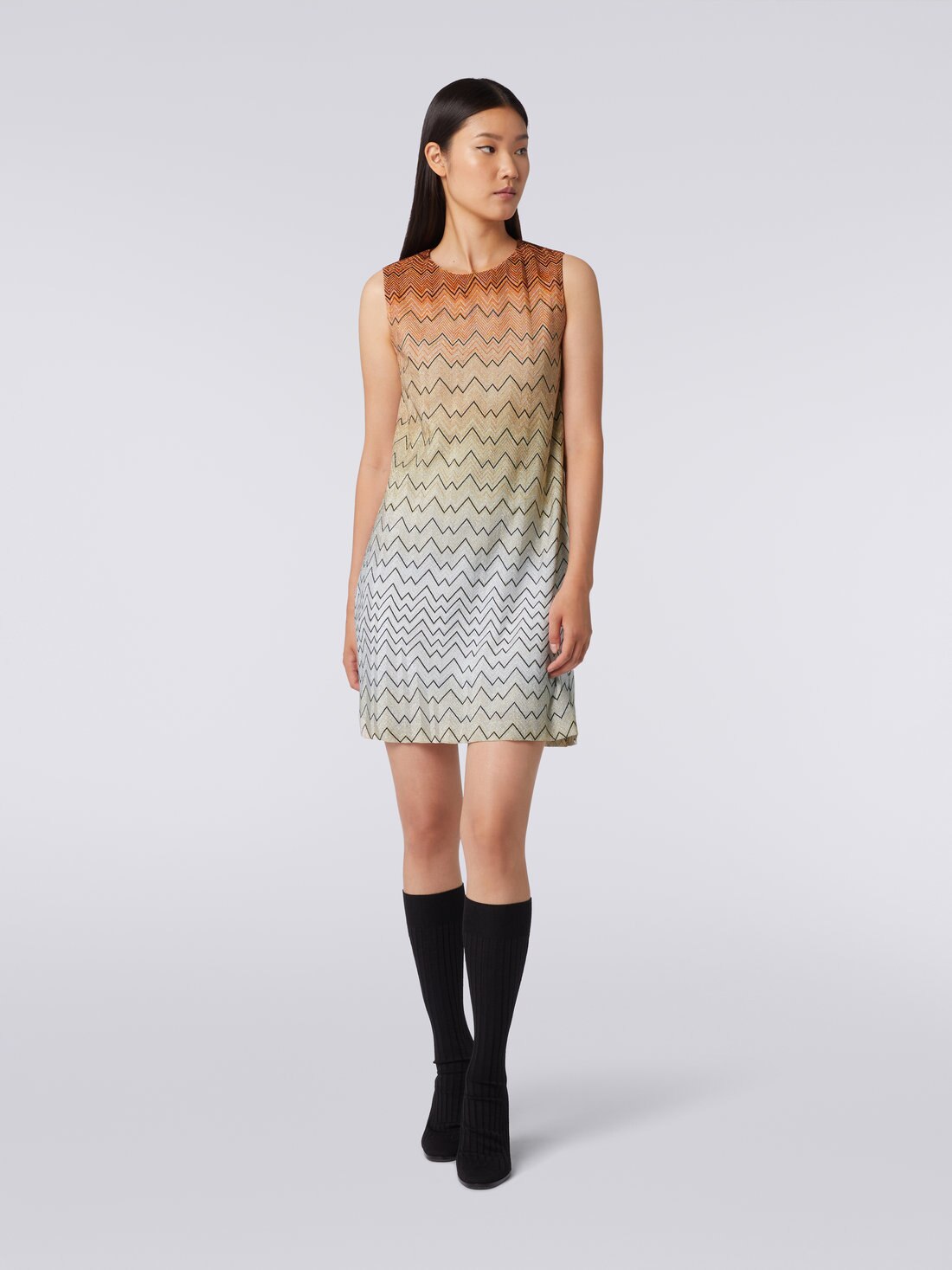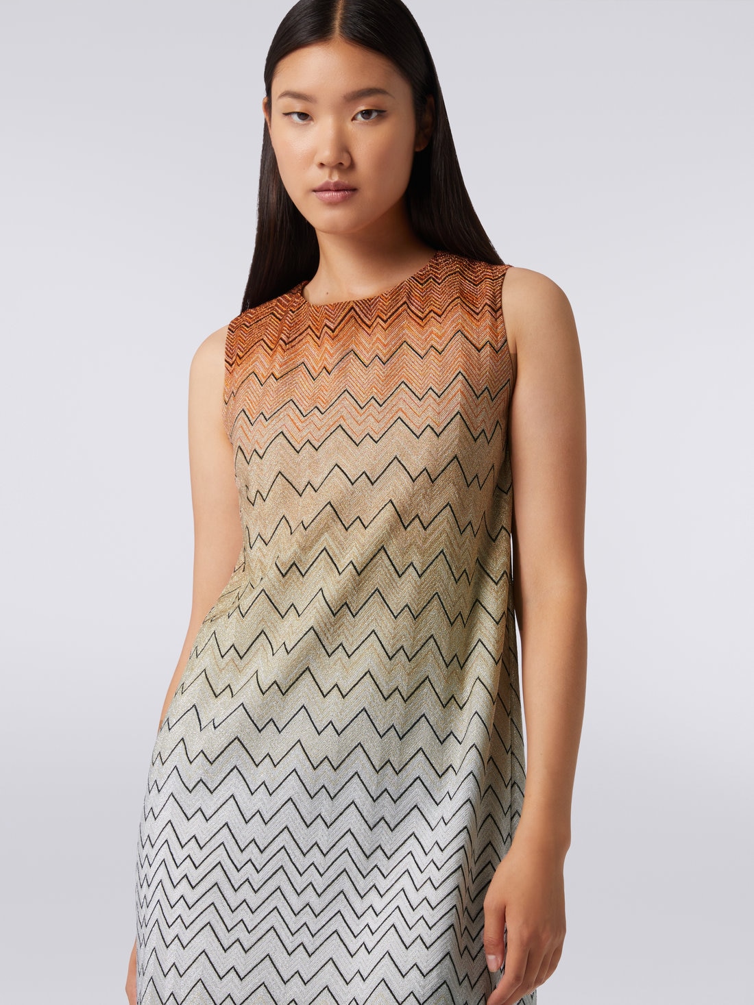 The unique raschel knit, which is grafted onto the dégradé zigzag motif, characterises the women’s short viscose knit dress with lurex. The straight piece, with refined sensuality, has a relaxed fit.