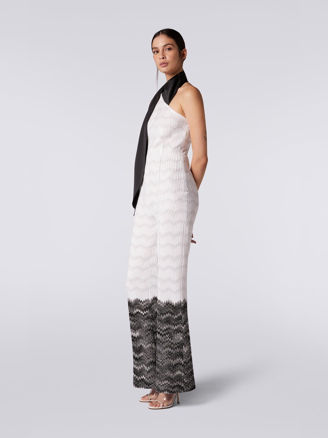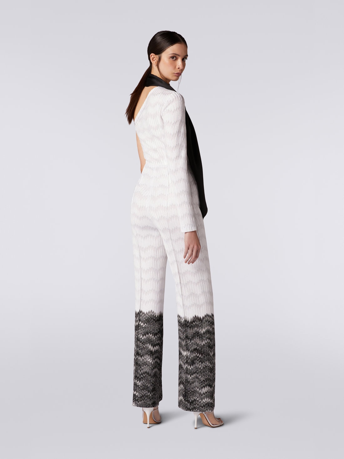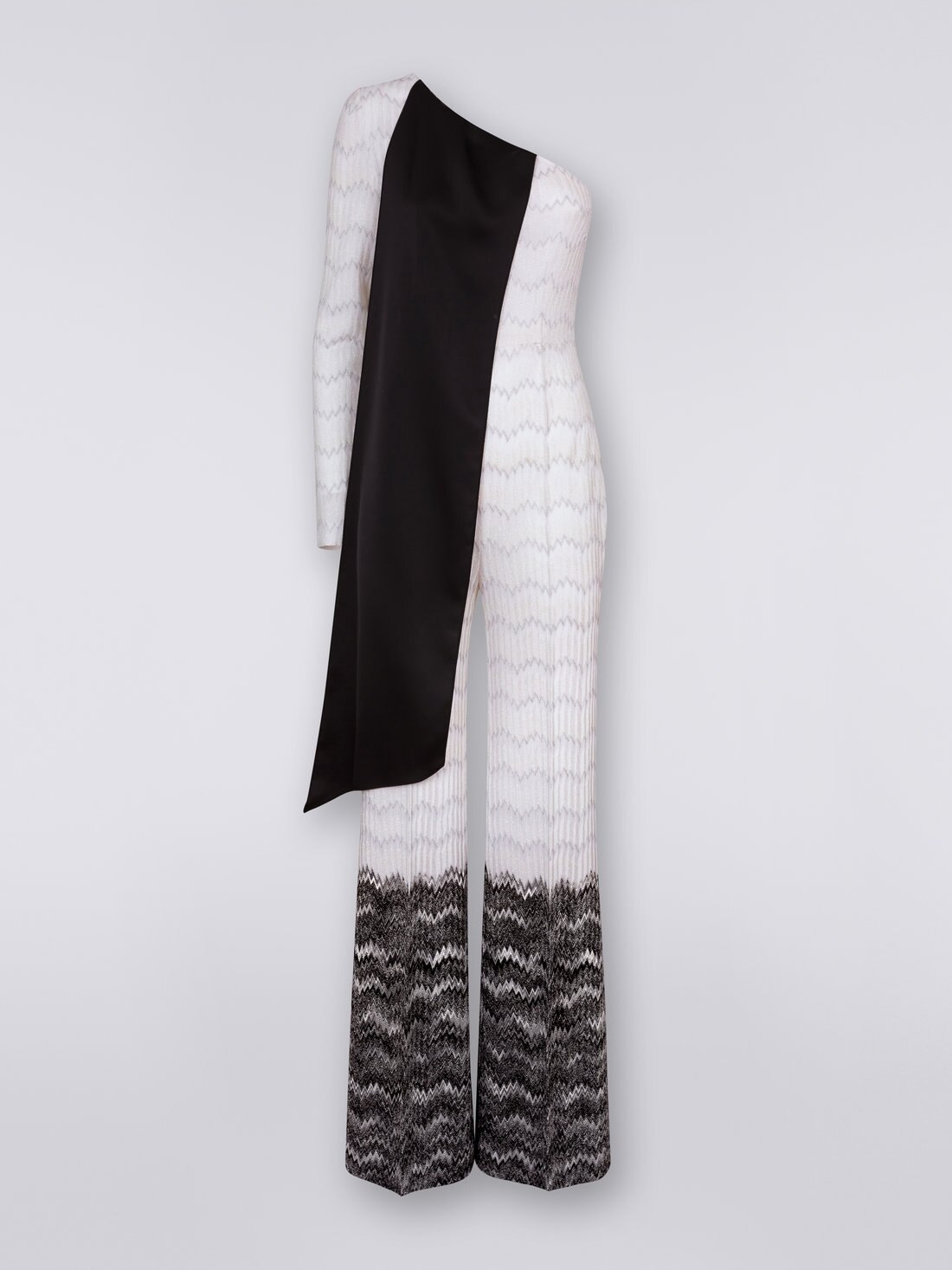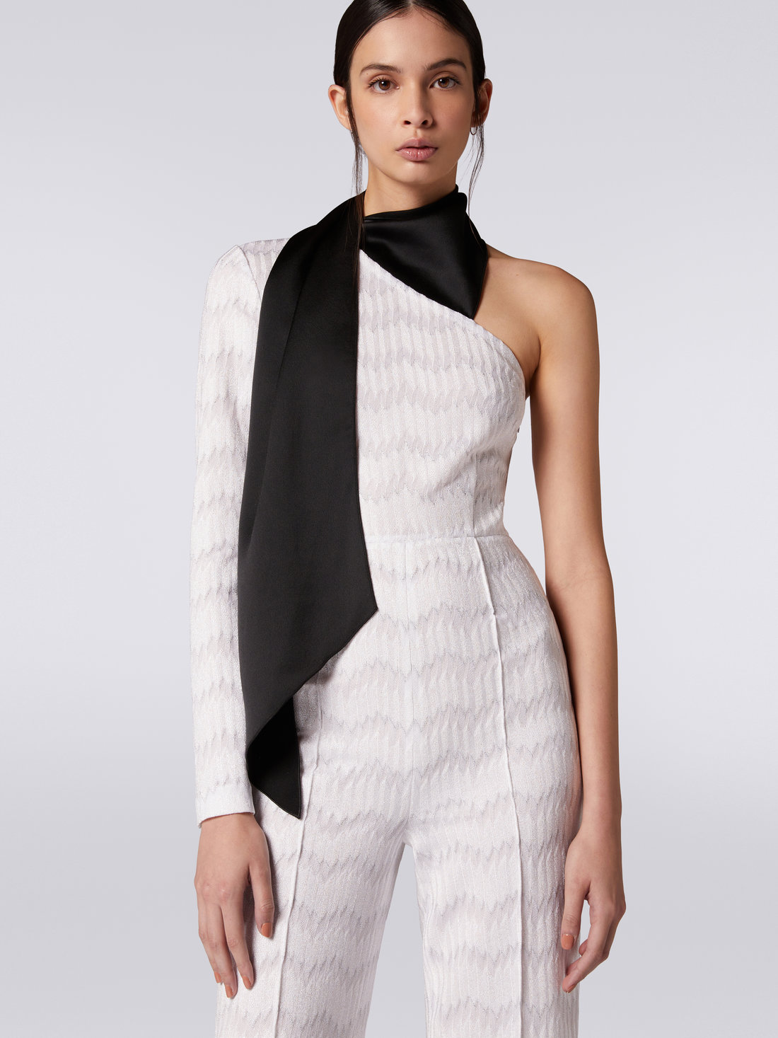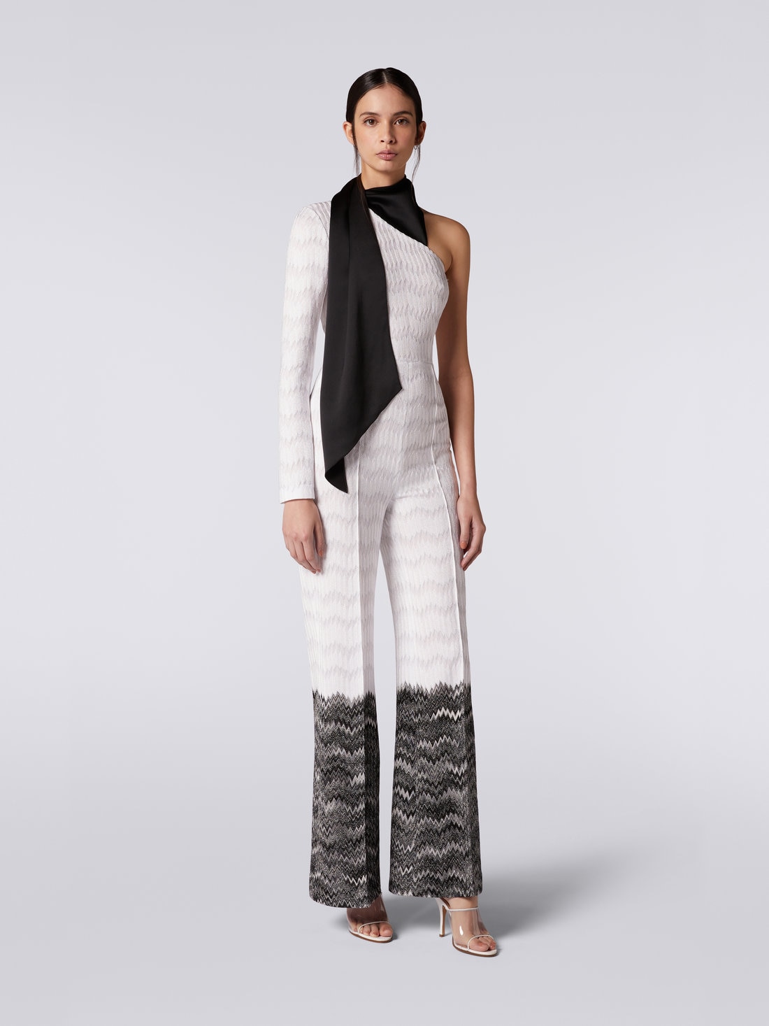The women’s viscose blend knit jumpsuit with snake motif lit by lamé yarn boasts an asymmetrical design that leaves one shoulder uncovered and makes use of the contrast of the sash to wrap around the neck. The contrasting colour hem enhances every detail of the piece with tailored construction, straight trousers and concealed side fastening.