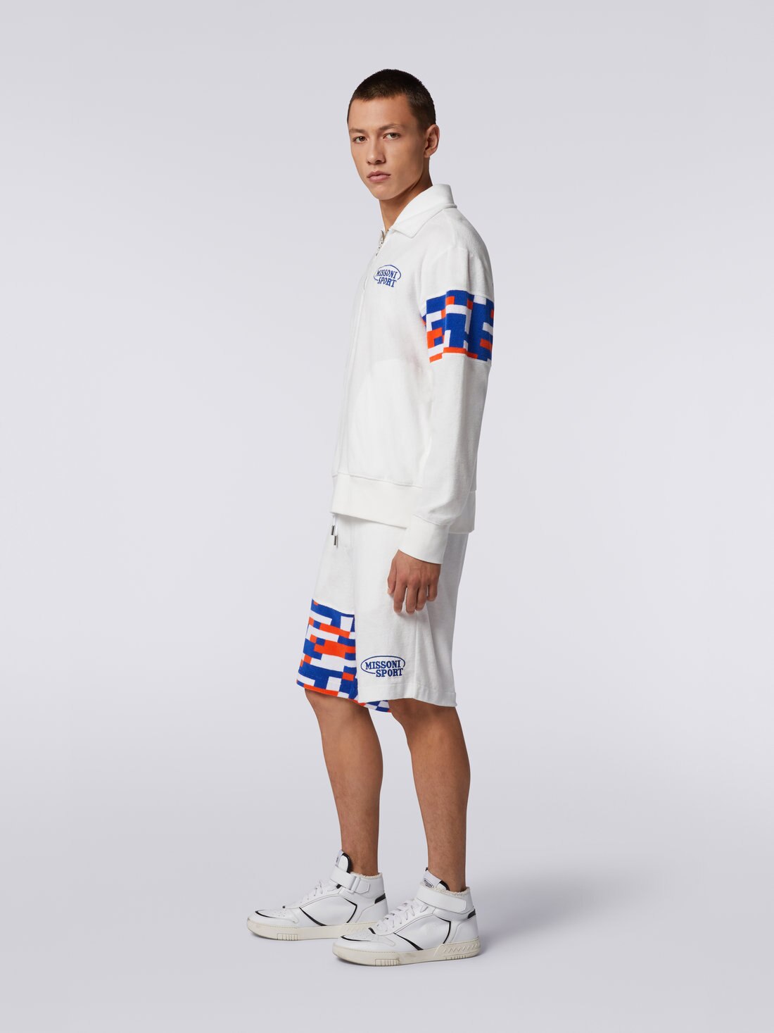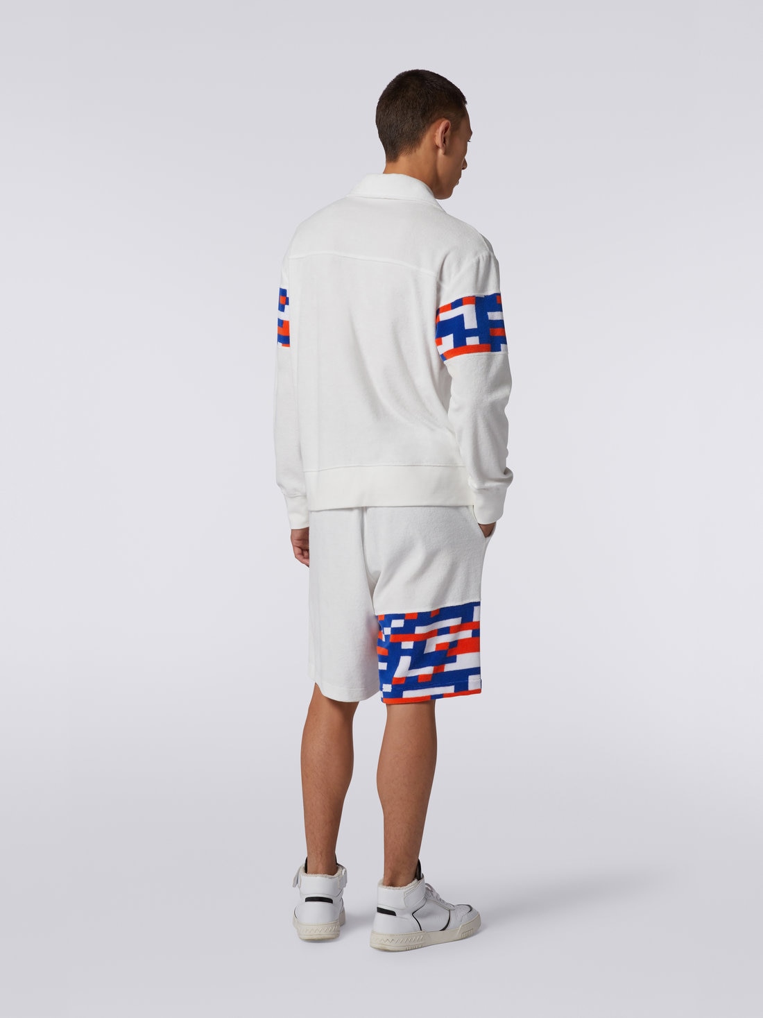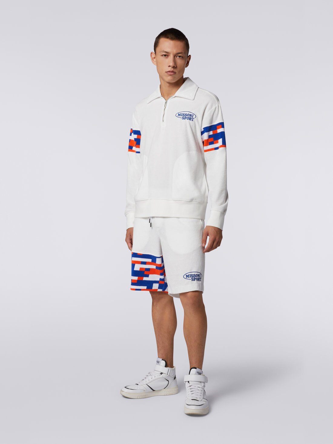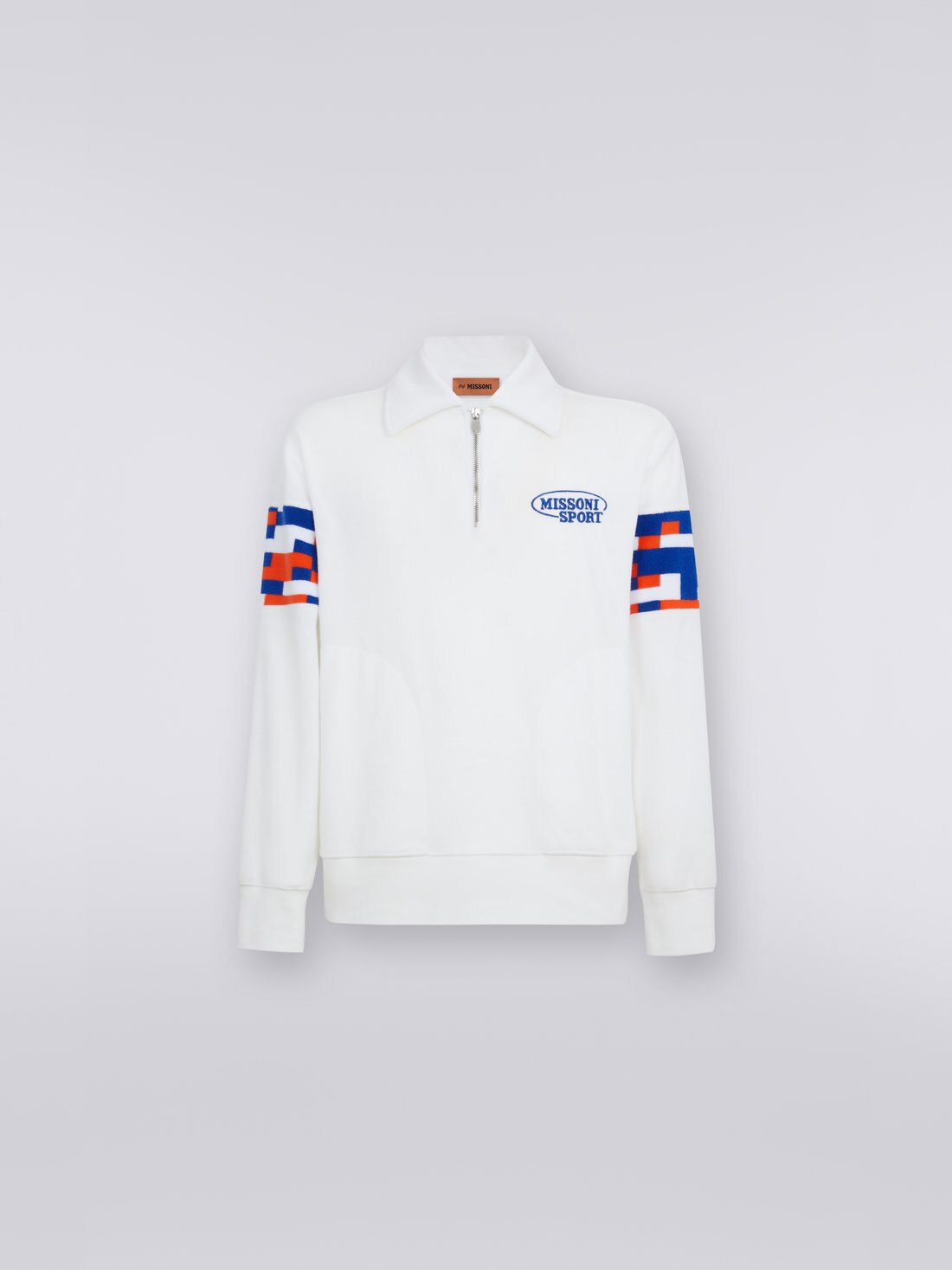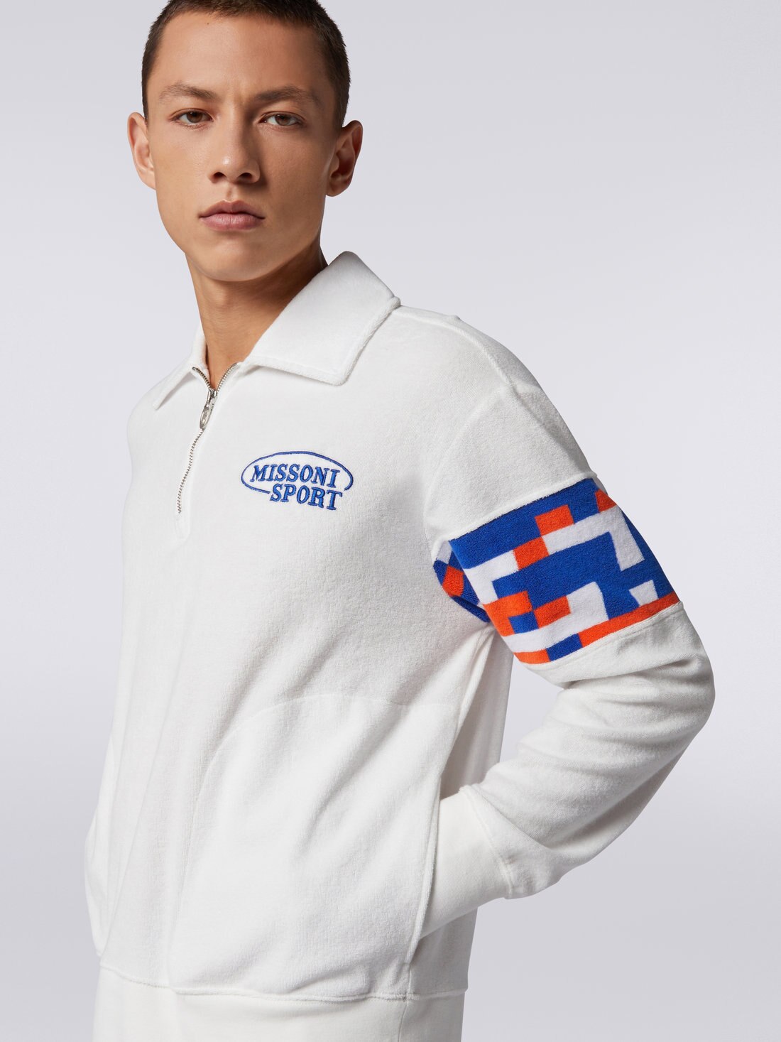 Soft cotton blend terry cloth gives shape to the latest men’s sweatshirt: a contemporary reinterpretation of a sportswear classic with Missoni flavour. Featuring multicoloured pixel effect inserts, the piece features a half zip collar, embroidered logo and side pockets.