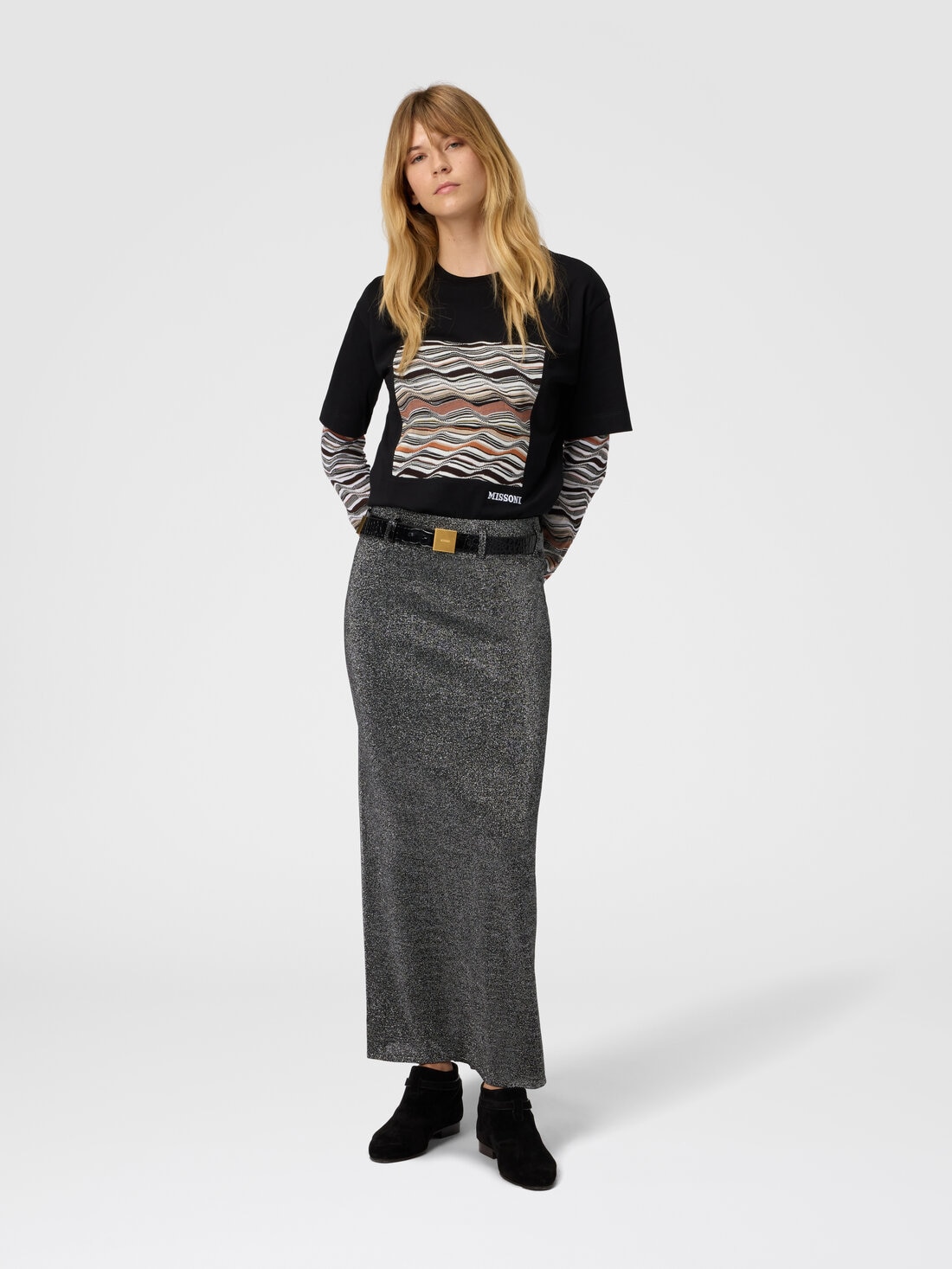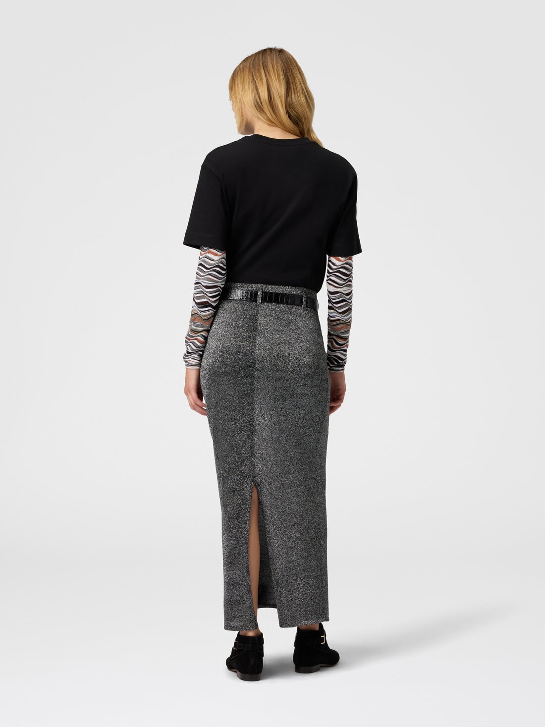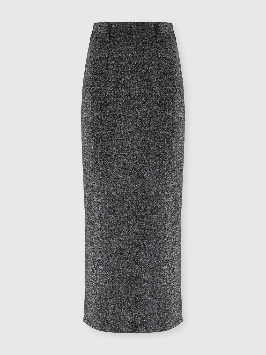 Women’s pencil skirt with essential and impeccable cut, enhanced by fine vanisé workmanship in viscose blend with lamé threads that give it an elegant glow. The back slit adds comfort and a touch of discreet femininity, making it ideal for sophisticated and refined outfits.