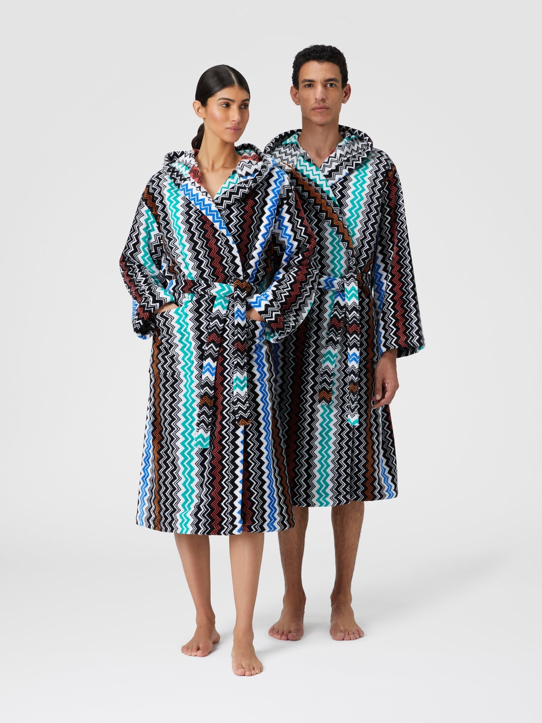 Neoclassic, the MissoniHome bathrobe, stands out for its iconic zigzag pattern. The wrap-around hood, waist belt and ample patch pockets complete the garment.