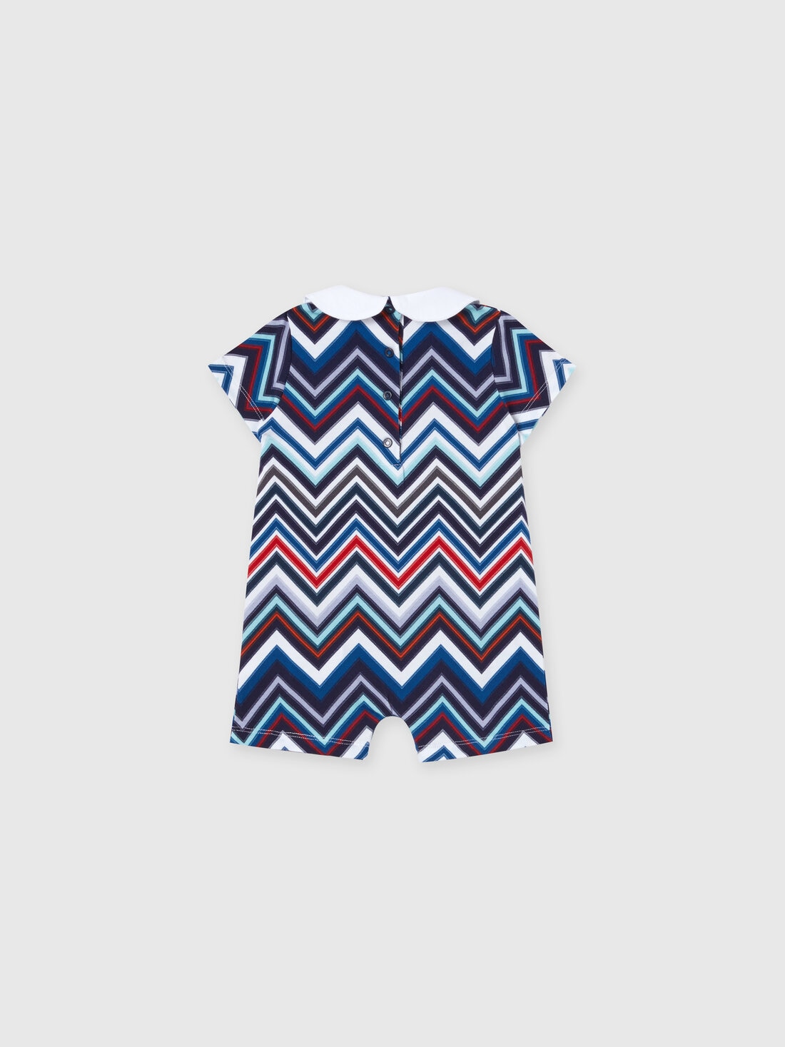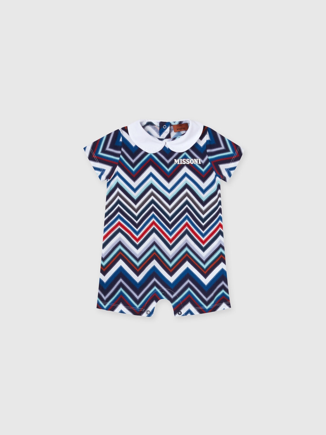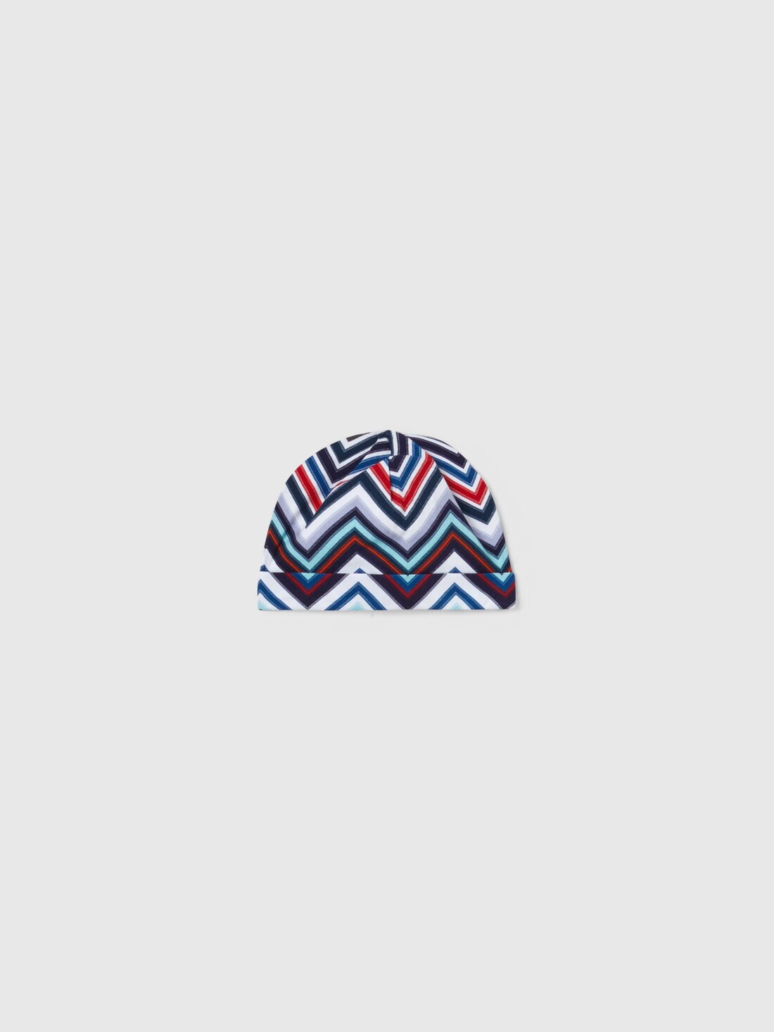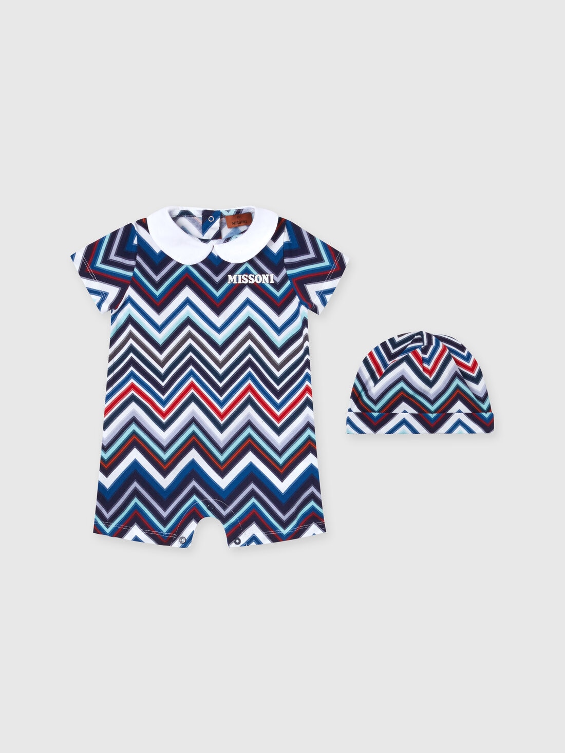 The Missoni two-piece set with jumpsuit and docker hat is made of soft stretch cotton. The garments display all over the brand's signature, the chevron pattern. The design is completed by a plain-coloured rounded collar and contrasting logo lettering.