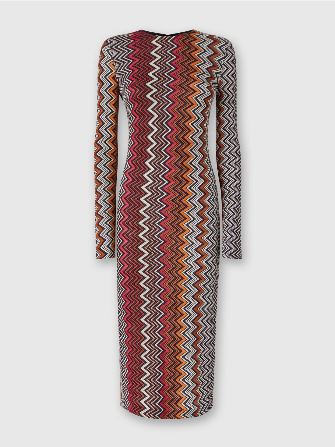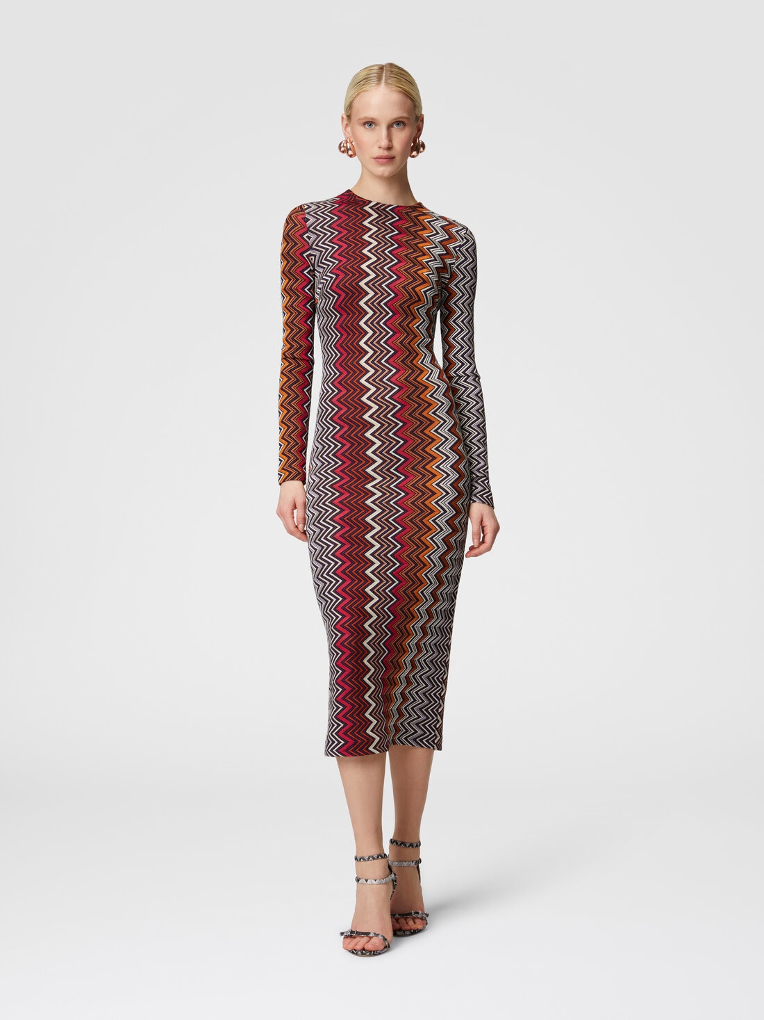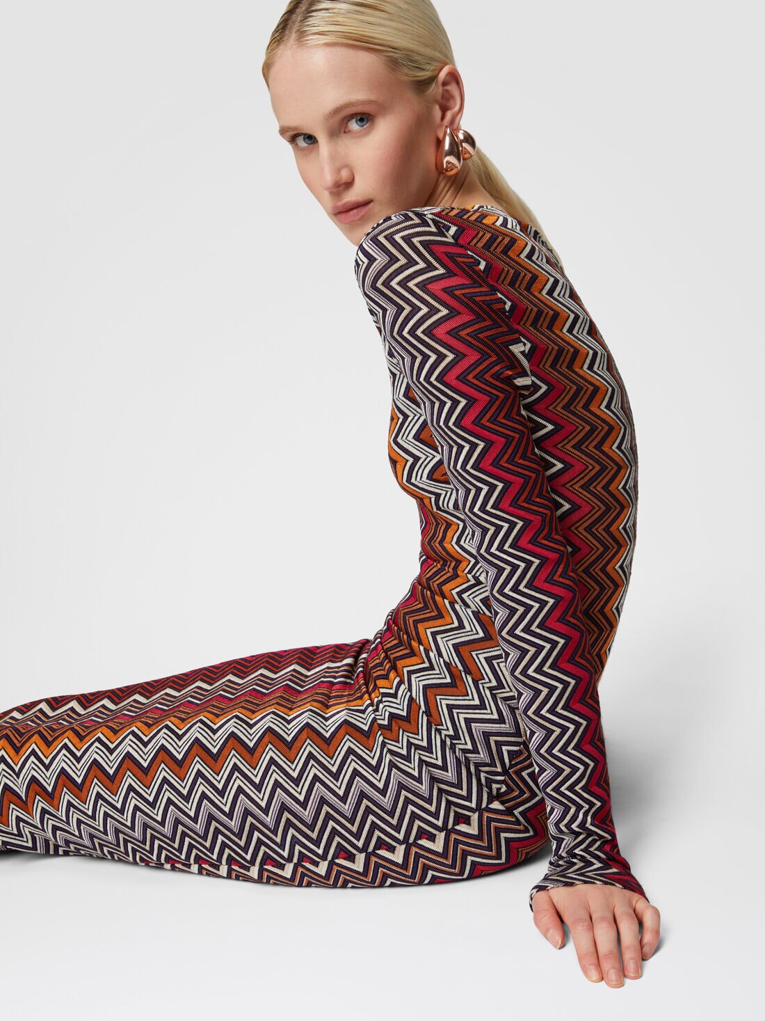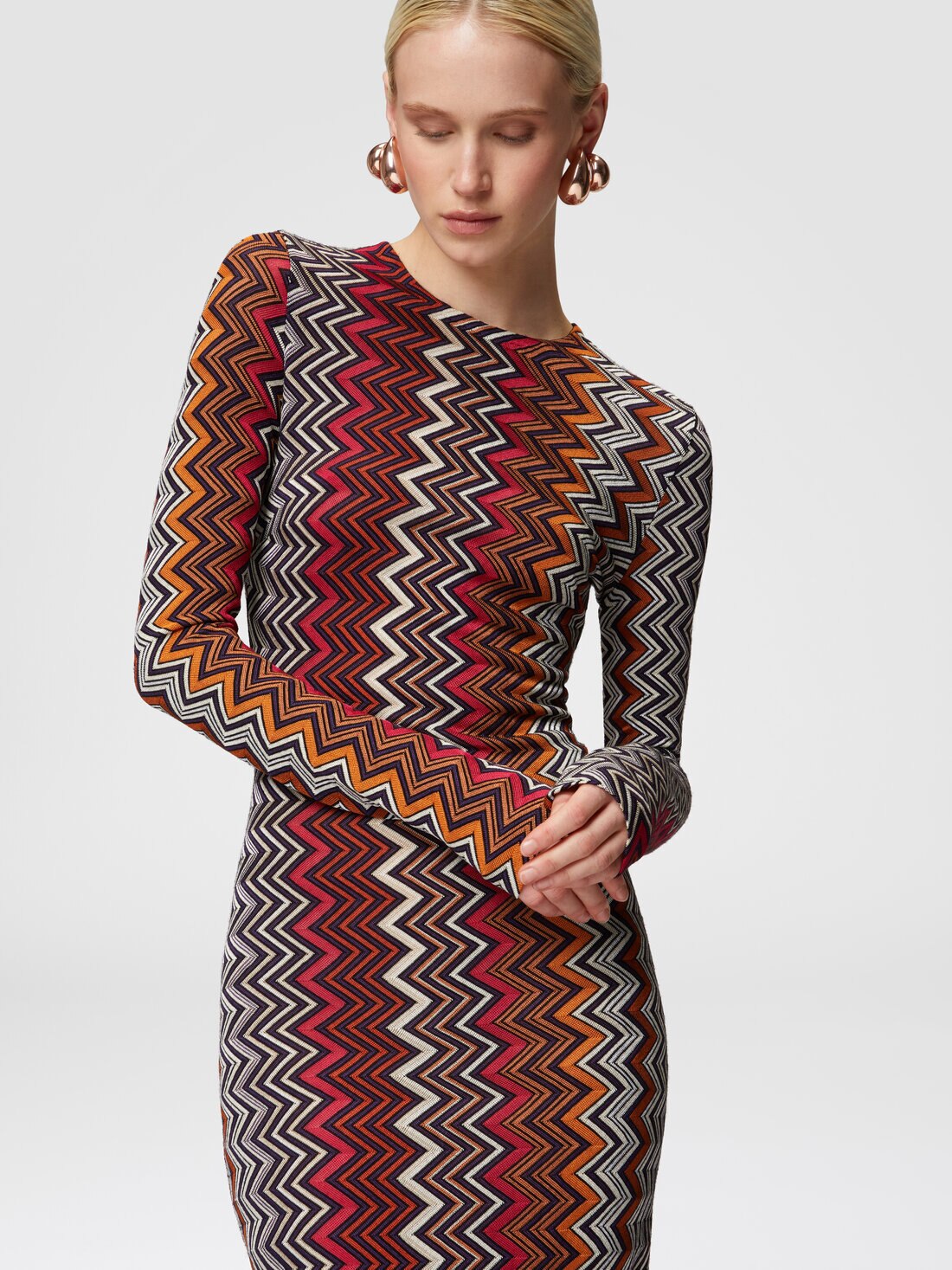 The long-sleeved zigzag midi dress is illuminated by the skilful raschel workmanship, which guarantees the blend of viscose and wool a glossy/matte finish perfect for giving a new touch to the daily look.