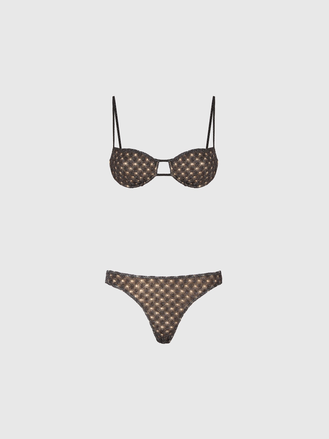 Revisiting the maison’s iconic codes with refined elegance, this women’s balconette bikini in lamé viscose features a raschel lace workmanship with a spiderweb motif that plays with light and texture.