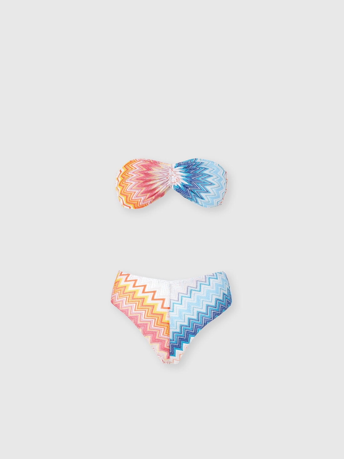 The Missoni bandeau bikini, crafted from a viscose blend with a degradé lamé zigzag pattern, expresses the sophisticated essence of the brand. The bandeau top, which is delicately tied at the back of the neck, and the matching high-waisted brief, stand out for the brilliance of the lurex that lights up the raschel fabric. A design that combines chromatic dynamism and refinement.