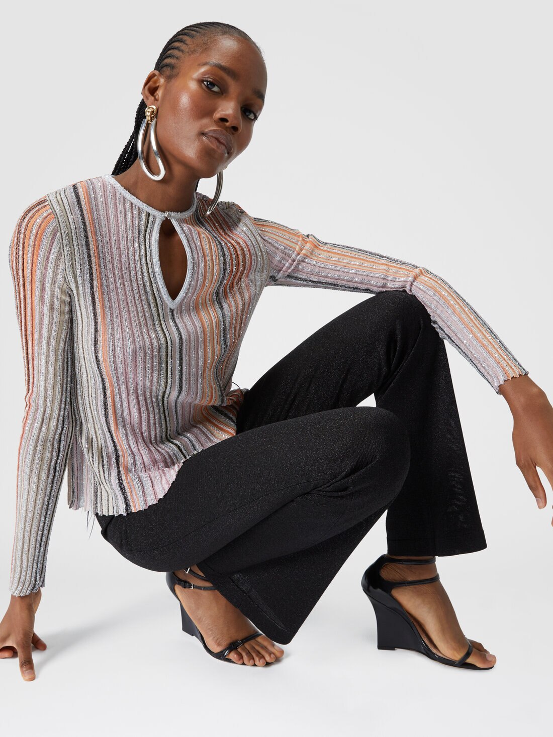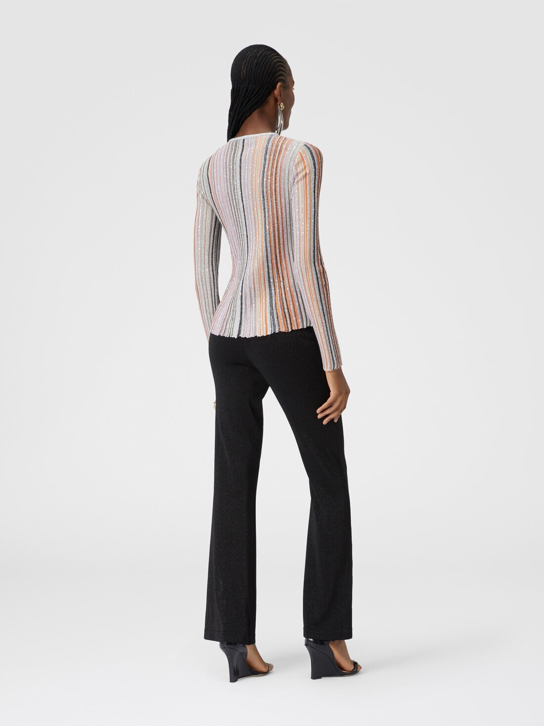 The knitted straight trousers, a timeless model at the base of the most disparate outfits, acquire, thanks to the Missoni touch, a precious côte: thanks to the viscose yarn lit up by the lamé.