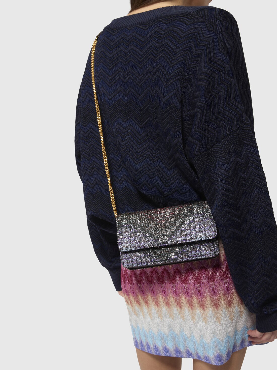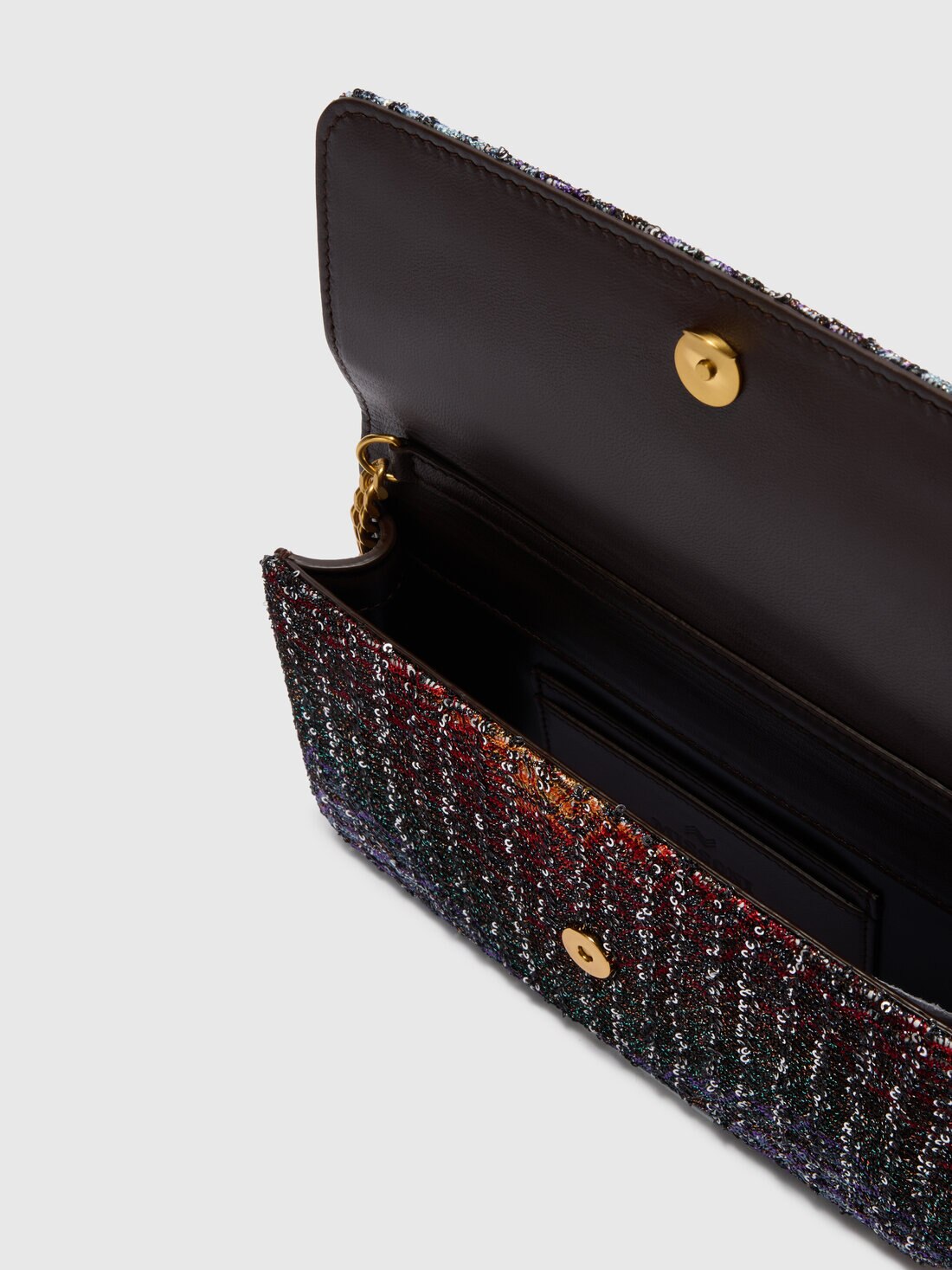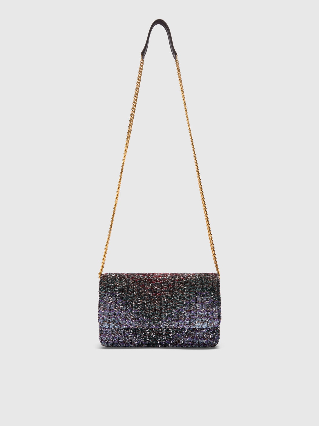 This women's wallet on chain is made of leather and fabric with sequin appliqué. The design is characterized by luminous reflections that enhance the surface, while the adjustable strap allows for a customizable fit. A refined and functional accessory, perfect for adding a distinctive touch of light to any look.
