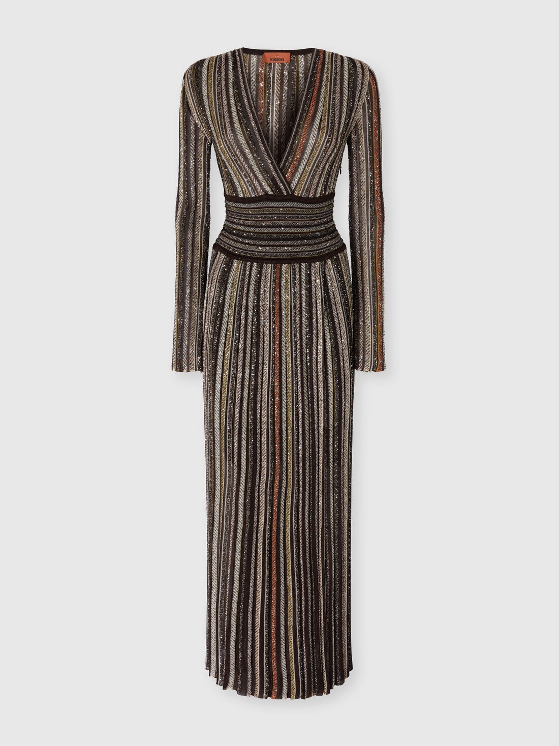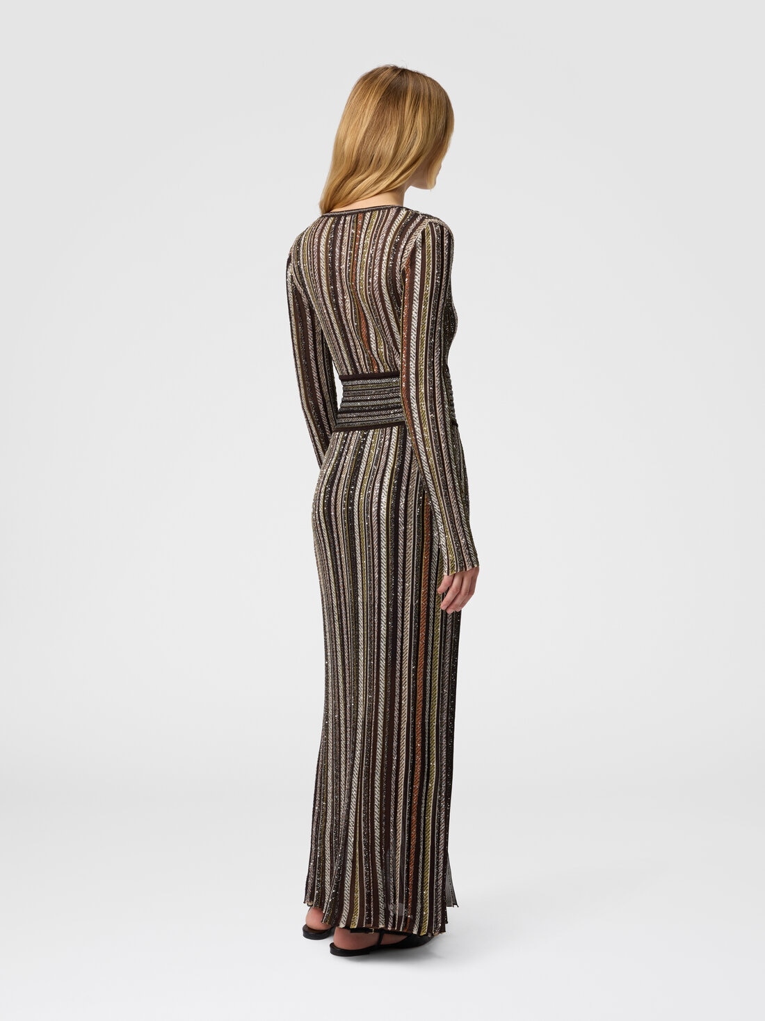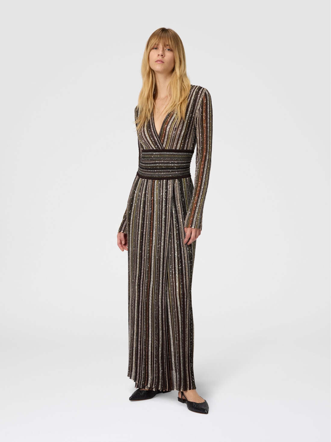 Crafted in a sophisticated viscose-blend knit with vertical stripes, this long dress features a deep V-neckline. Accented by the sparkle of applied sequins, it enhances the figure with its feminine design.
