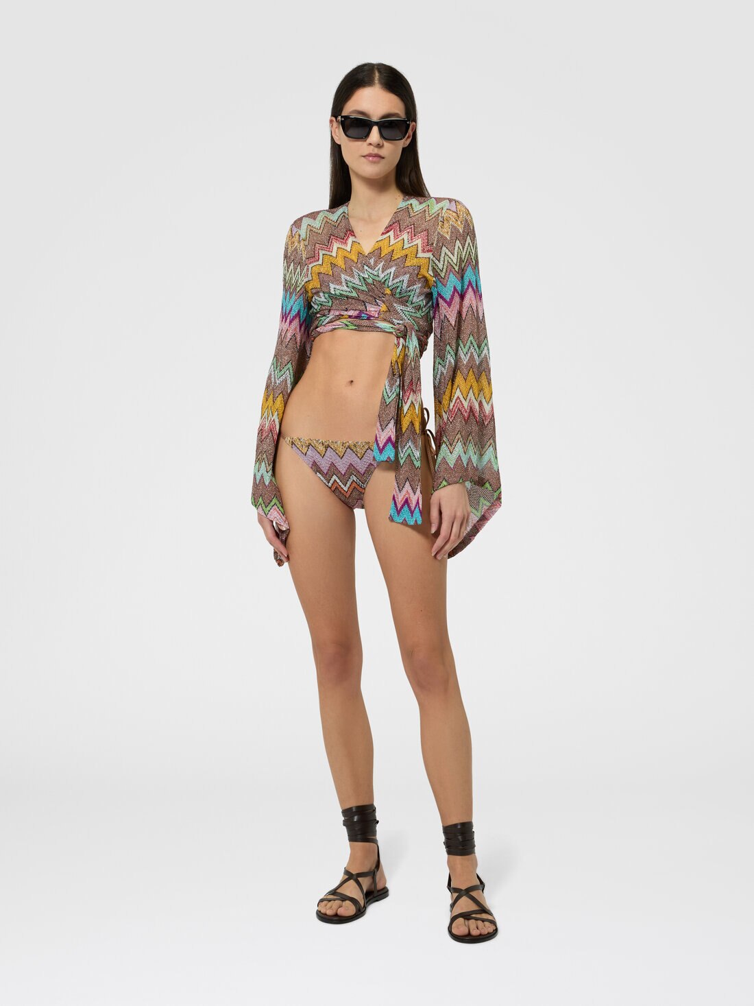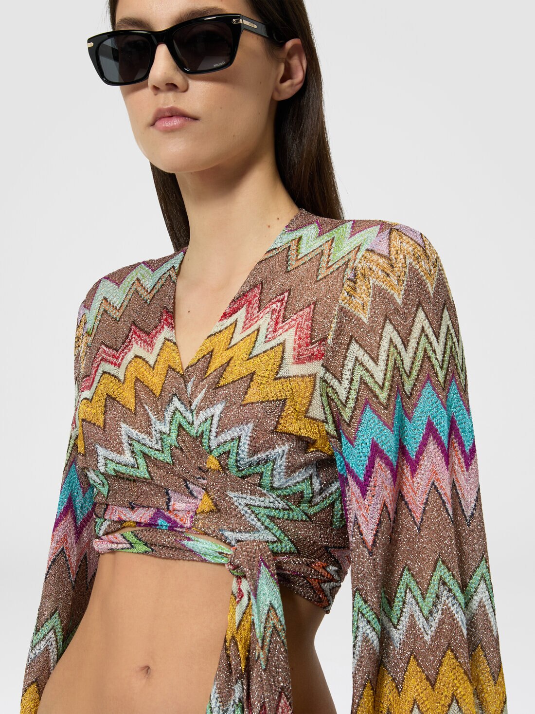 Long-sleeved wrap top in lamé viscose with macro zigzag pattern