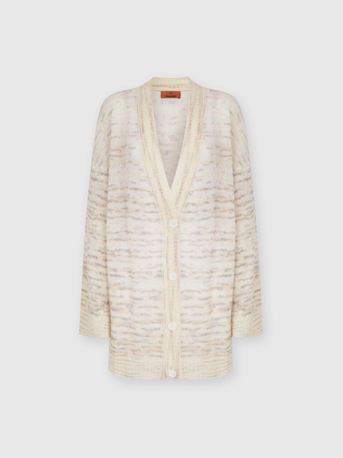 A refined and very light yarn of viscose, alpaca and wool characterizes the oversized cardigan on which Missoni experiments with a discreet and incomparably chic tie-dye.
