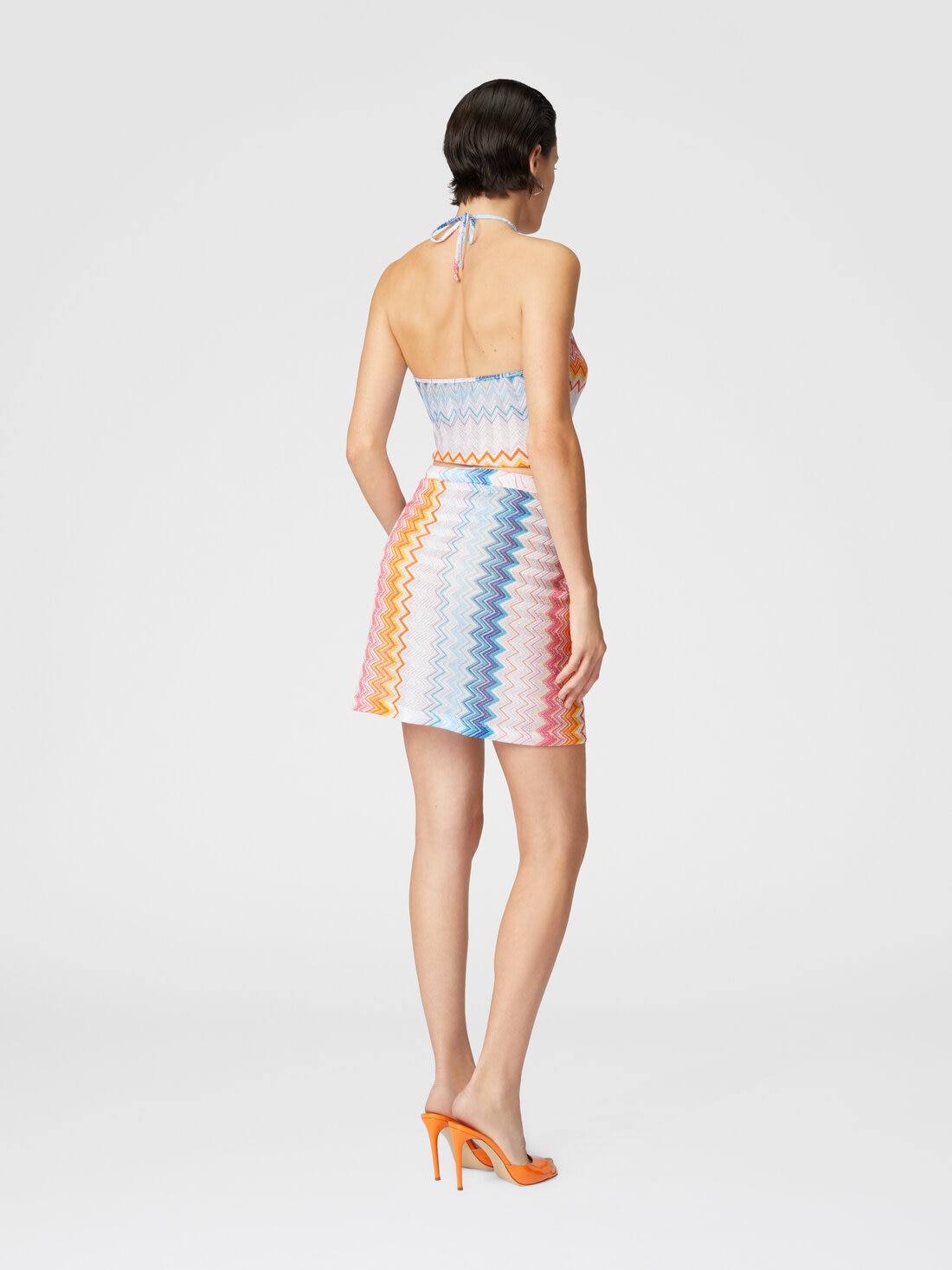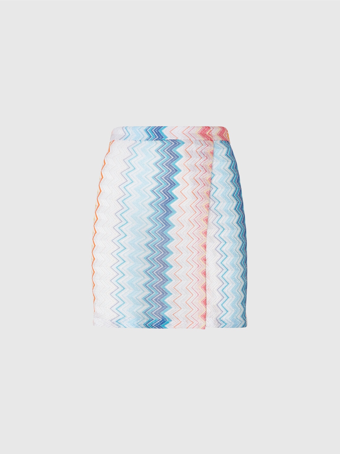 The viscose-blend sarong mini skirt is an explosion of light and movement. The metallic reflections of the lamé illuminate the surface of the fabric, creating a lively contrast with the dynamic lines of the zigzag pattern.