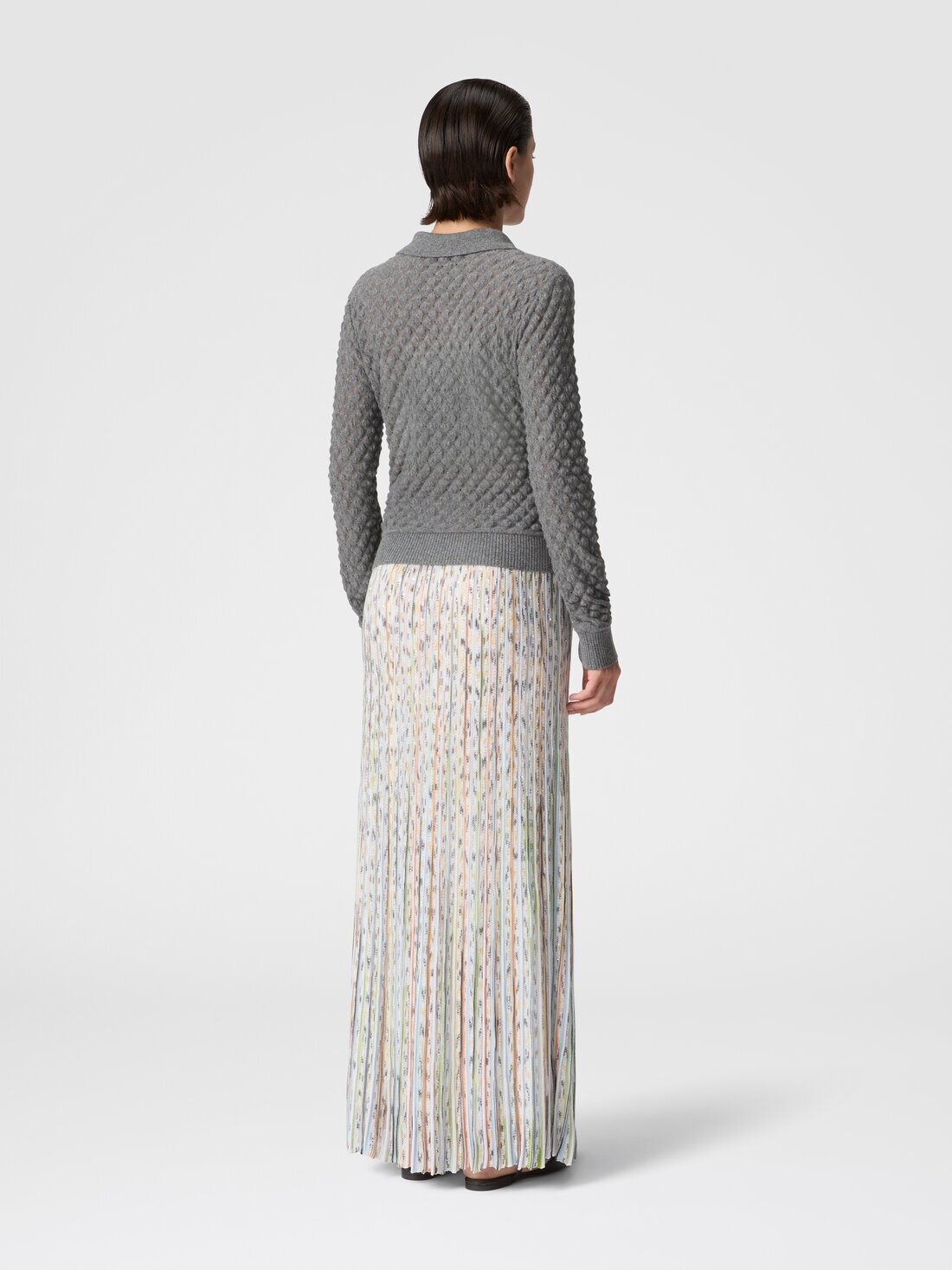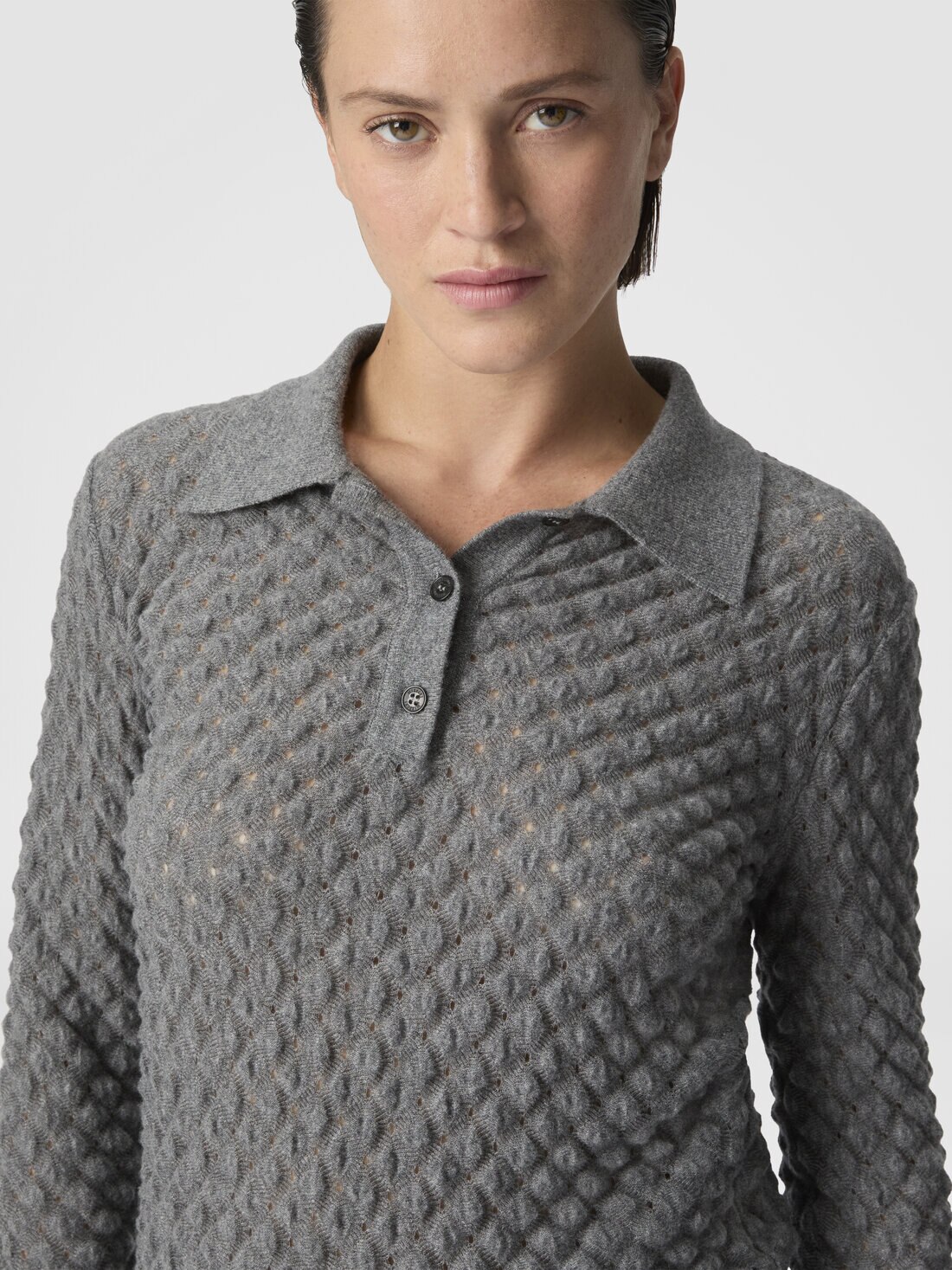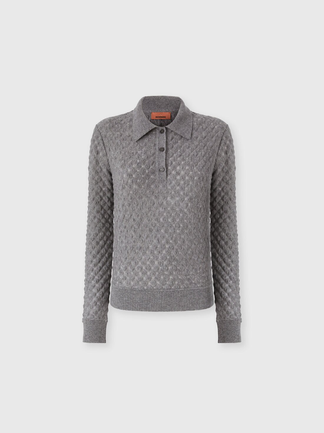 Women’s polo in 100% cashmere, embellished with raschel workmanship and a lace motif that creates a refined play of textures. The lightness and softness of the yarn give the piece a sophisticated and contemporary allure, expressing Missoni’s craftsmanship and distinctive style.