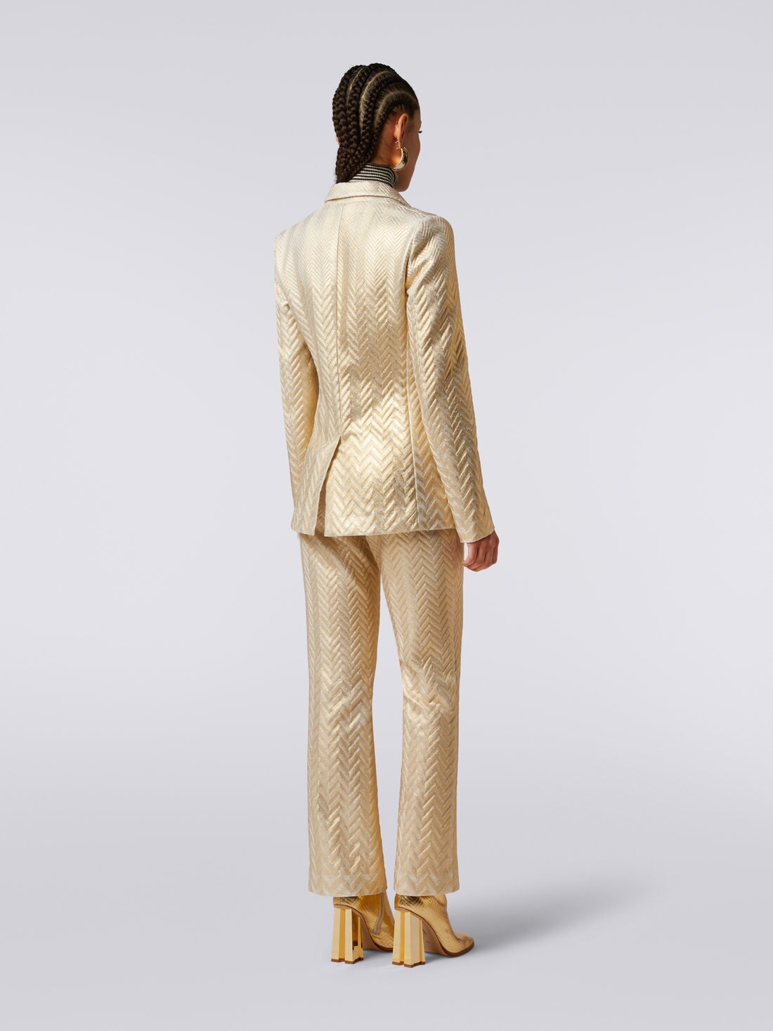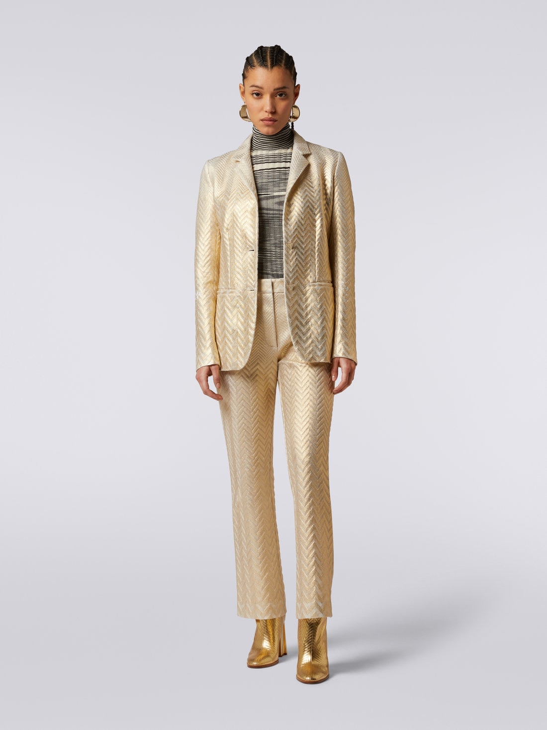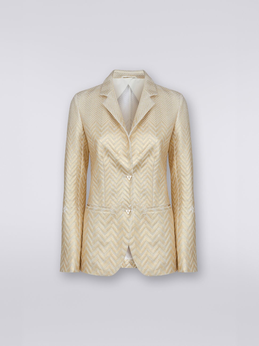 The viscose and cotton zigzag blazer is an elegant style statement. Featuring sophisticated raschel technique, the single-breasted piece offers a contemporary and distinctive design. The shiny finish adds a touch of sophistication to the garment, giving it an aura of elegance.