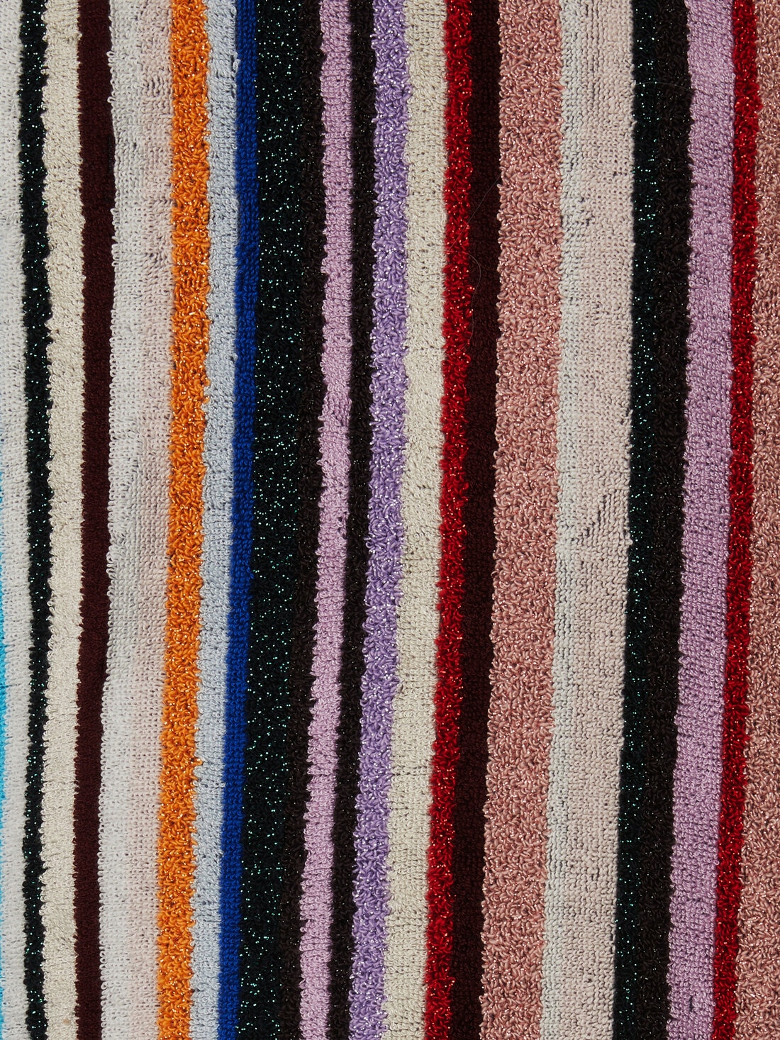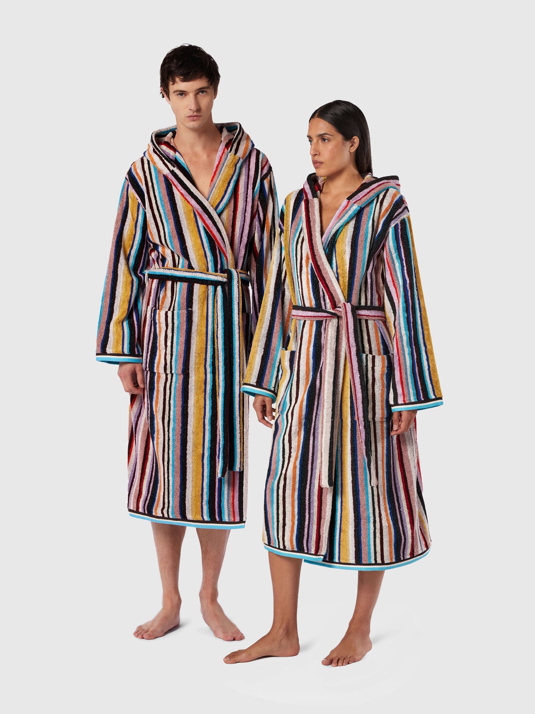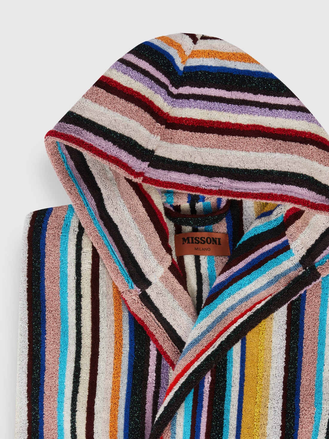 The Chandler cotton terry bathrobe combines luxury and liveliness. With its surface brightened by the glow of lurex, the garment offers a contemporary take on the classic bathing dressing gown. The vibrant stripes add a touch of colour and personality, while the waistband and patch pockets offer practicality and comfort. Suitable for both him and her, it is perfect for pampering yourself after a shower or bath in style and comfort.