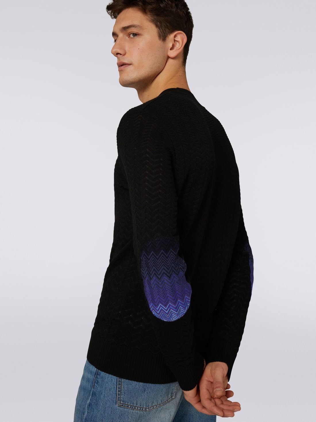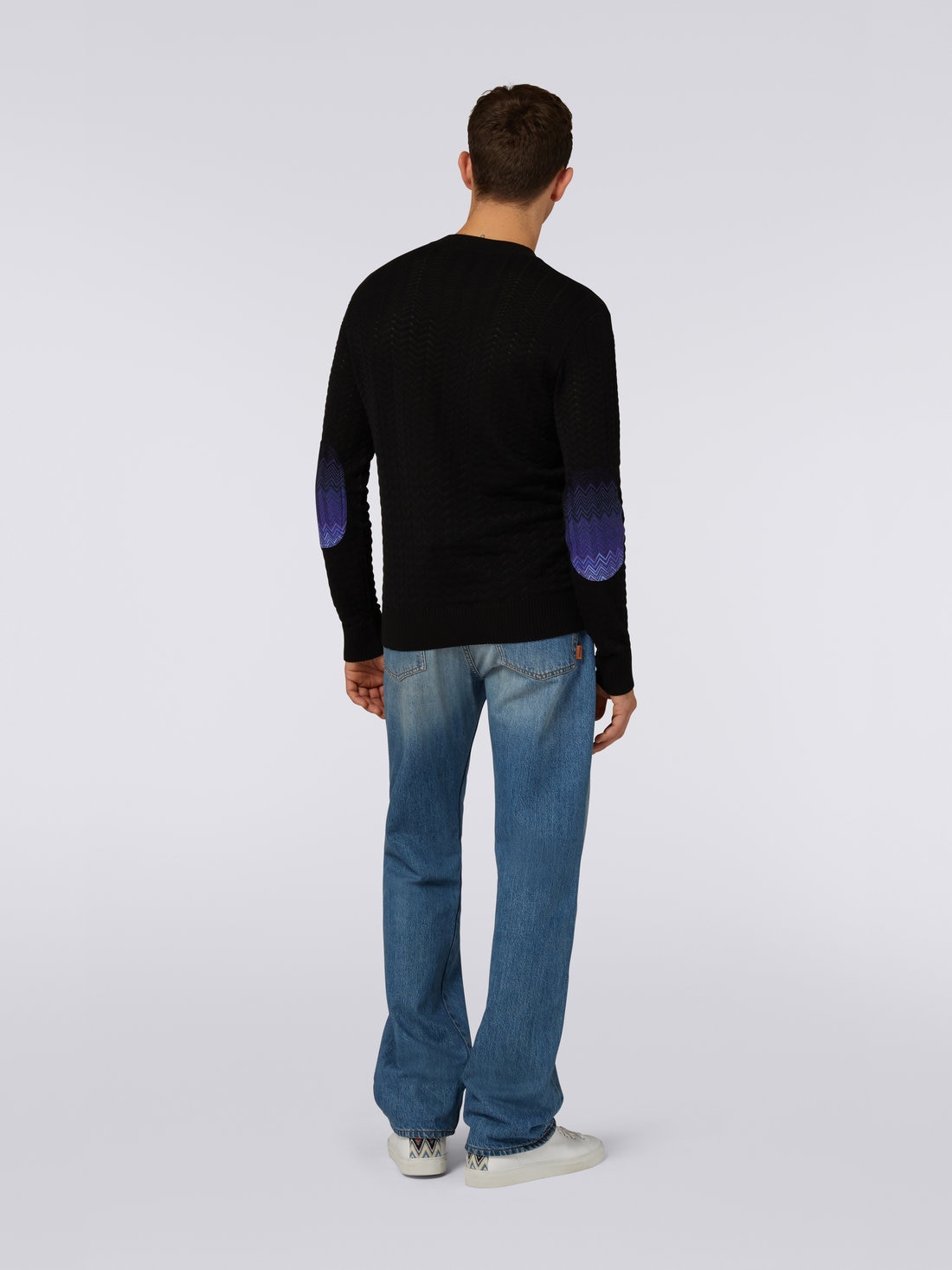 Missoni’s inimitable knitting artistry makes this men’s crew-neck jumper an instantly recognisable garment. The chevron cotton and viscose blend piece is enhanced by elbow patches with a dégradé zigzag pattern.