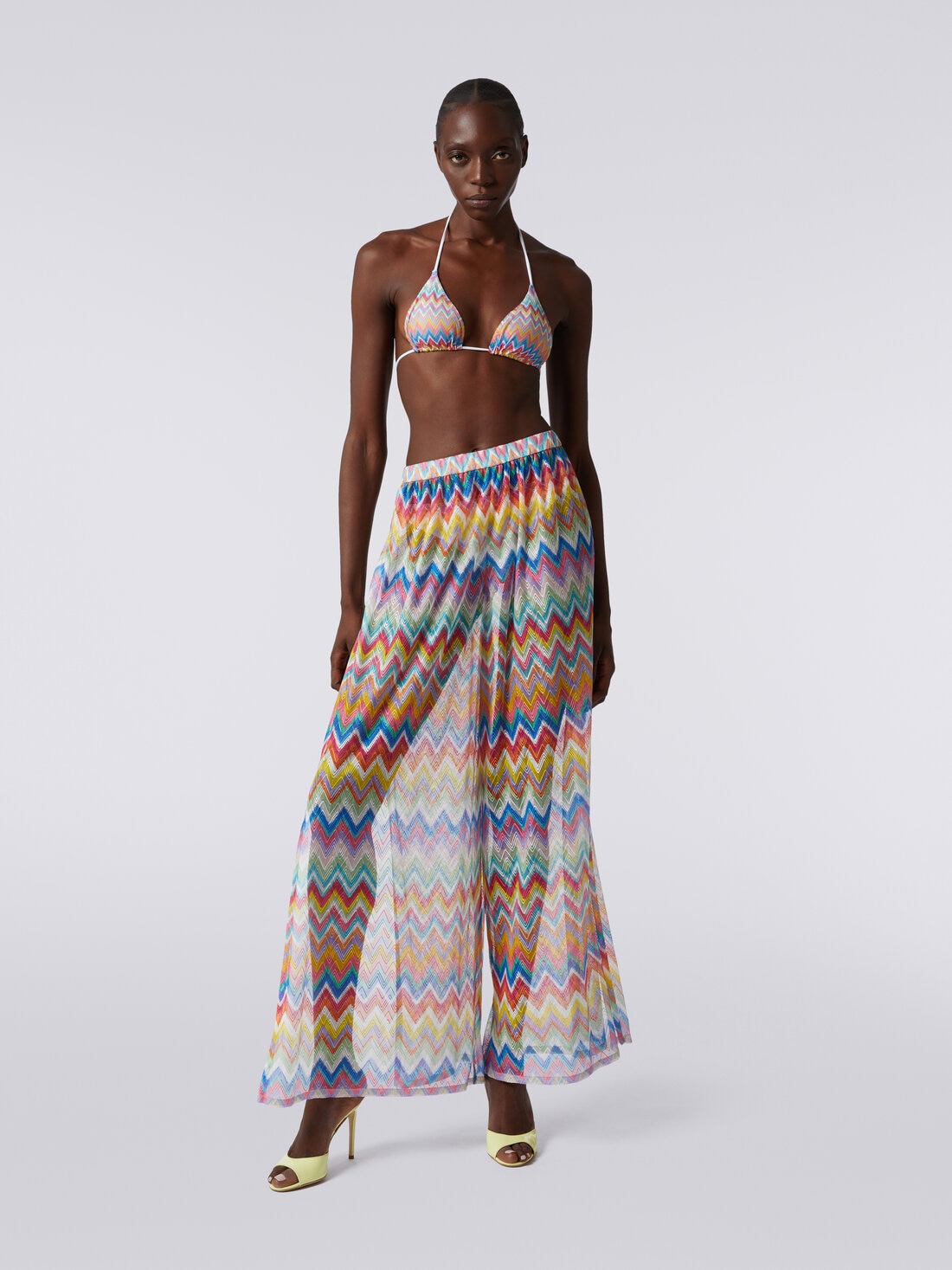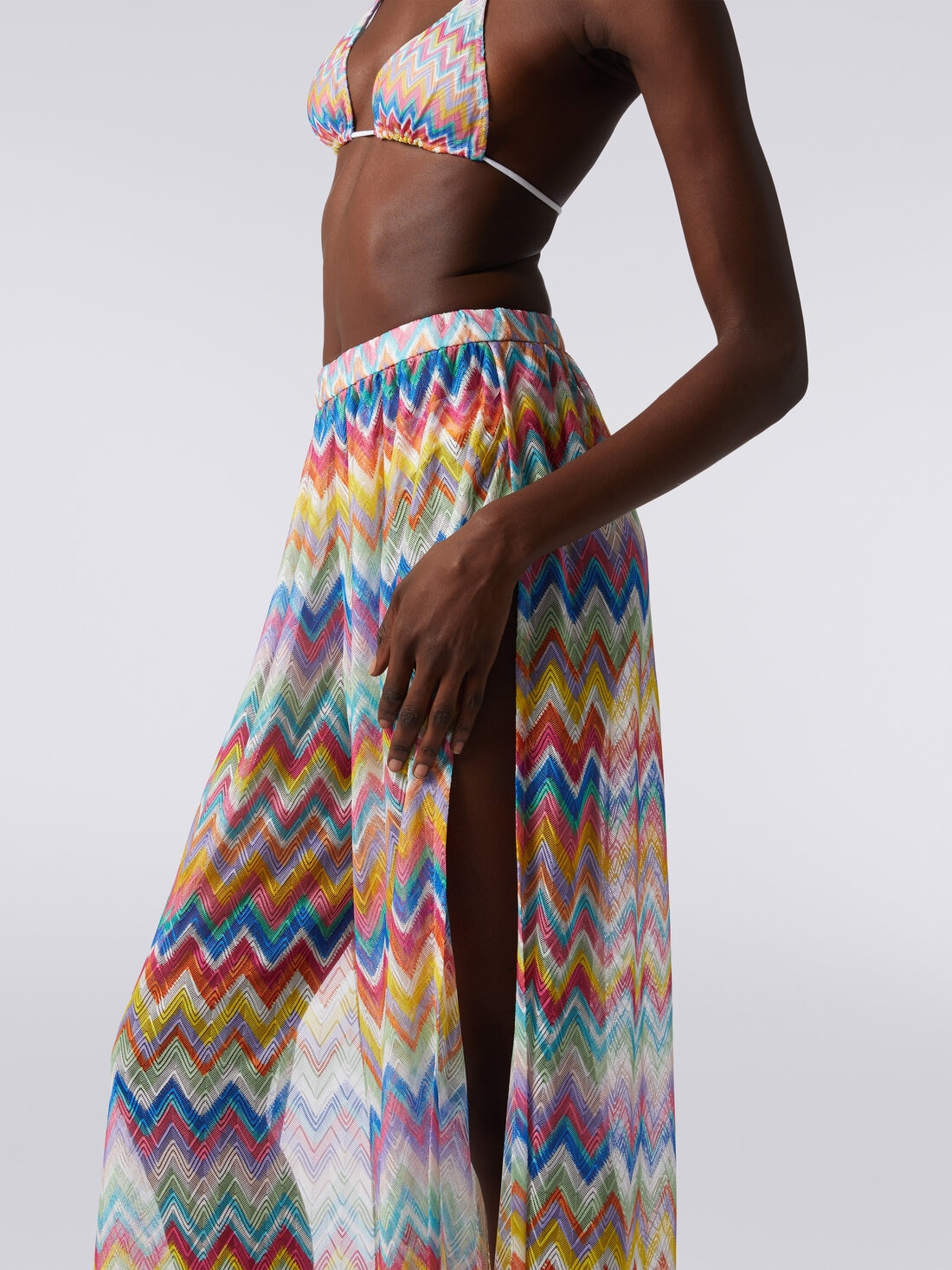 The Missoni zigzag print cover-up trousers feature an elasticated waistband for comfort and fit. The side slits add a touch of sensuality to the look, while the transparency plays with the silhouette in an elegant and intriguing way.