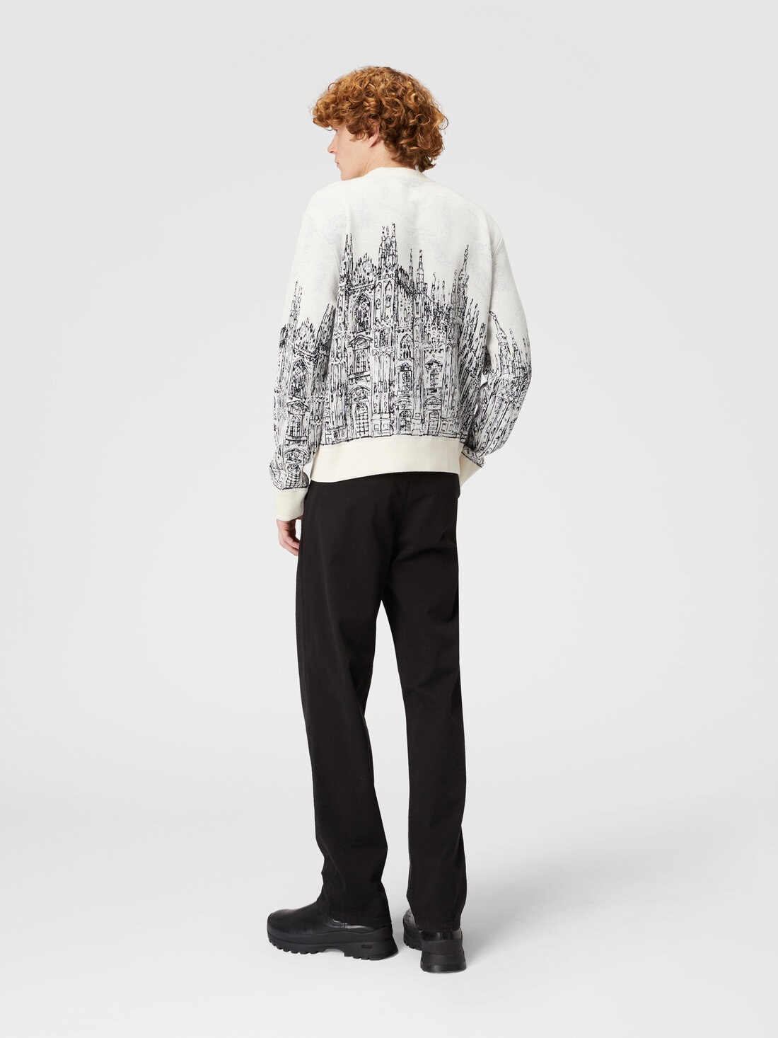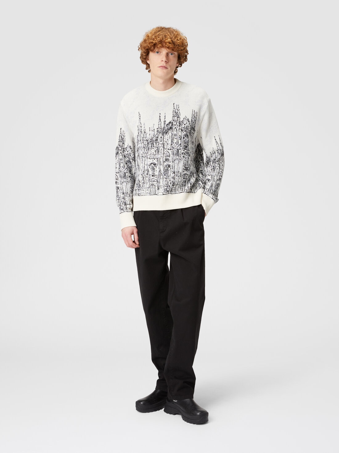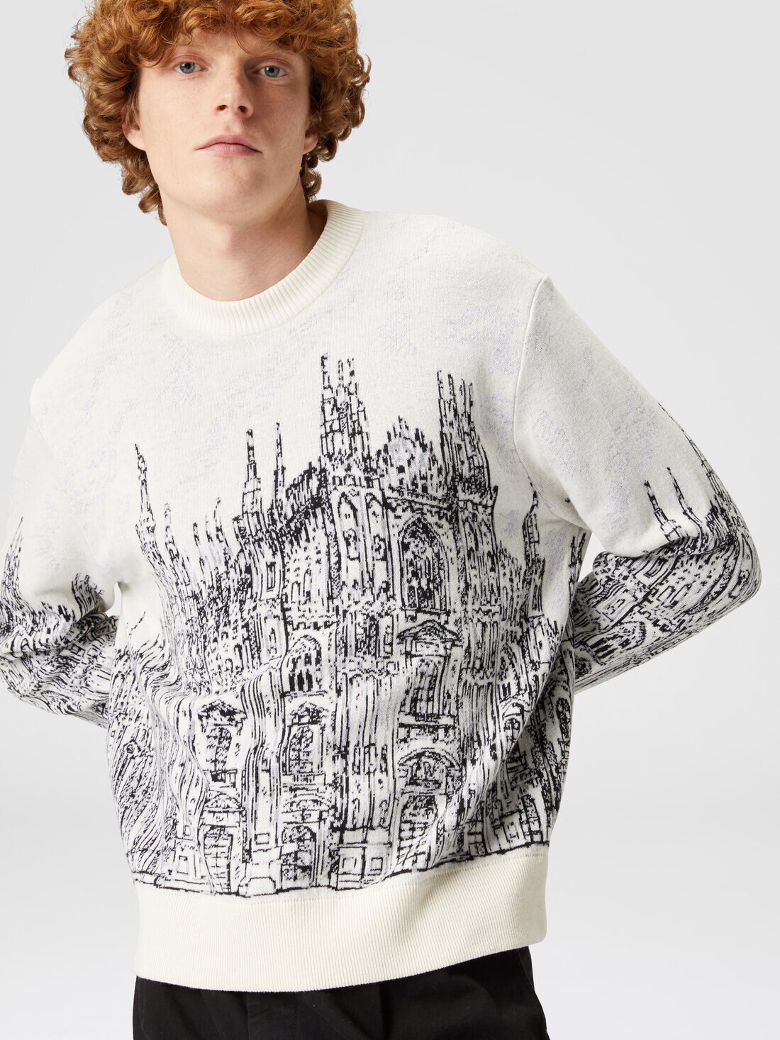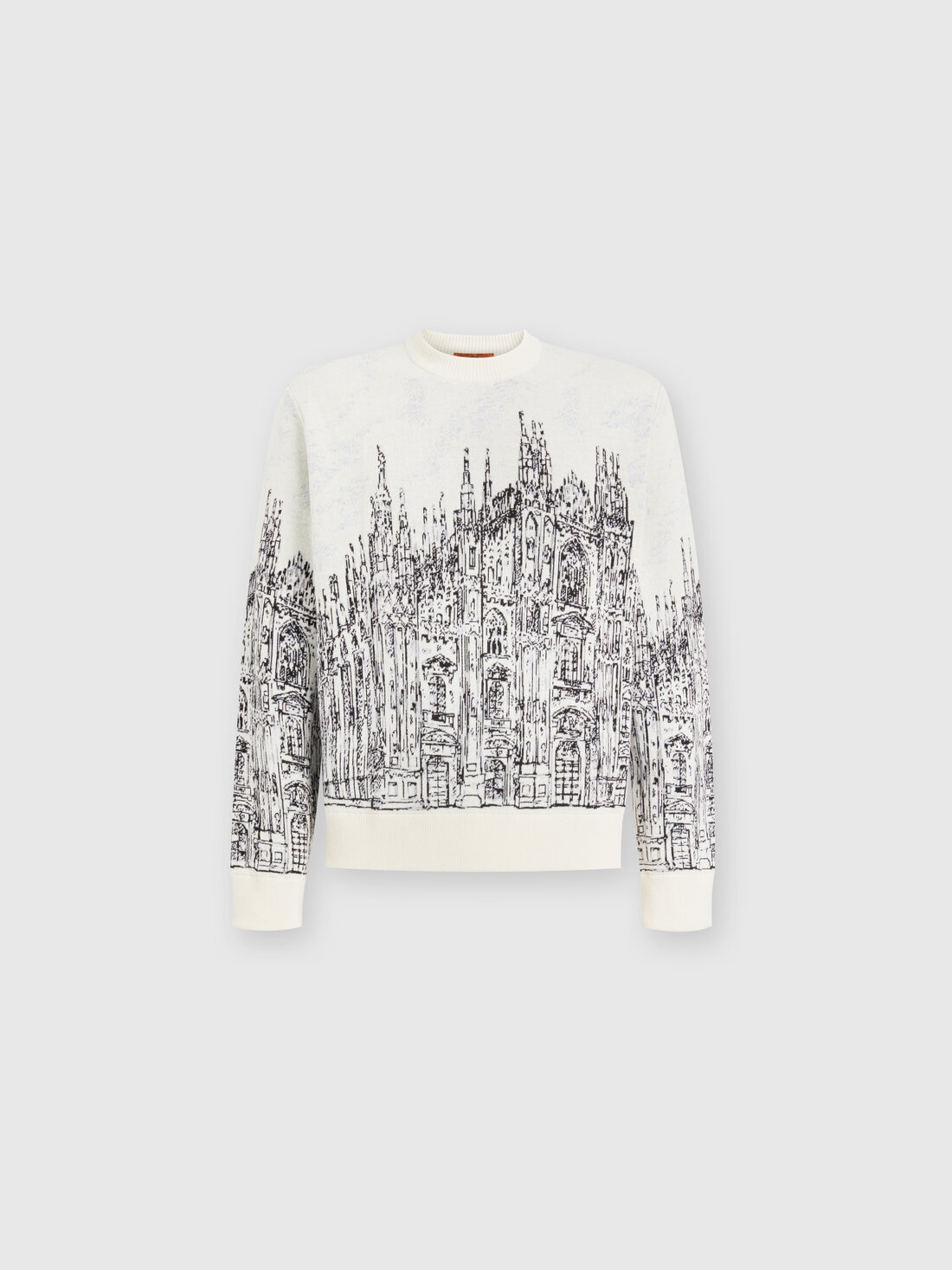 The wisdom with which Missoni masters the jacquard technique means that the crewneck sweater in a cotton blend is transformed into a postcard in the shape of a Milan sweater.