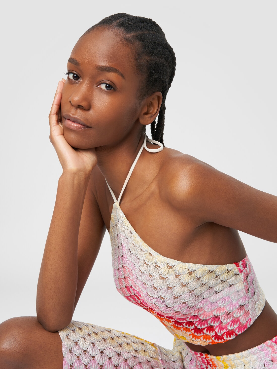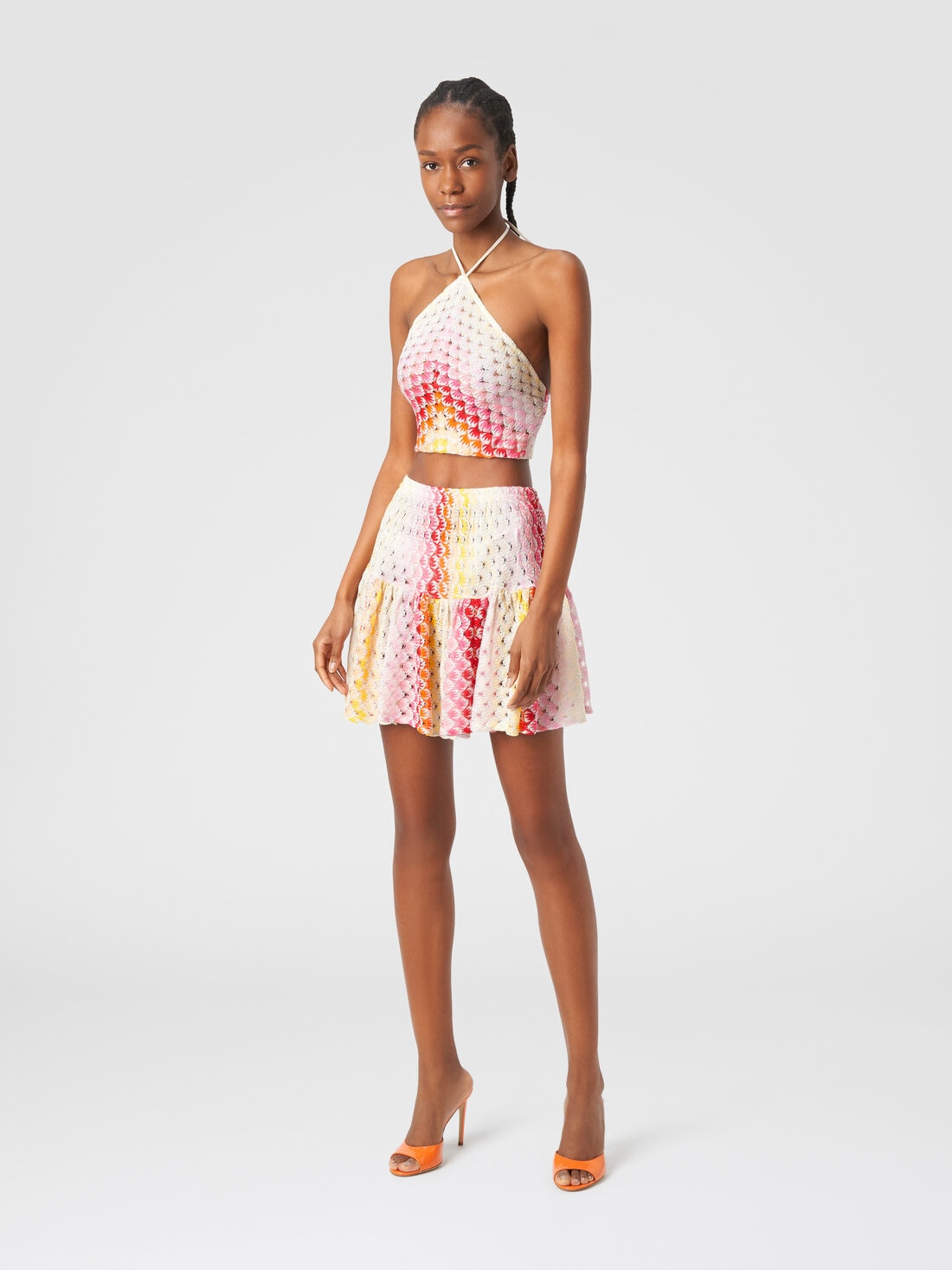 The lace-effect technique that fades, scattering the golden glow of lurex, enlivens the surface of the women’s cover up top in viscose knit. The piece with an American-style neckline, supported by the tie at the back of the neck, is the perfect complement to a romantically feminine beach look.