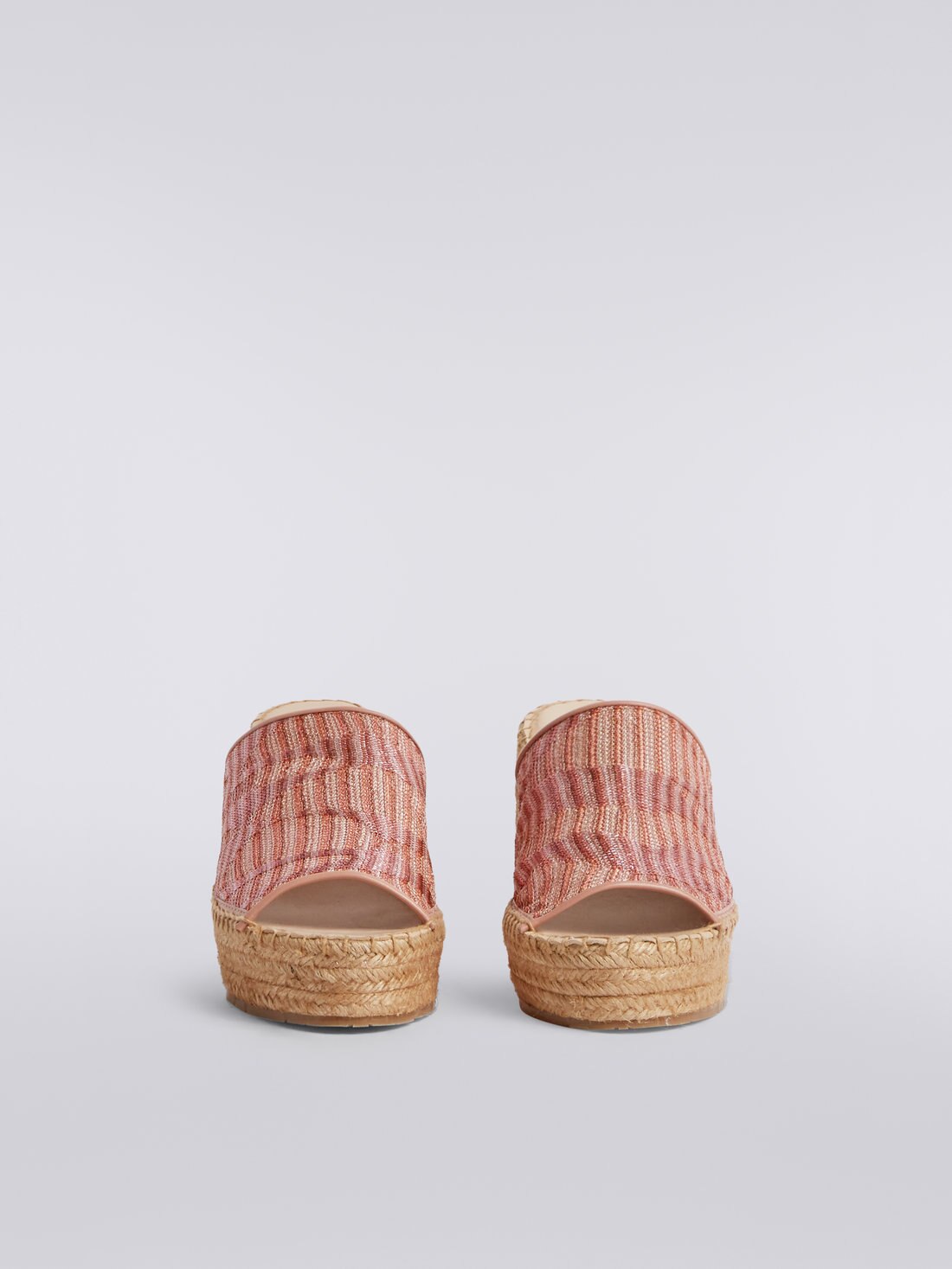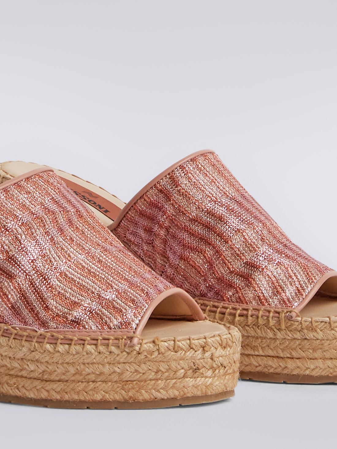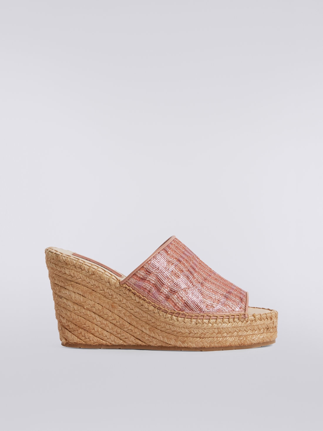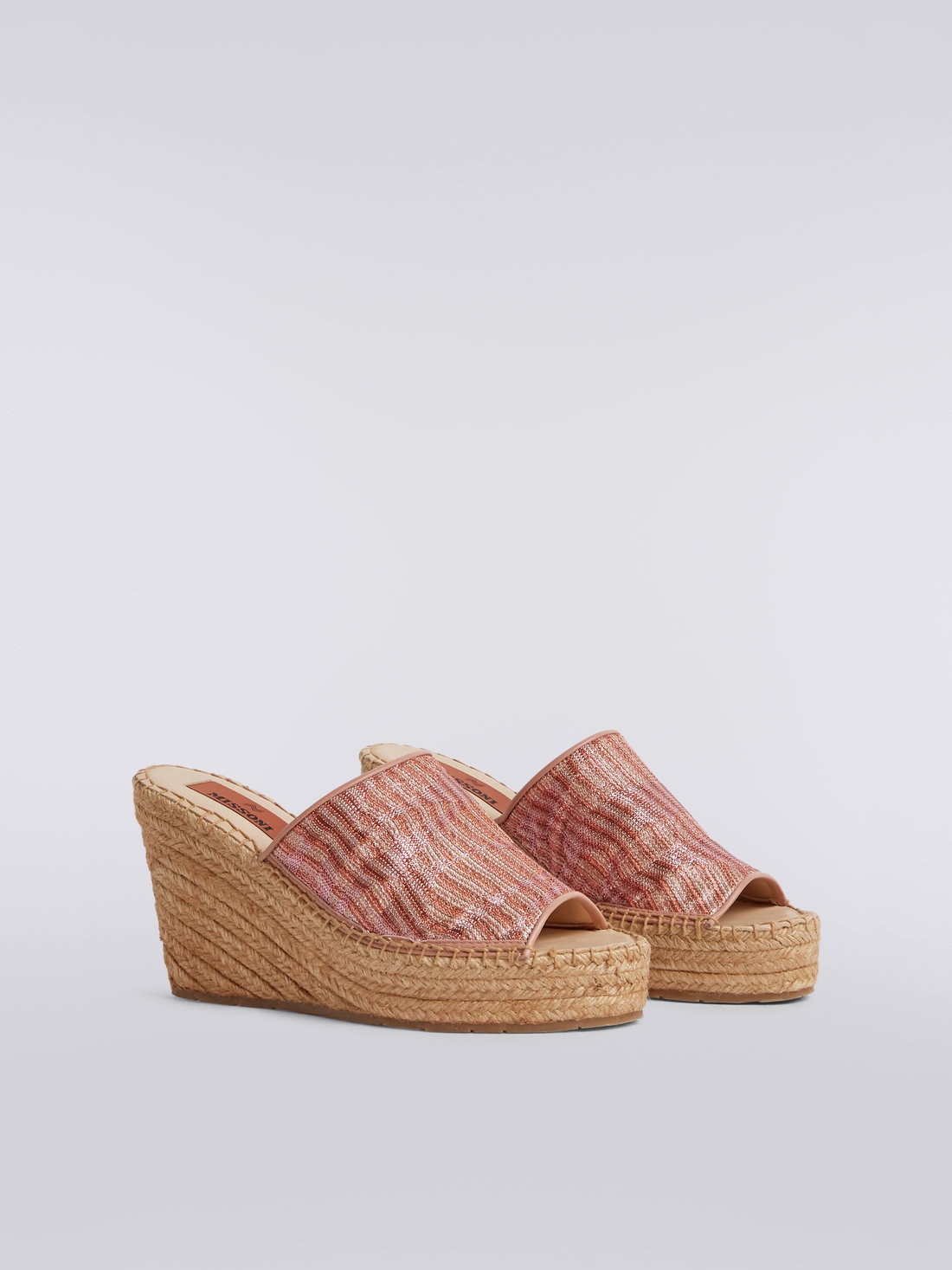 Espadrilles, summer footwear par excellence, are for Missoni the perfect test-bed for experimenting with its unmistakable touch in new areas. The woven rope wedge piece features a chevron fabric upper with lamé jacquard knit.
