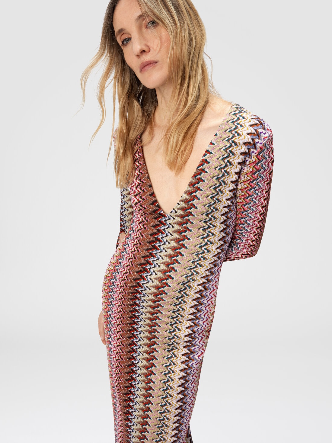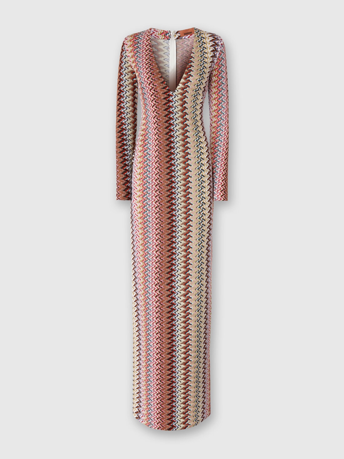 An ode to Missoni’s craftsmanship, this women’s long dress embodies the art of contemporary luxury. Featuring a deep V-neck and long sleeves, it’s made from precious raschel viscose-blend knit enriched with lamé threads. The classic zigzag motif brings rhythm and motion to this elegant and magnetic piece.