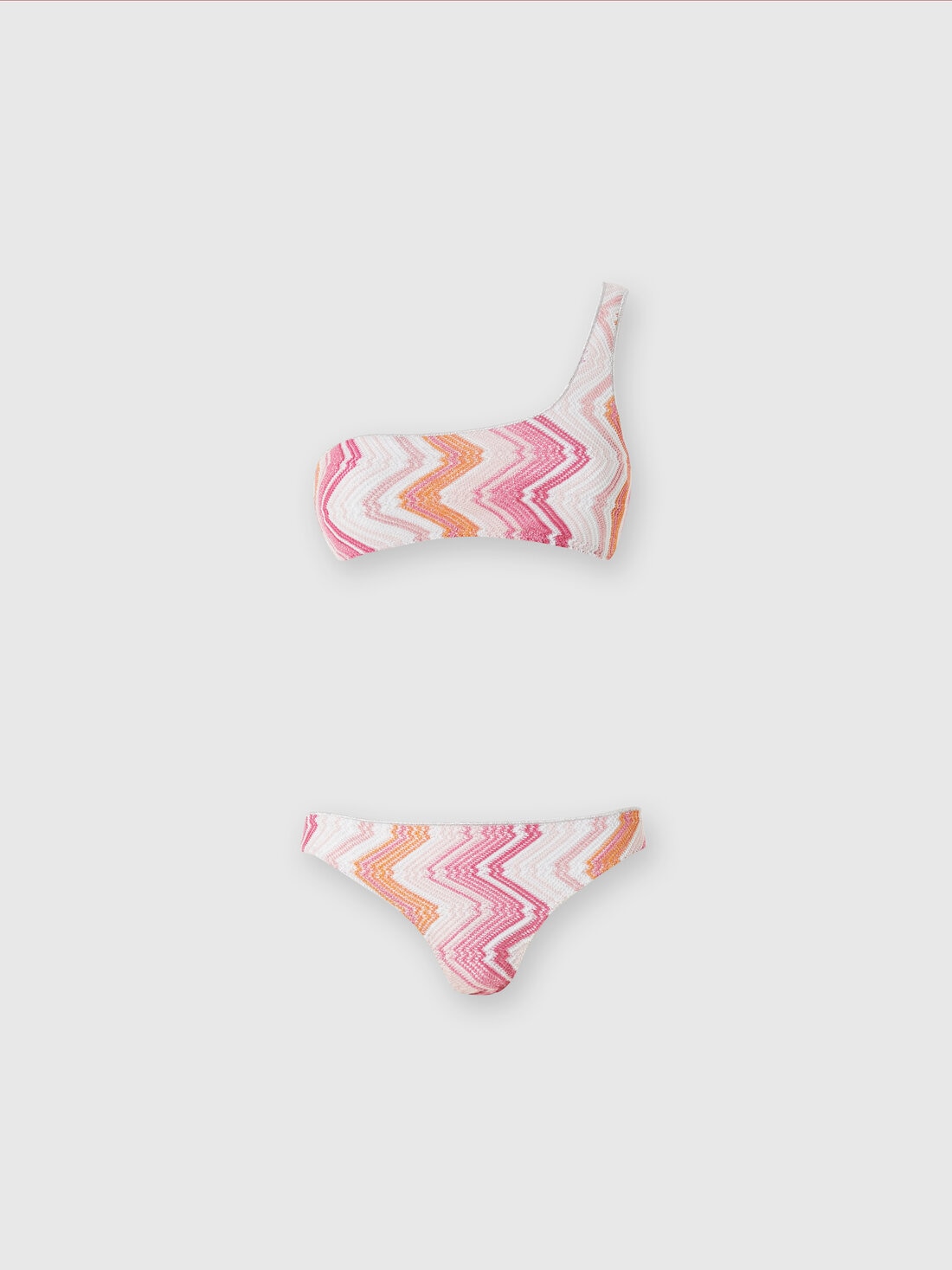 The chevron viscose blend bikini with lurex is an enchanting expression of style and sophistication. Composed of a one-shoulder bra and classic briefs, it is made of viscose-blend knit enriched with lurex threads that give a bright and seductive effect.